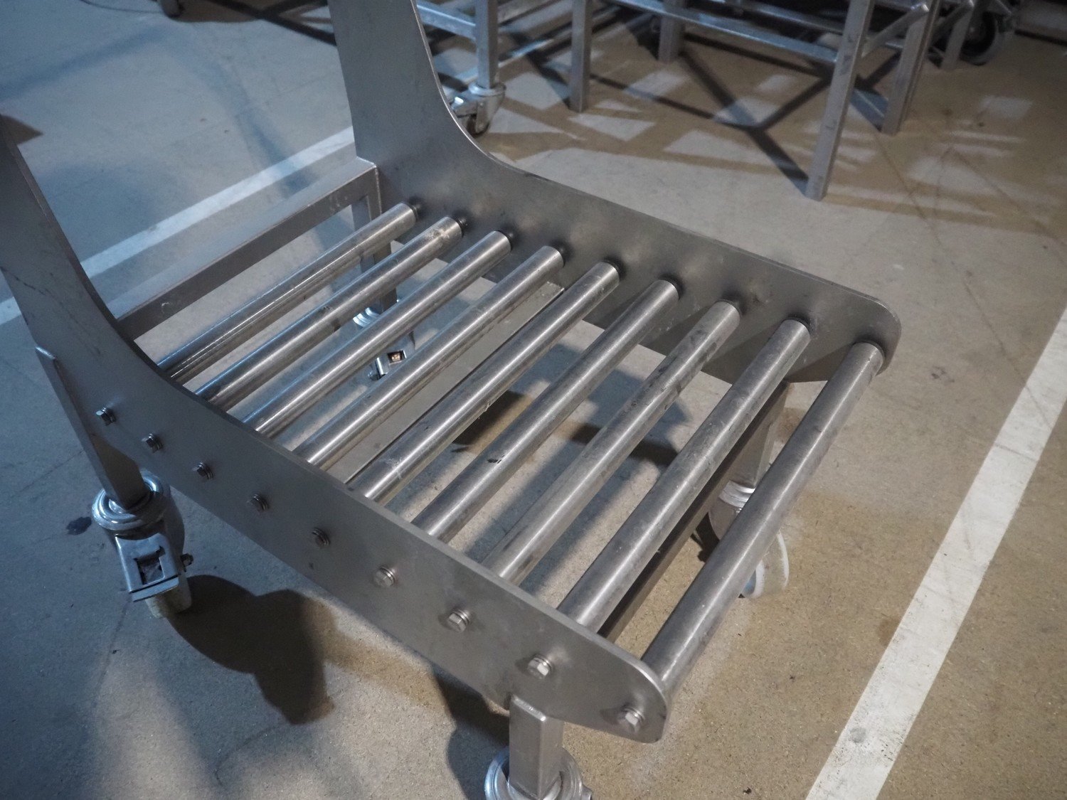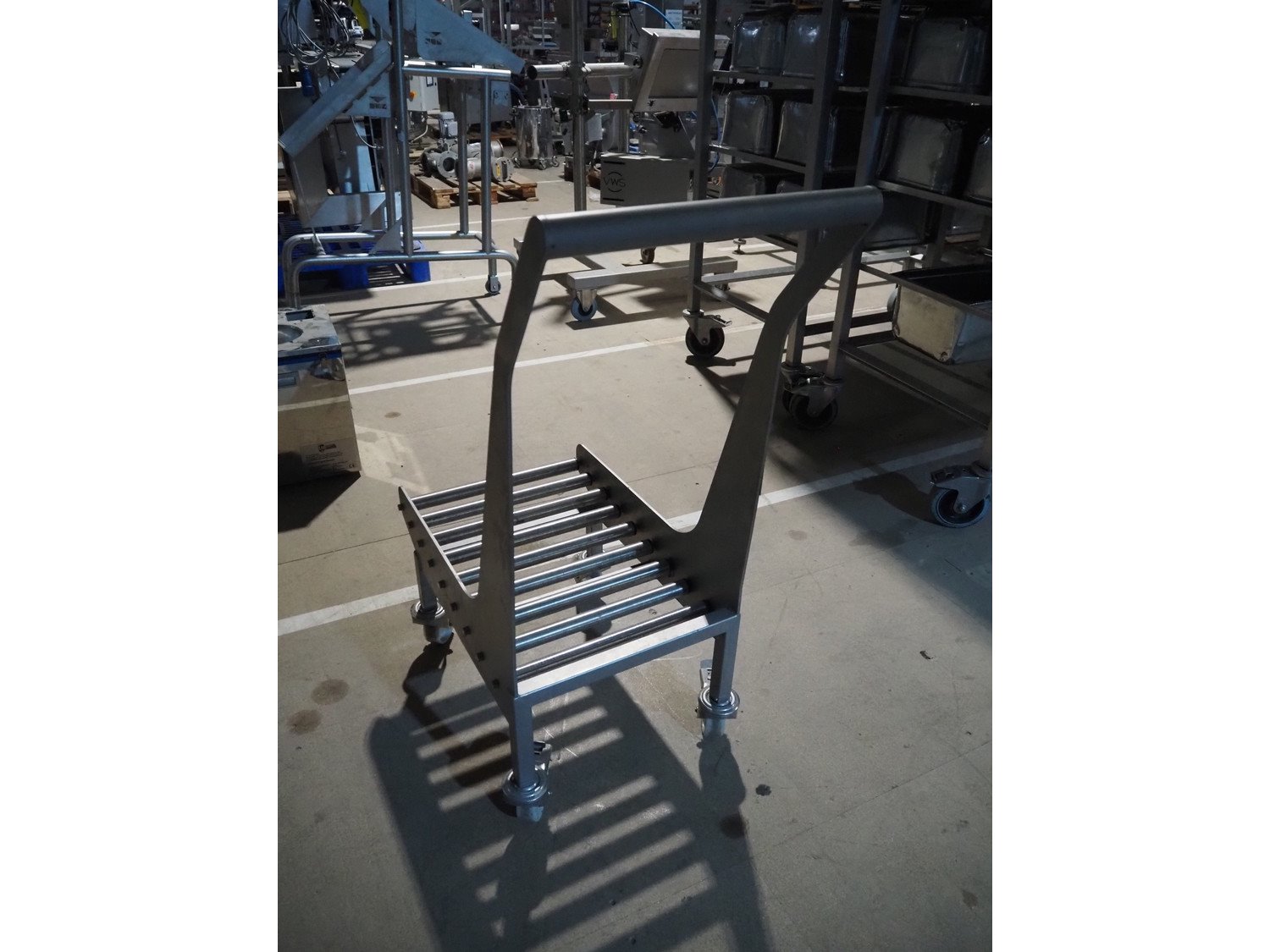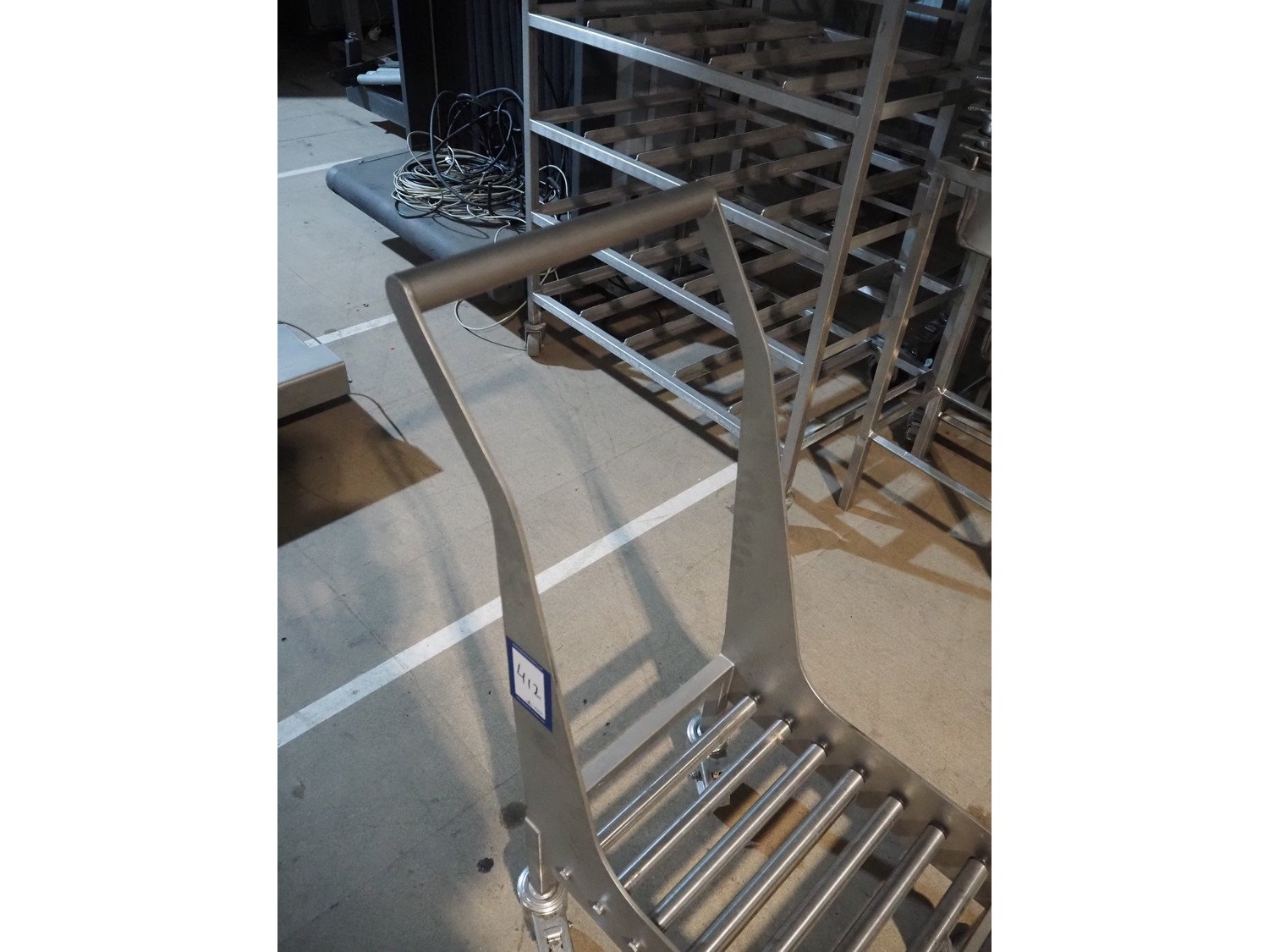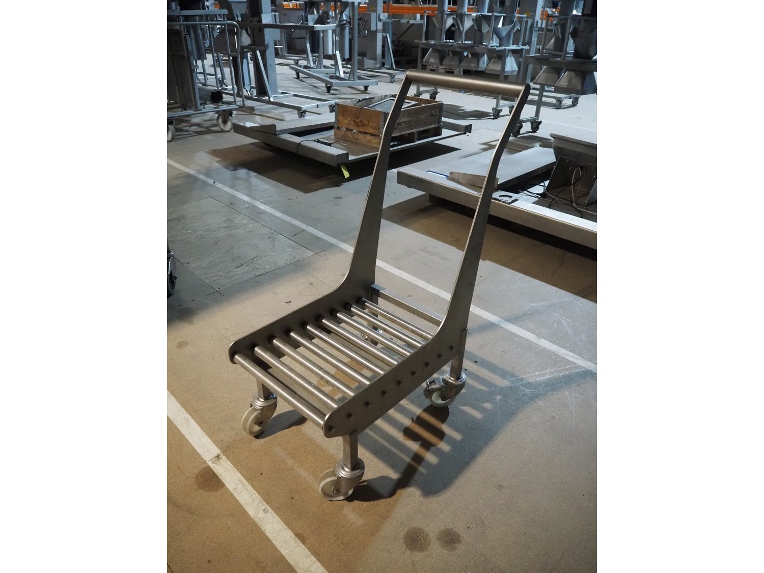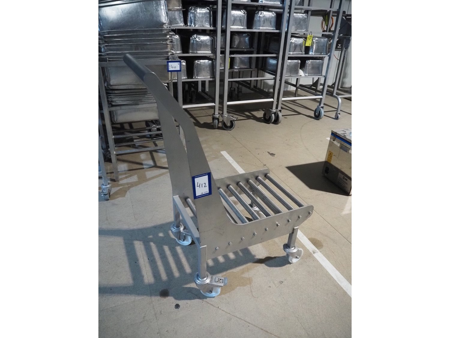 S/s trolley with s/s rollers, roller width: 385 mm, total dimensions: 800 mm x 420 mm x 1060 mm. Kavel locatie: Amfoor 6, 4421 SE Kapelle, Nederland