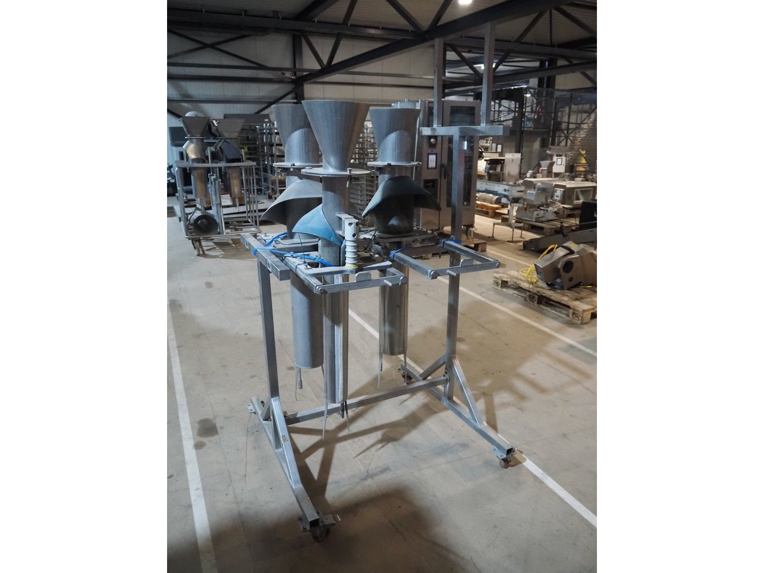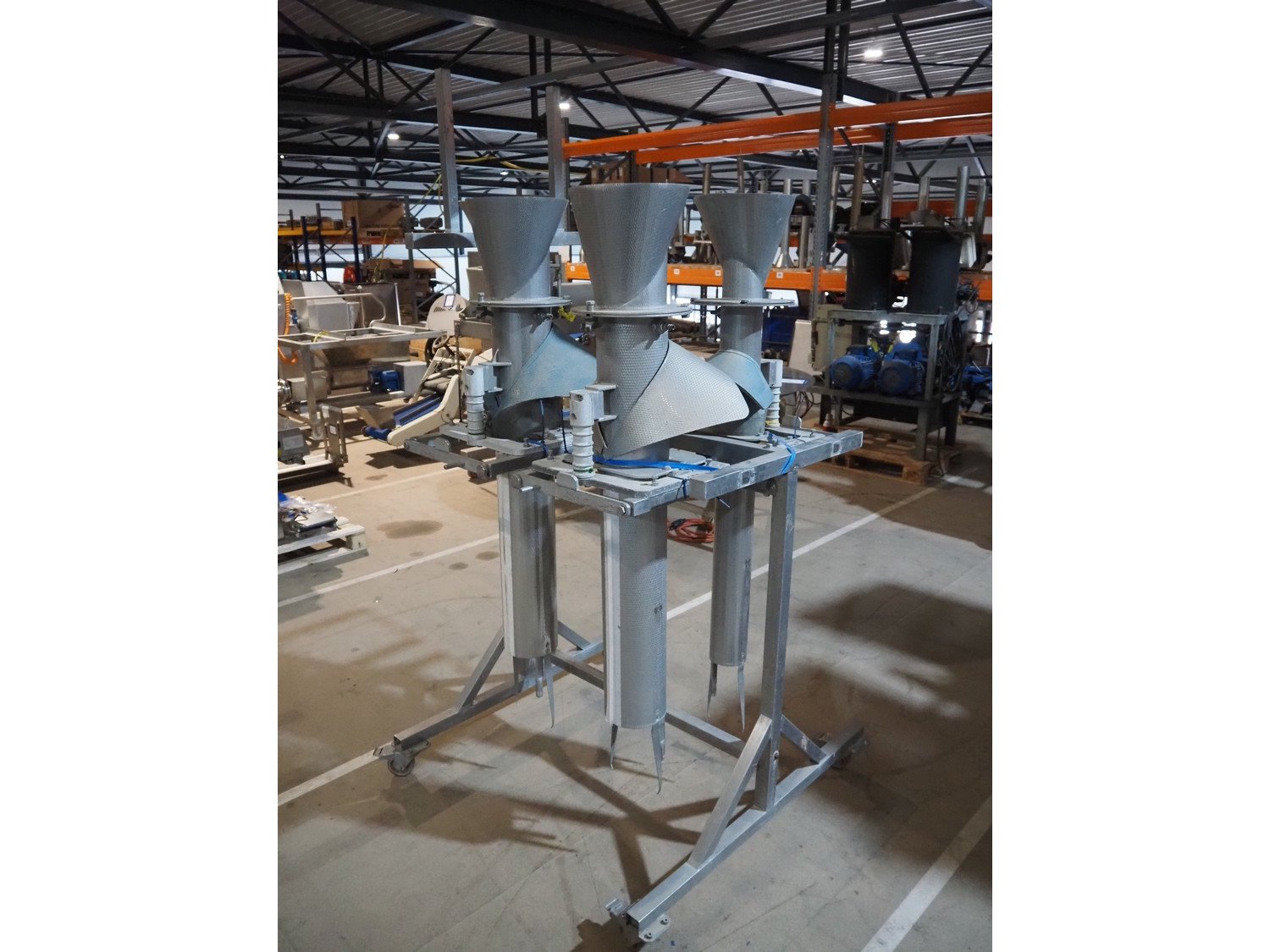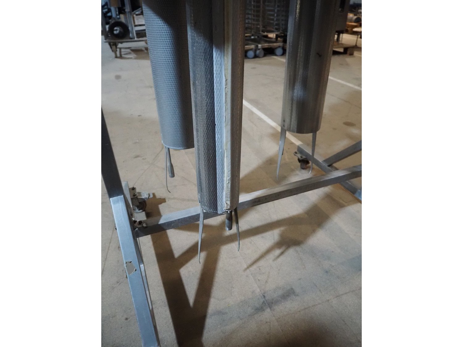 S/s trolley with 3 s/s filling pipes, clearane pipe dimensions: (2x) Ø 155 mm and Ø 100 mm, dimensions trolley: 1000 mm x 1000 mm x 1980 mm. Kavel locatie: Amfoor 6, 4421 SE Kapelle, Nederland