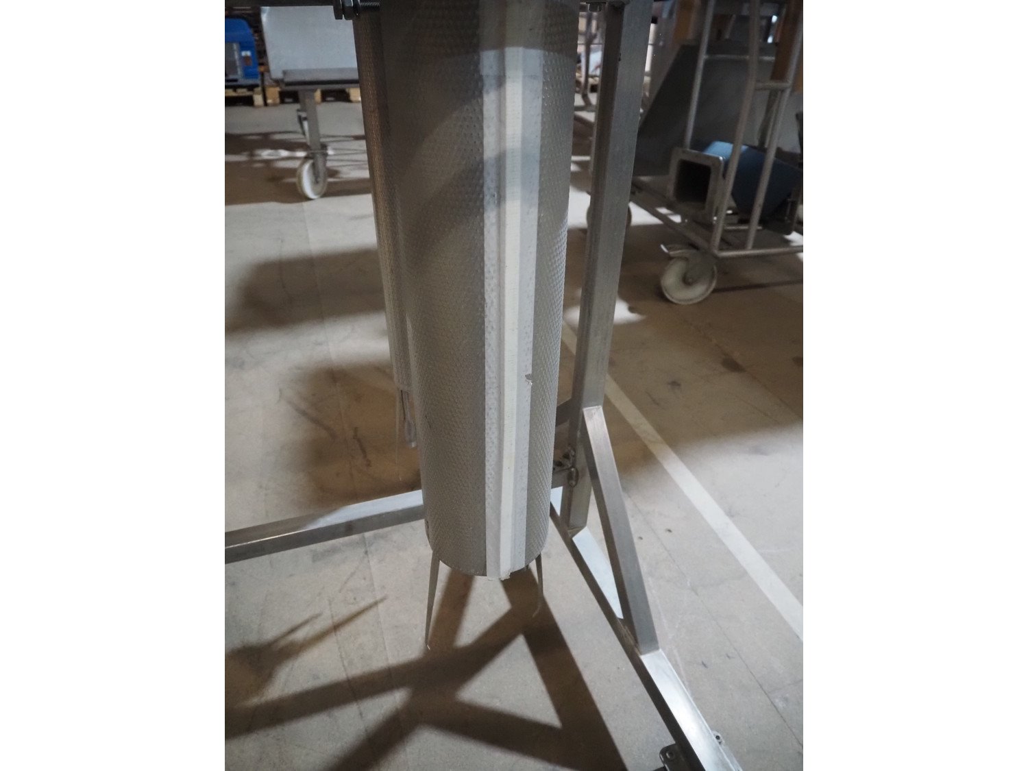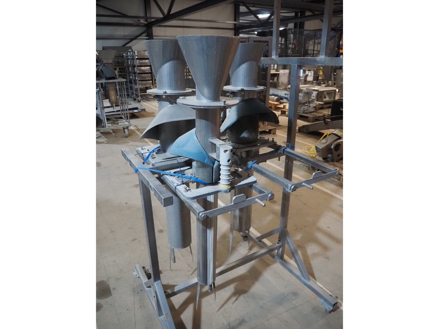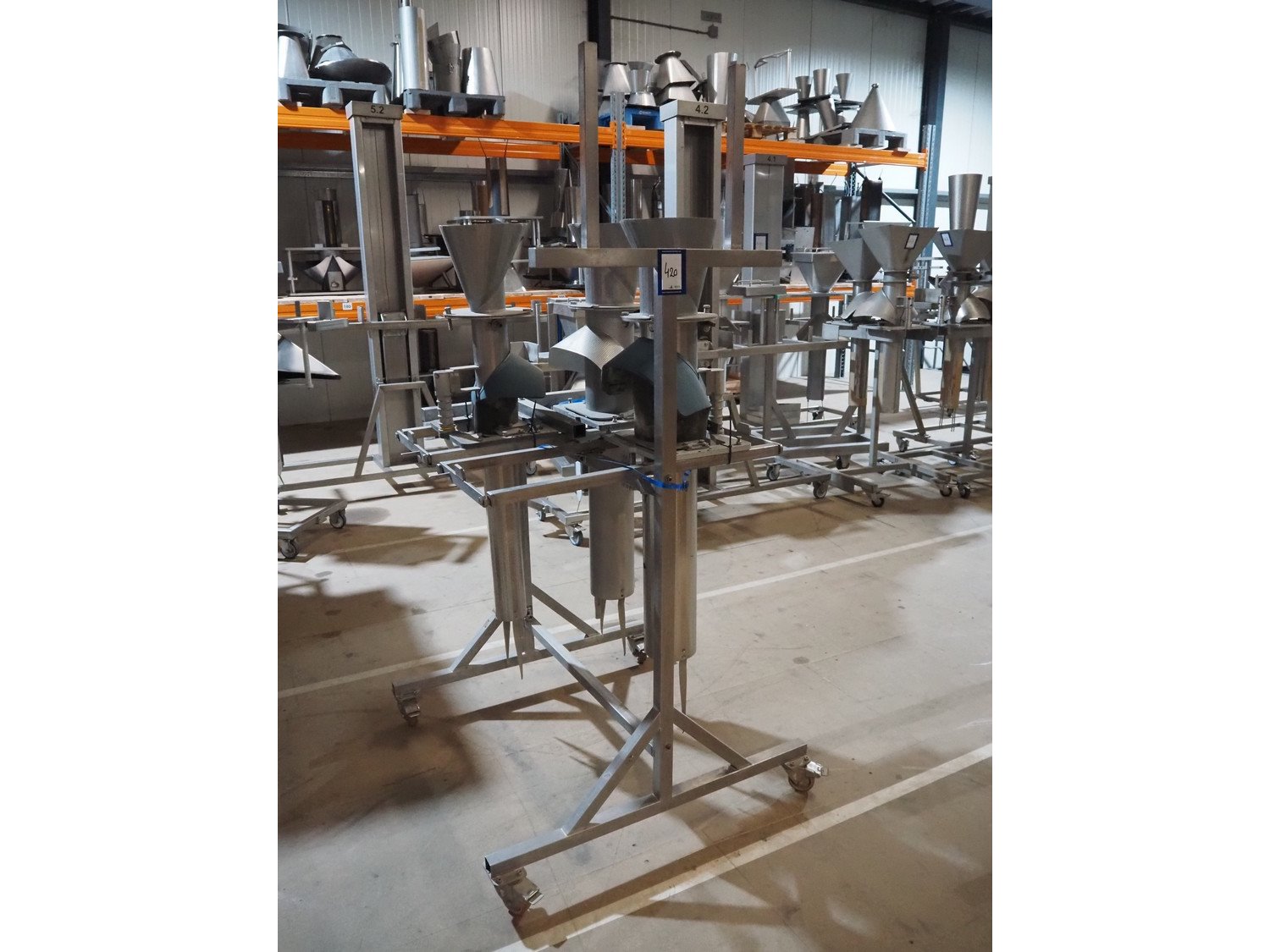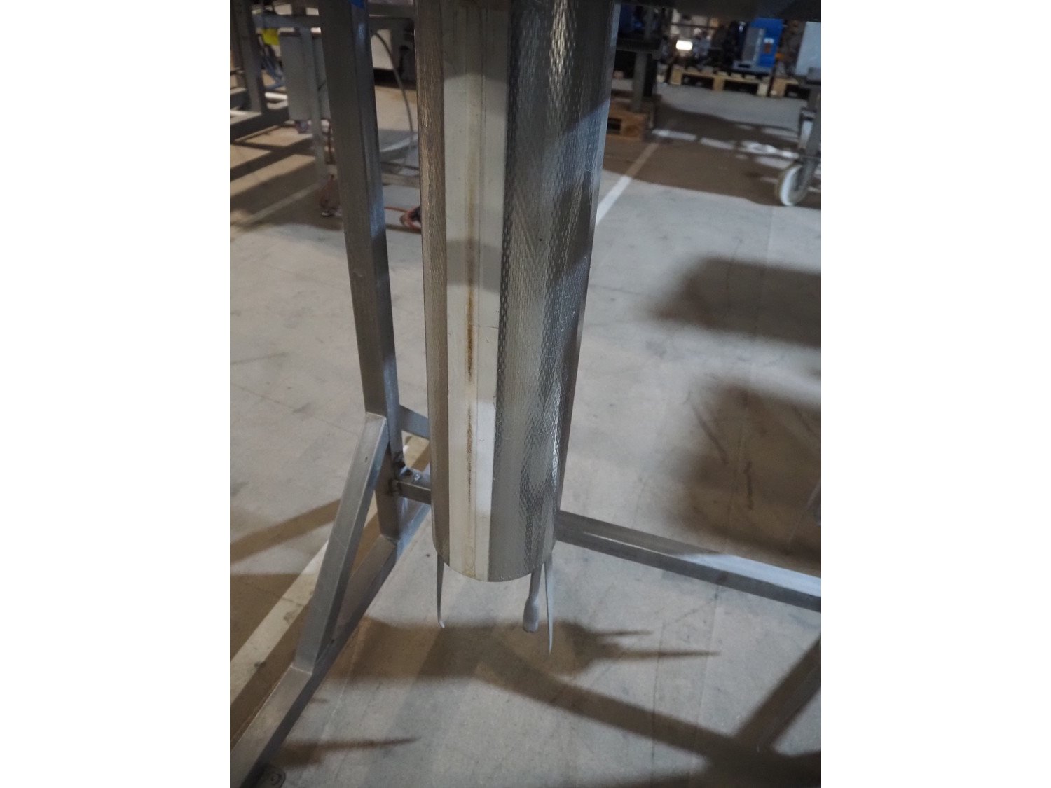S/s trolley with 3 s/s filling pipes, clearane pipe dimensions: (2x) Ø 155 mm and Ø 100 mm, dimensions trolley: 1000 mm x 1000 mm x 1980 mm. Kavel locatie: Amfoor 6, 4421 SE Kapelle, Nederland