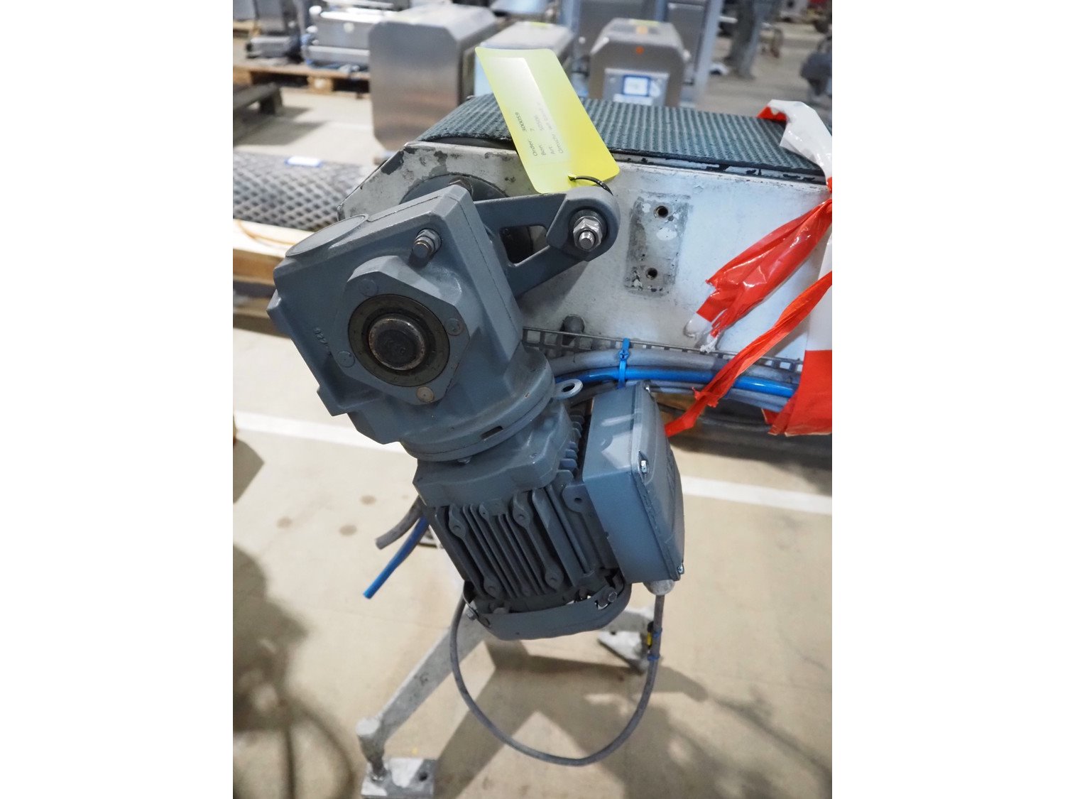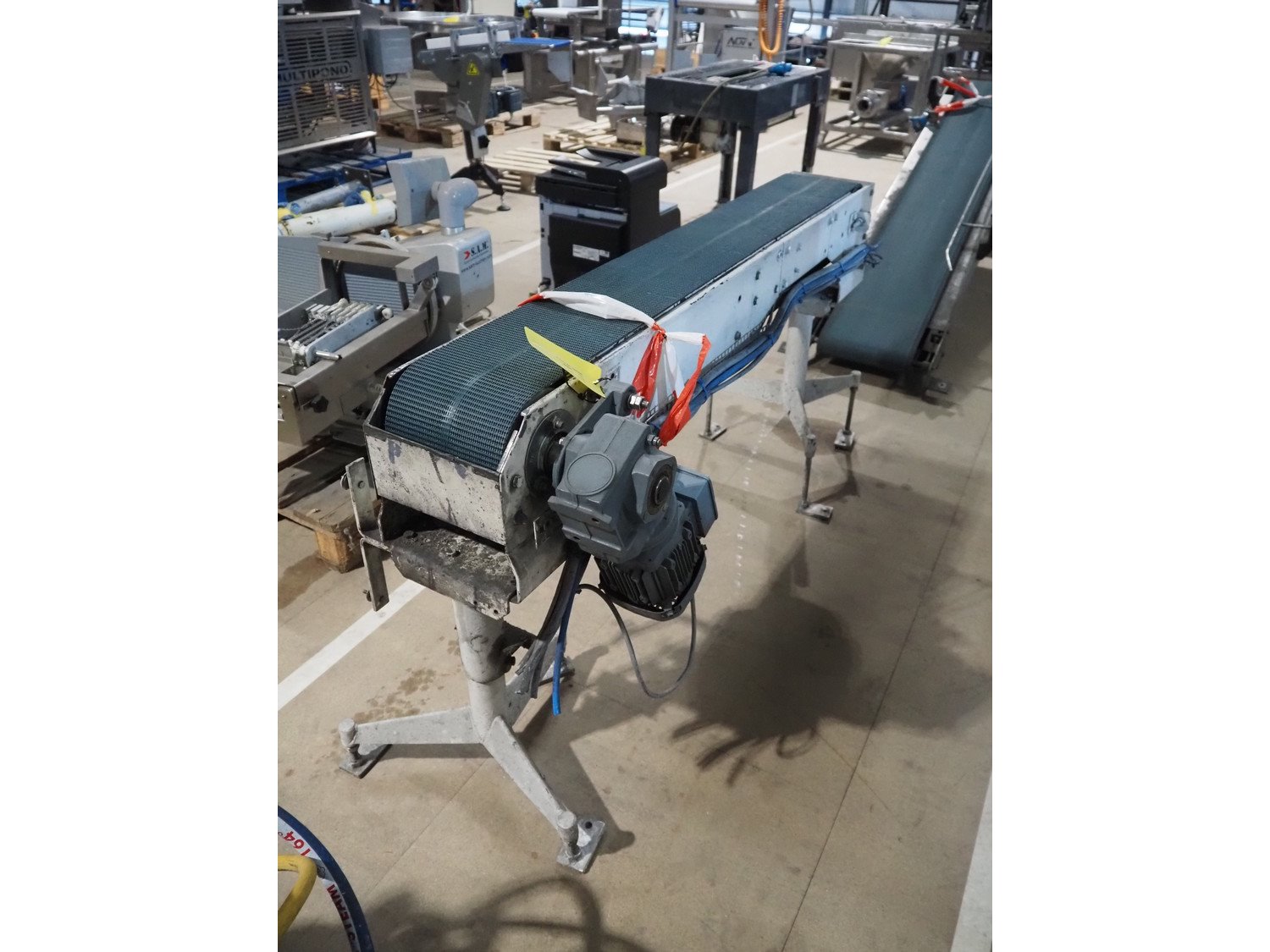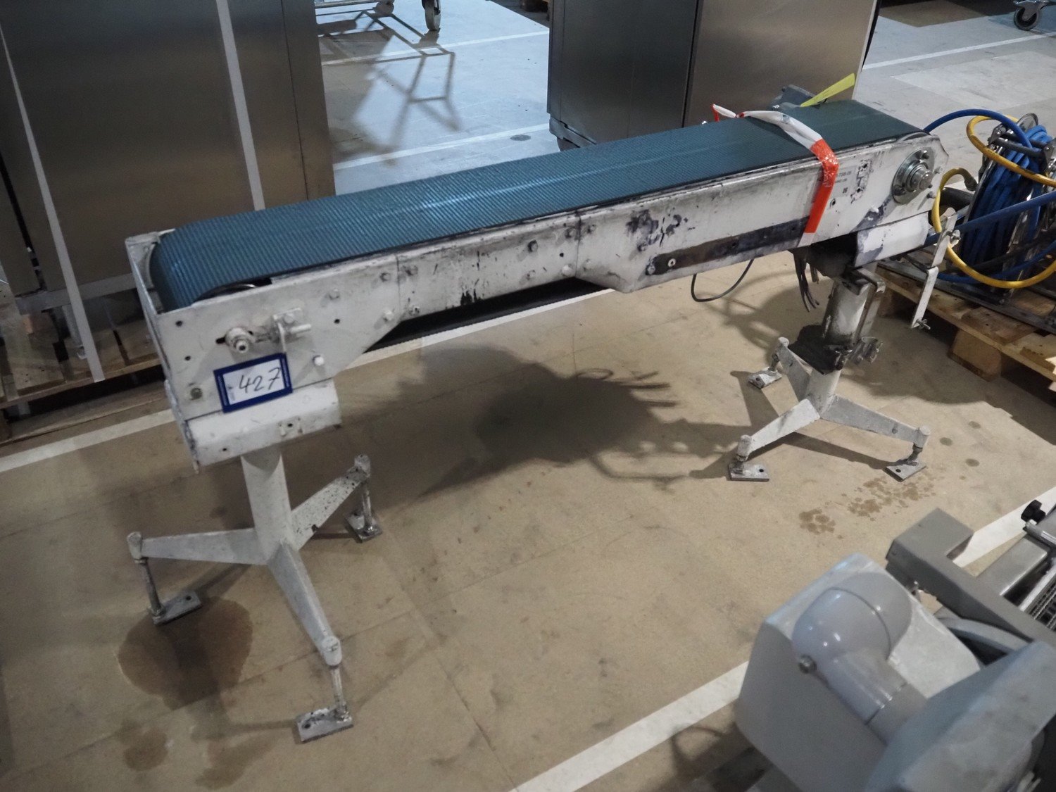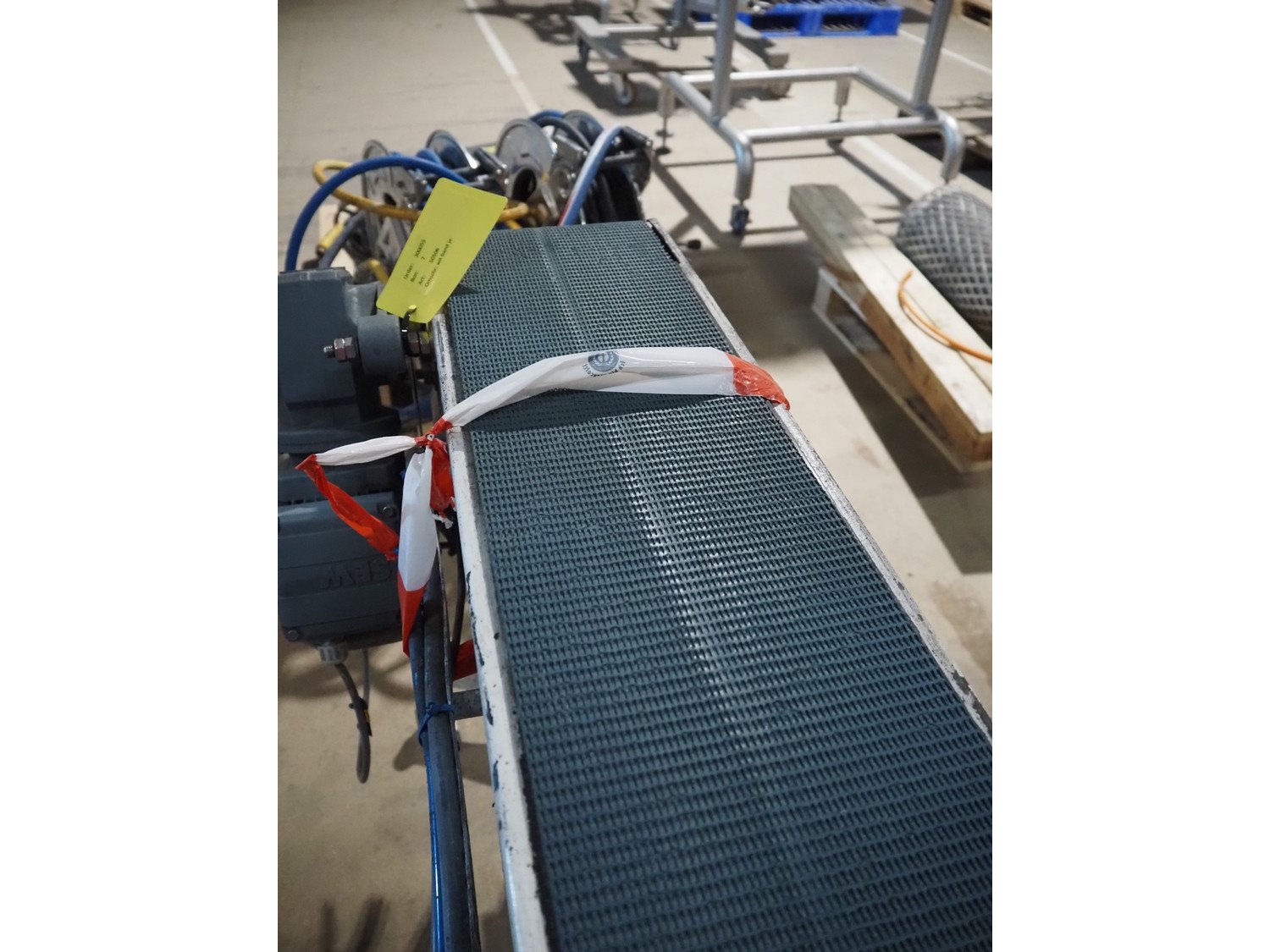 Transport belt, steel frame, plastic belt, belt width: 190 mm, total dimensions: 1500 mm x 420 mm x 800 mm. Kavel locatie: Amfoor 6, 4421 SE Kapelle, Nederland
