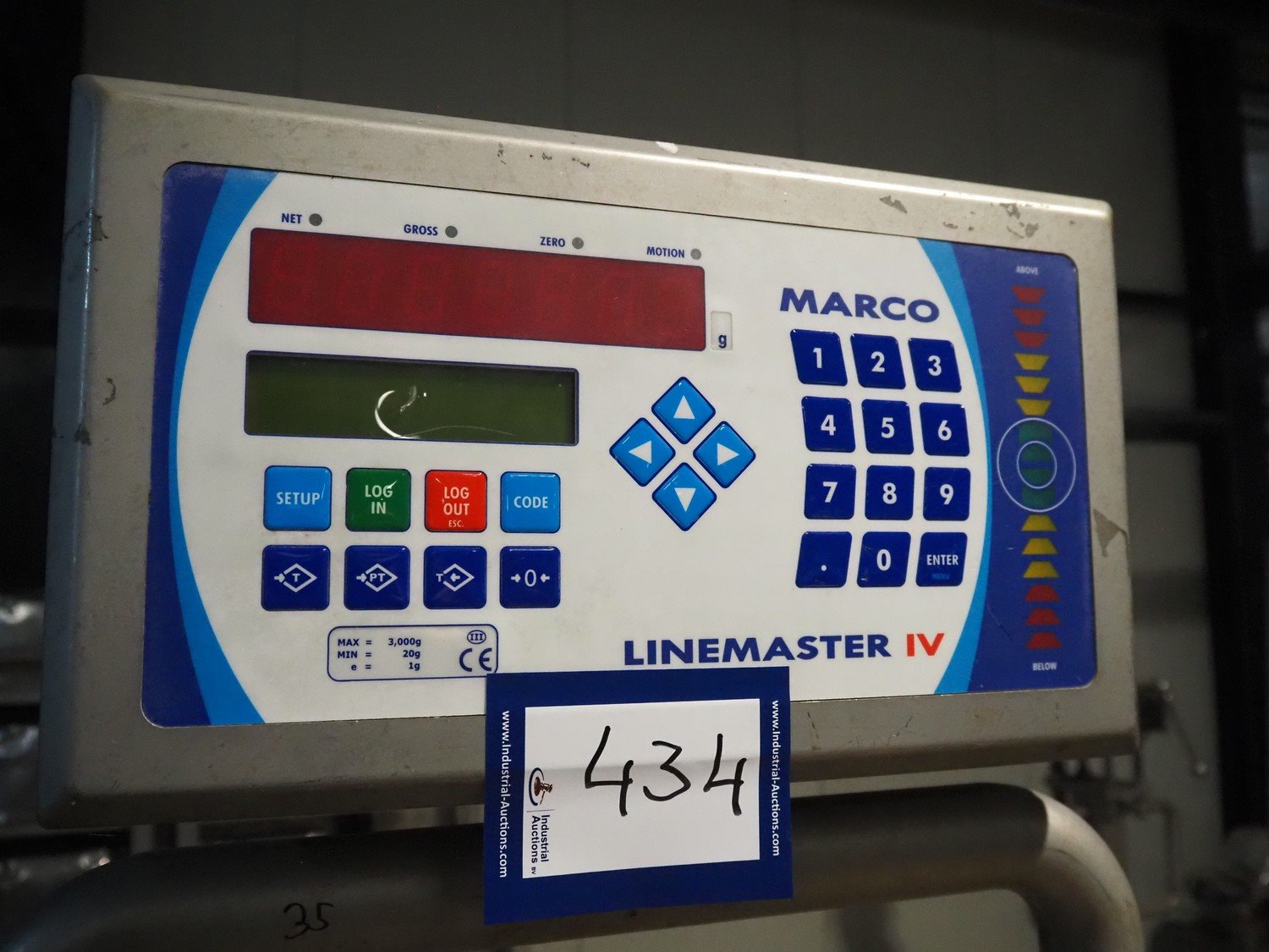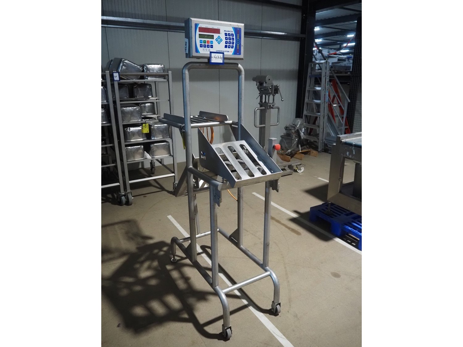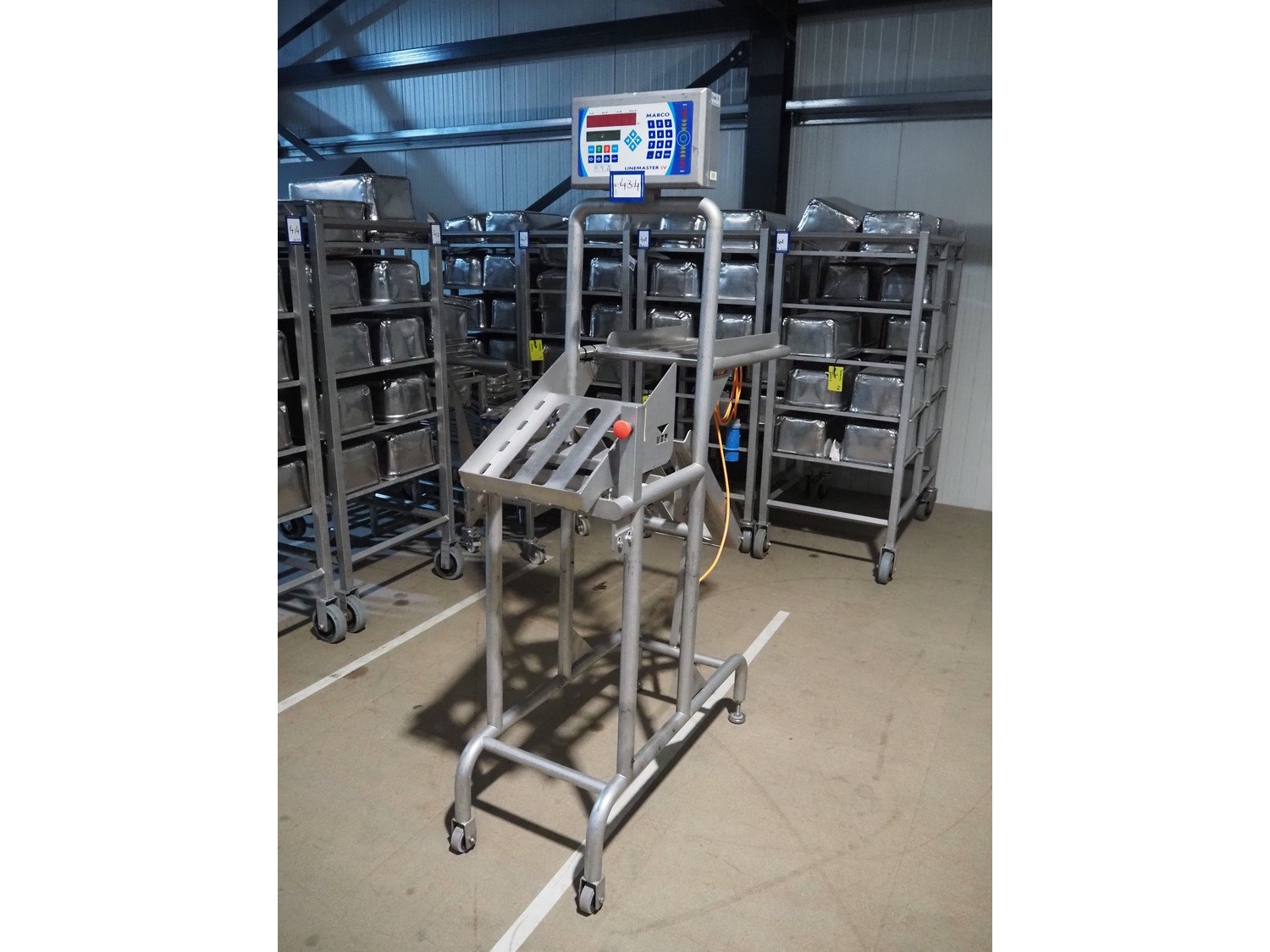 Marco weighing scale for crates on s/s frame, model: LINEMASTER IV, serial number: 185131, 100-240 VAC, maximum weight: 20000 gram, minimum weight: 20 gram, e= 1 gram, clearance: 500 mm x 320 mm, total dimensions: 1130 mm x 460 mm x 1930 mm. Kavel locatie: Amfoor 6, 4421 SE Kapelle, Nederland