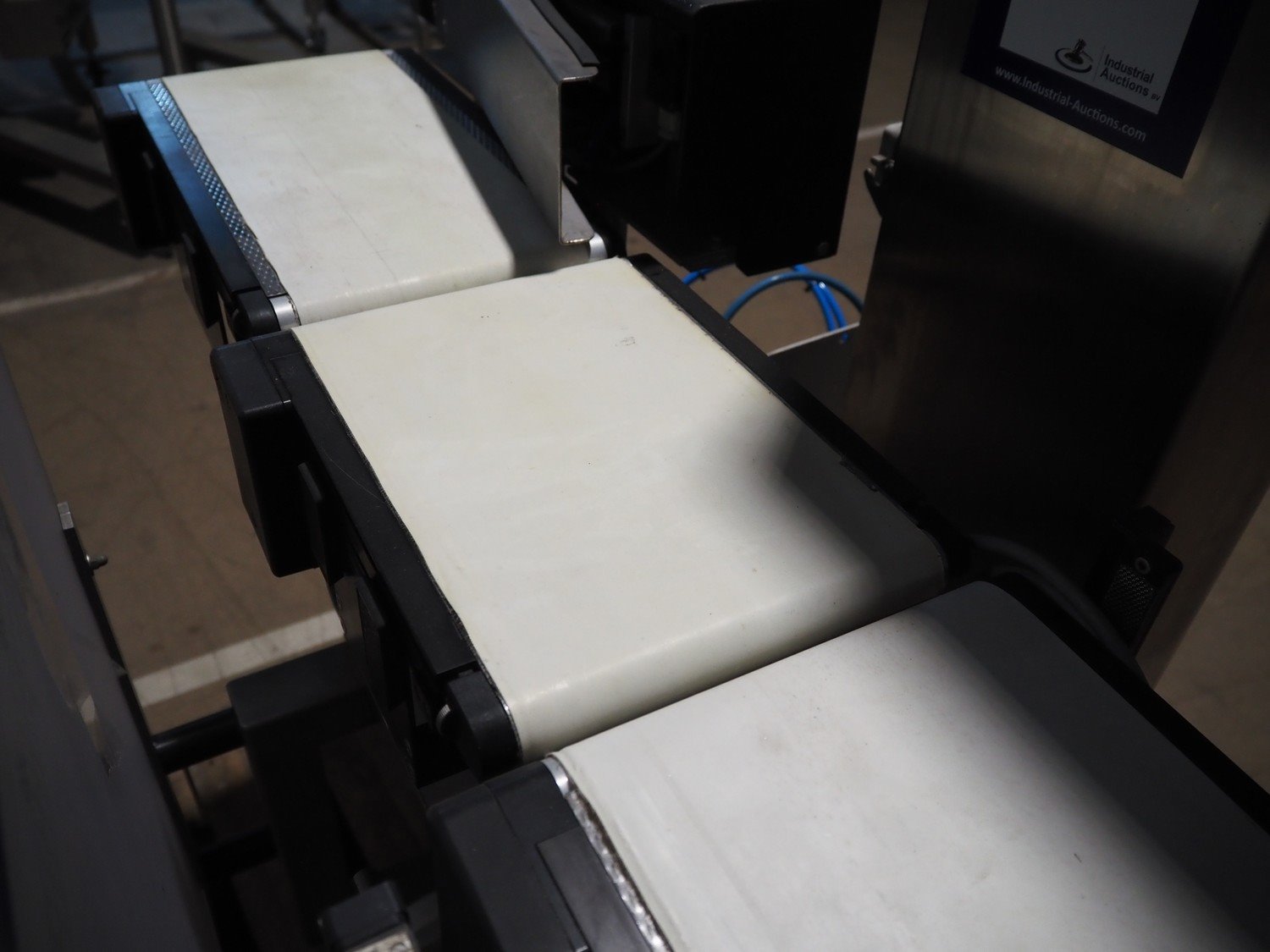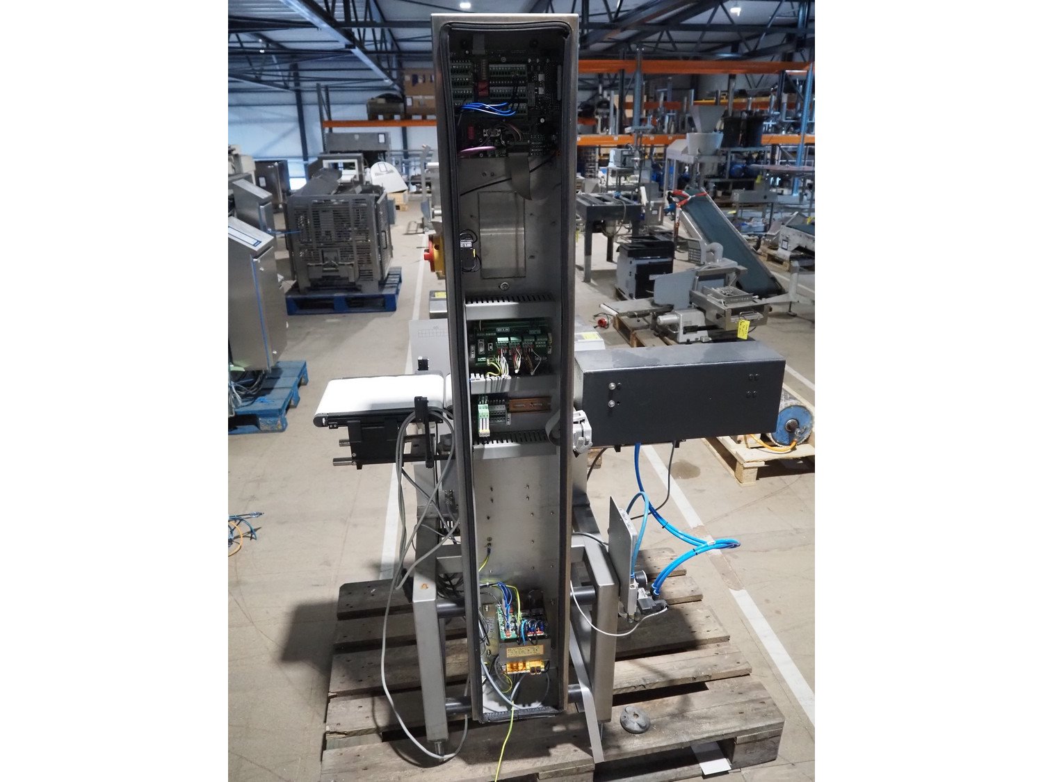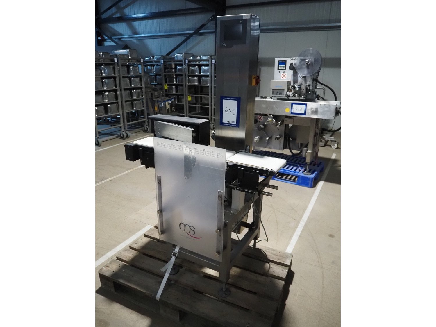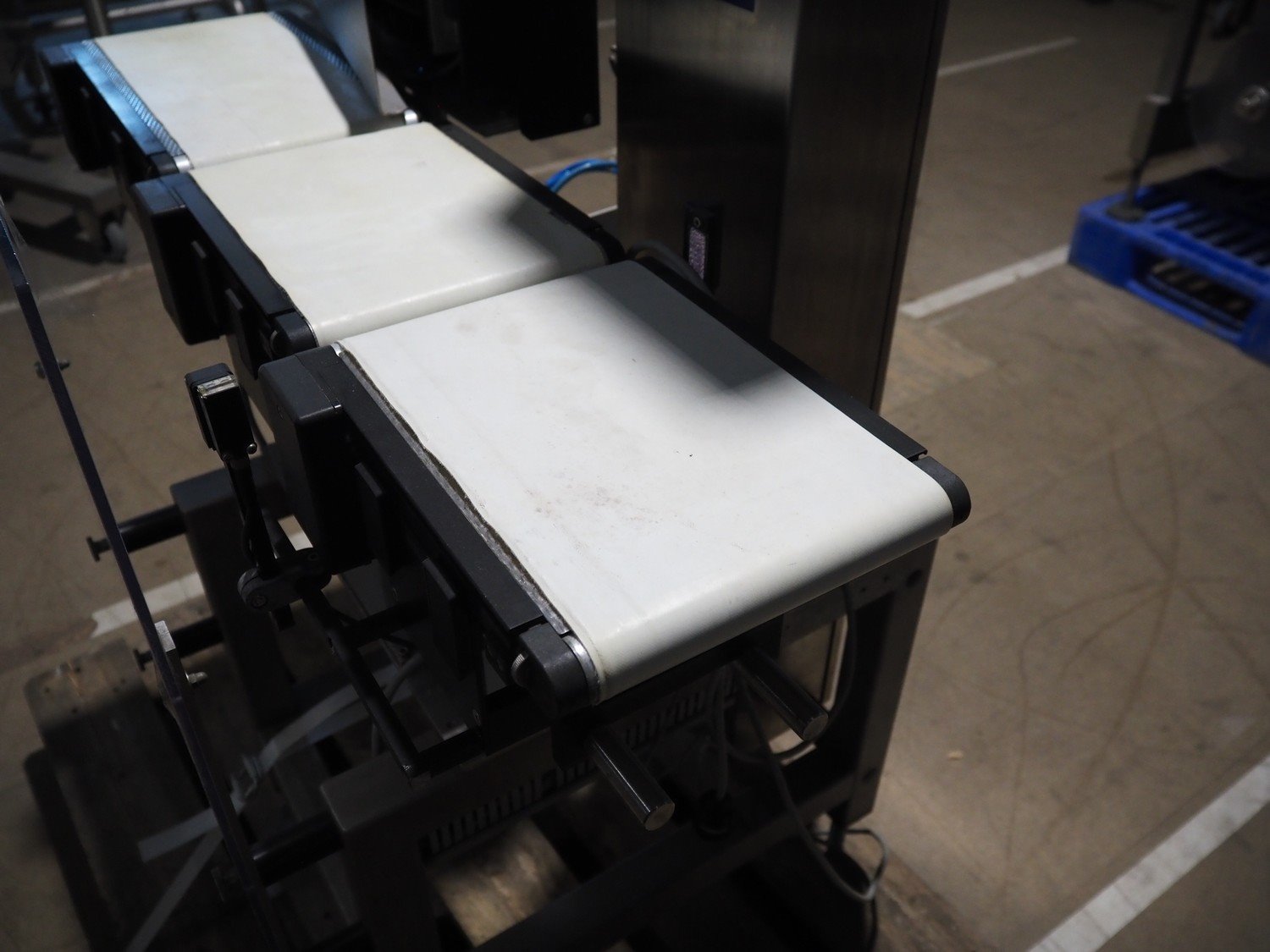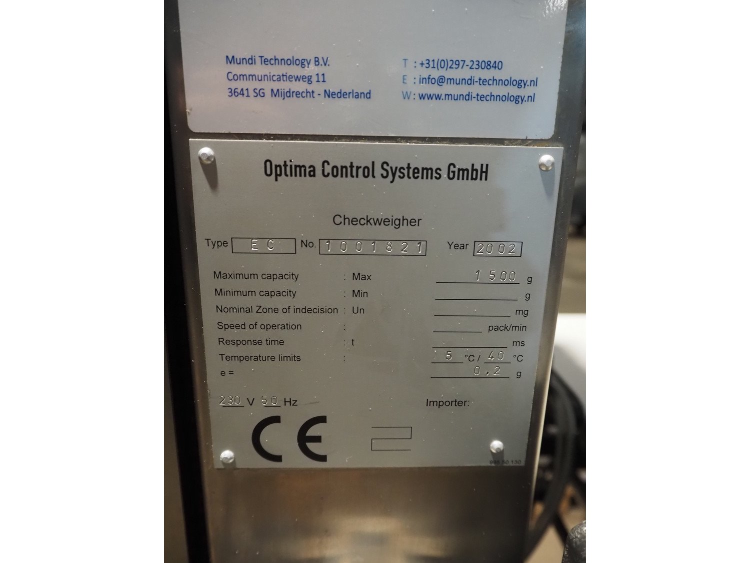 OCS checkweigher with rejector, type: EC, number: 1001821, year of construction: 2002, 230 V, 50 Hz, maximum capacity: 1500 g, e- 0.2 g, plastic belts, belt width: 175 mm, total dimensions: 1050 mm x 700 mm x 1650 mm. Kavel locatie: Amfoor 6, 4421 SE Kapelle, Nederland