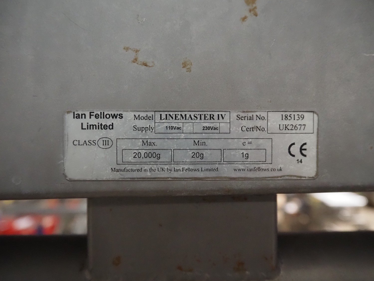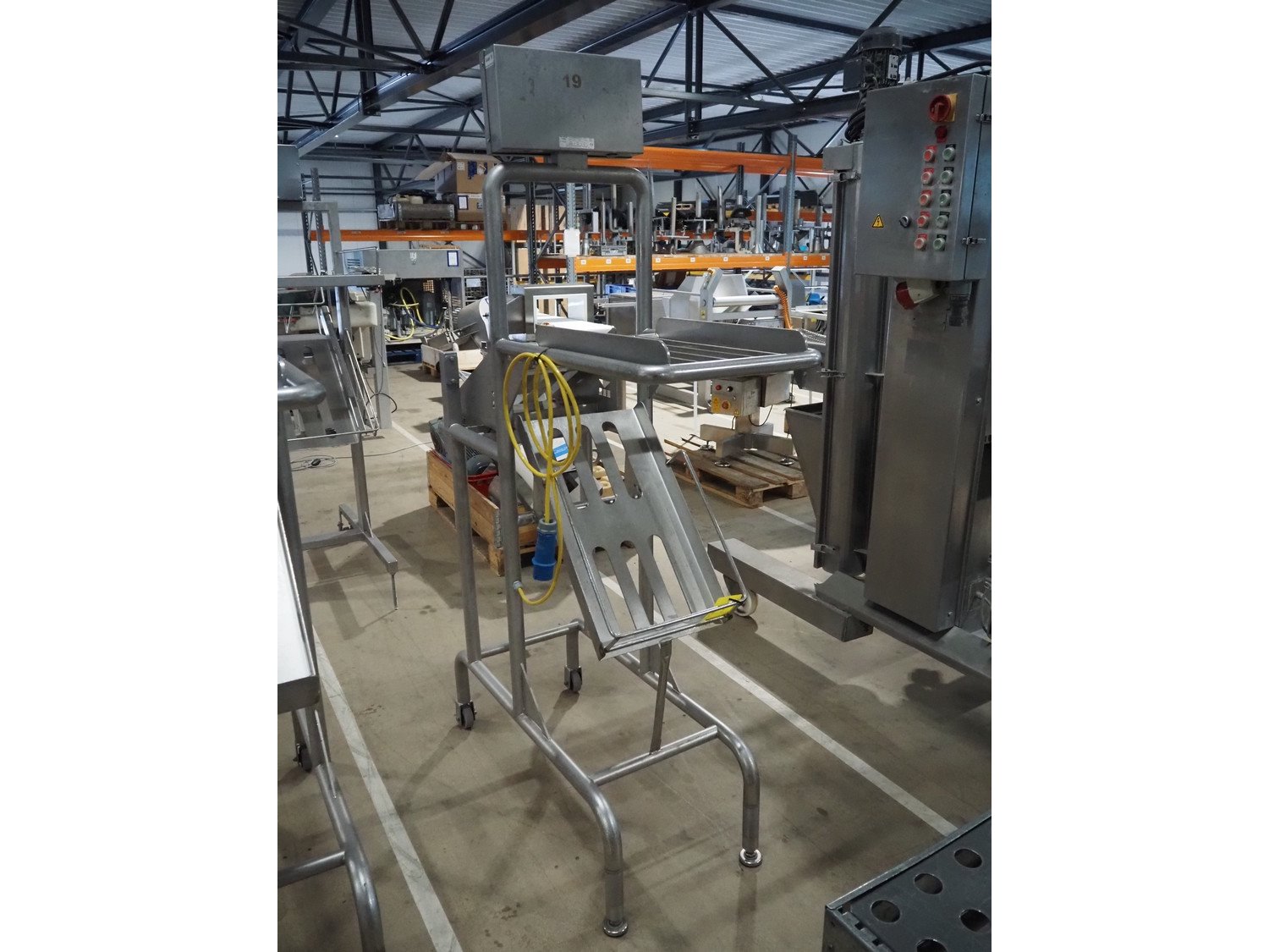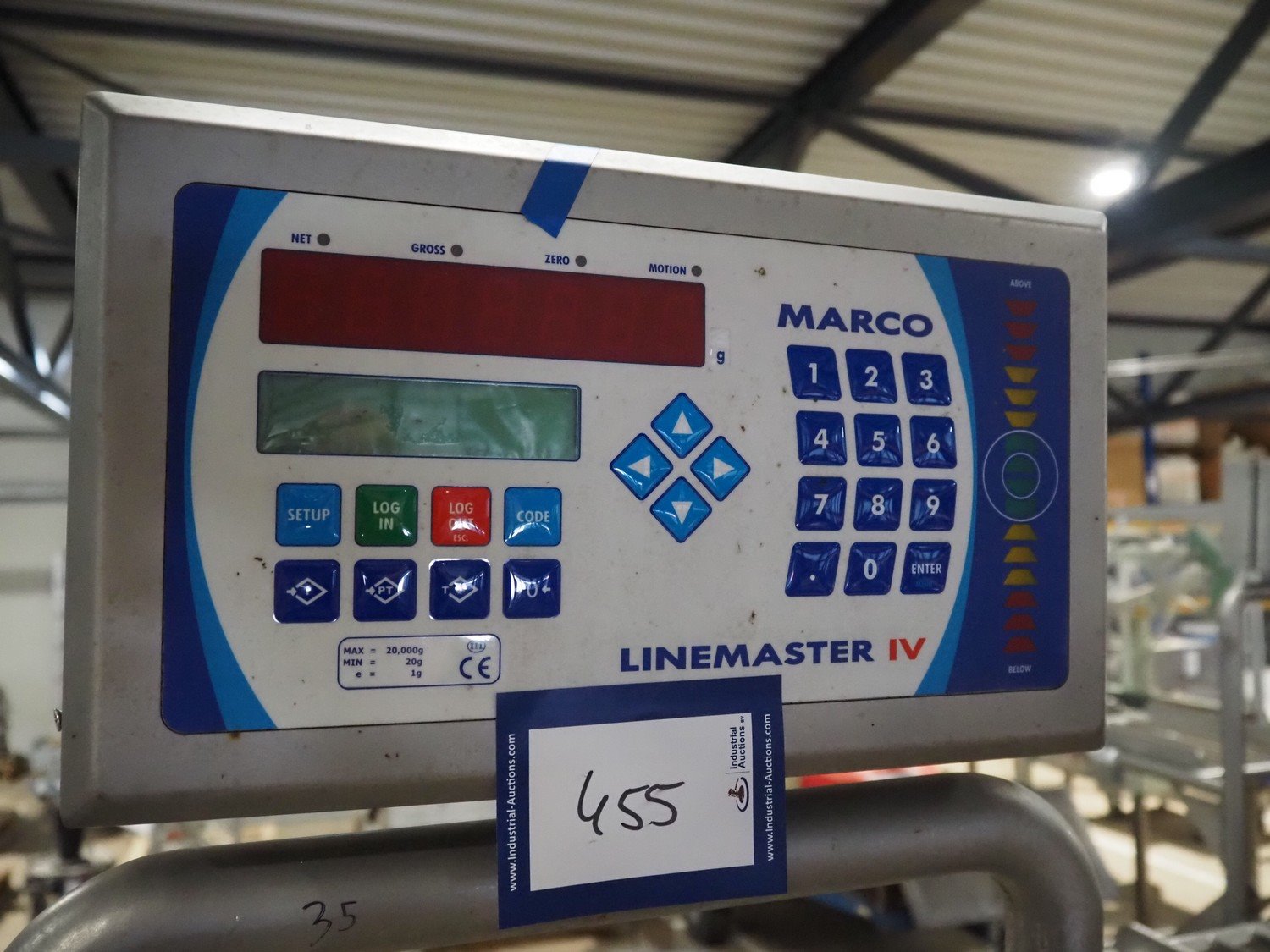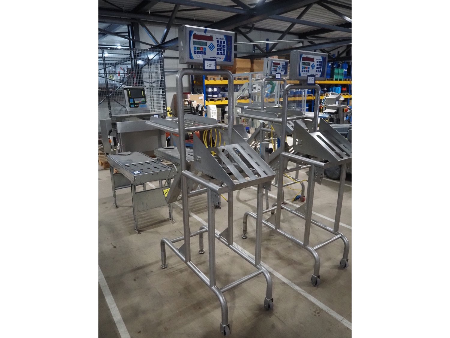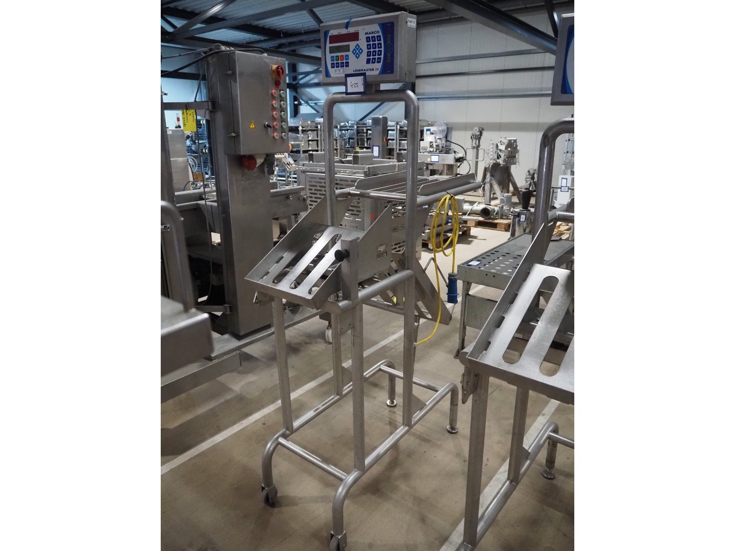 Marco weighing scale for crates on s/s frame, model: LINEMASTER IV, serial number: 185139, 100-240 VAC, maximum weight: 20000 gram, minimum weight: 20 gram, e= 1 gram, clearance: 500 mm x 320 mm, total dimensions: 1130 mm x 460 mm x 1960 mm. Kavel locatie: Amfoor 6, 4421 SE Kapelle, Nederland