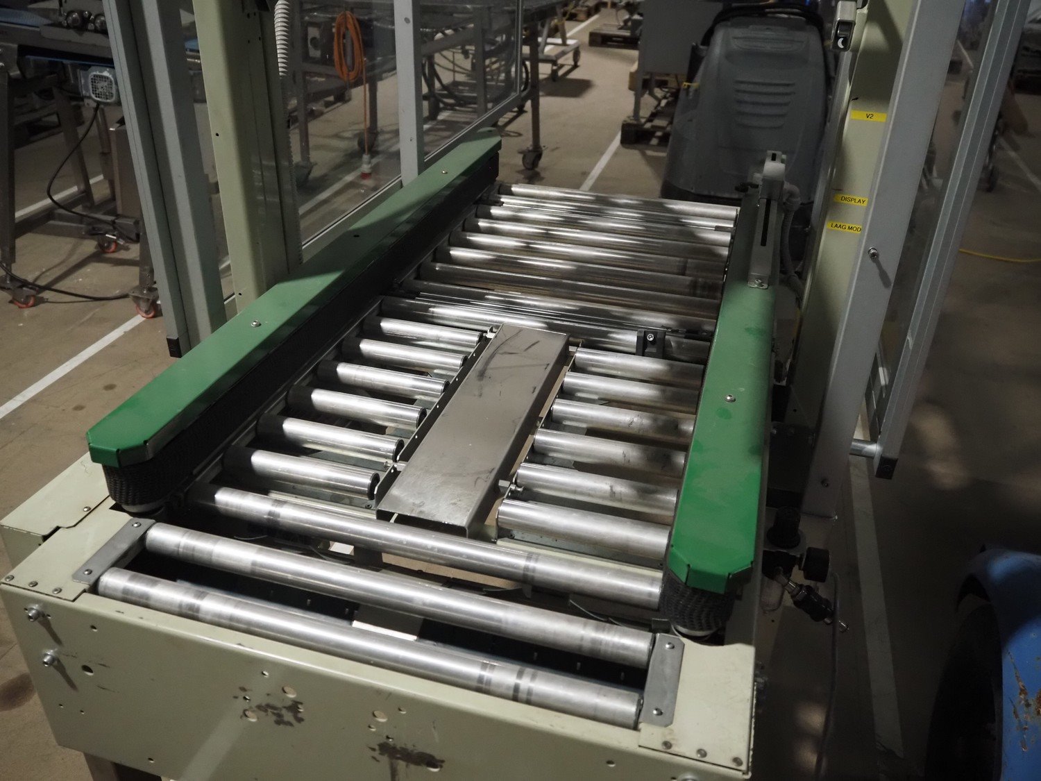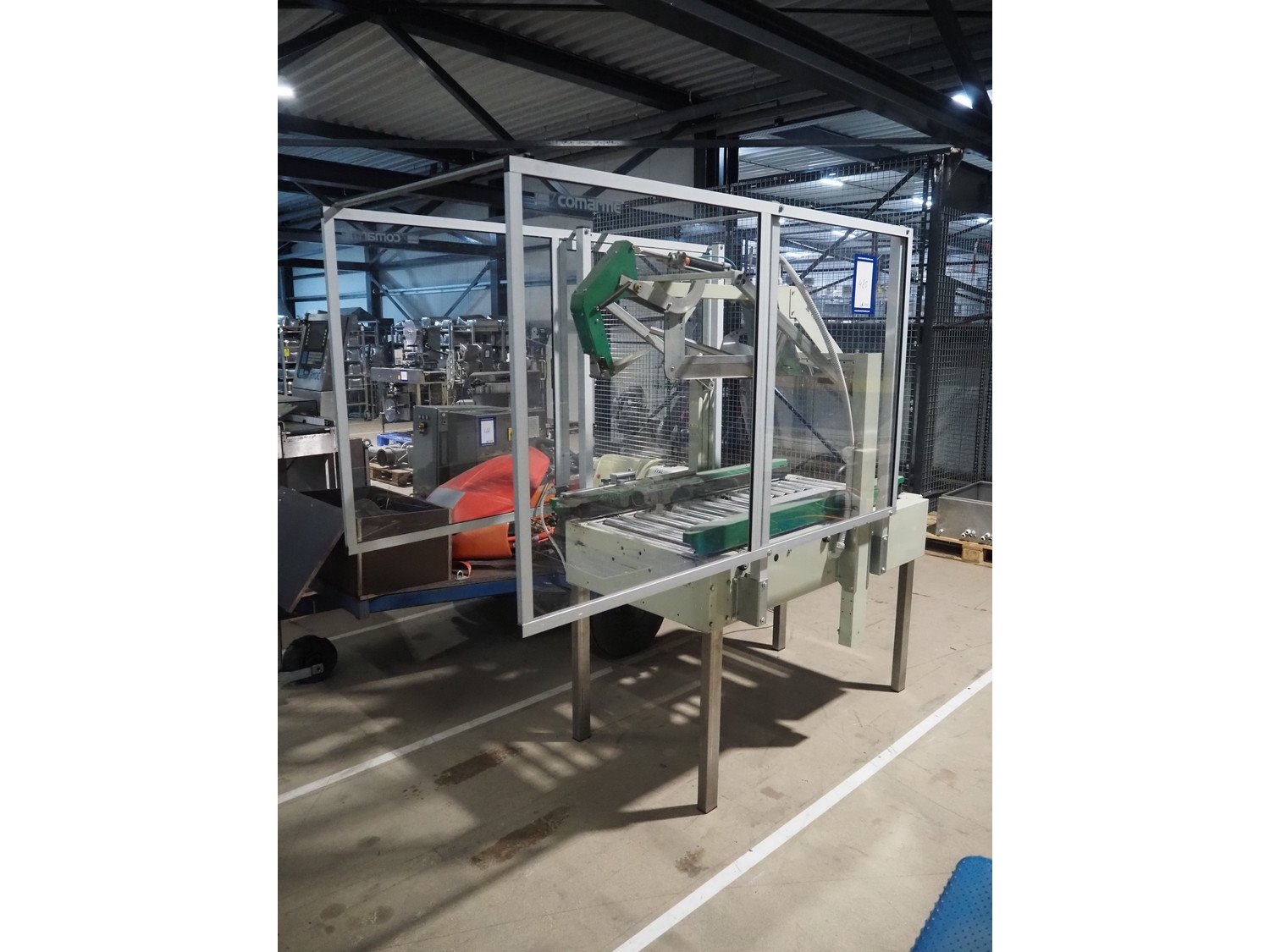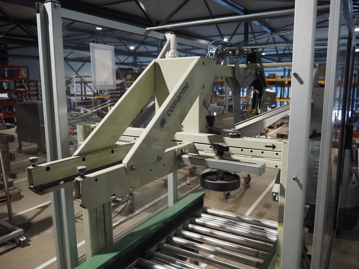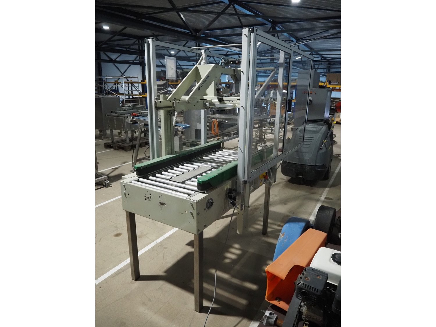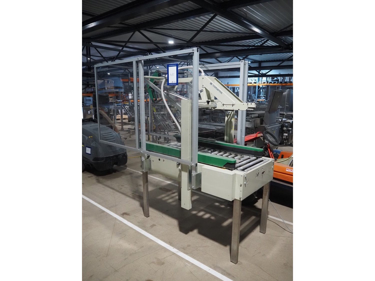 Comarme box closing machine with top taper, model: GEM-f47, serial number: AZ025815, year of construction: 2005, 400 V, 50 Hz. 1 A, 280 W, weight: 186 kg, steel rollers, roller width: 520 mm, plastic belt, belt width: 50 mm, total dimensions: 2200 mm x 980 mm x 1960 mm. Kavel locatie: Amfoor 6, 4421 SE Kapelle, Nederland