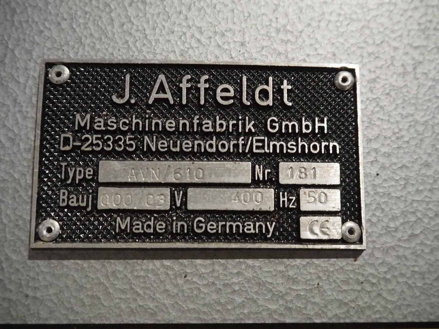 J.Affeldt net loading machine, type: AVN/610, number: 181, year of construction: 000/03, 400 V, 50 Hz, dimensions: 950 mm x 1000 mm x 2100 mm. Kavel locatie: Amfoor 6, 4421 SE Kapelle, Nederland