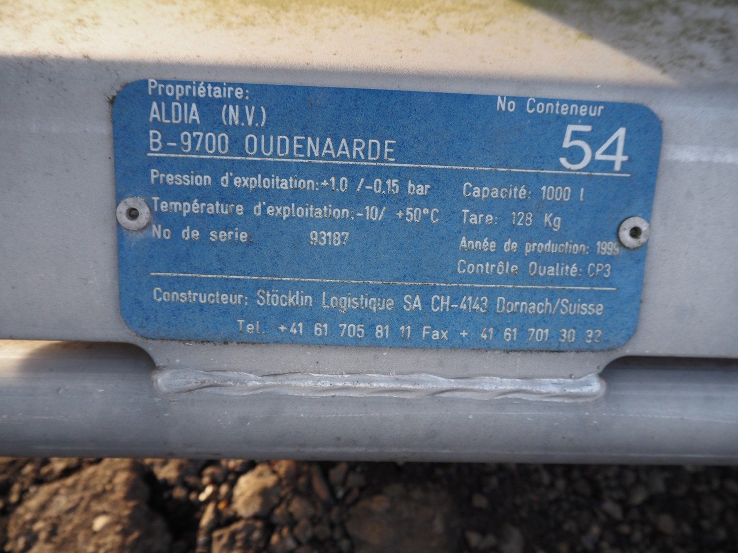 Stöcklin Logistique SA s/s tank, fabrication number: 93187, year of construction: 1999, working pressure: +1/-015 bar, working temperature: -10/+50°C, capacity: 1000 liter, weight: 128 kg, dimensions: Ø 1000 mm x 2000 mm. Kavel locatie: Amfoor 6, 4421 SE Kapelle, Nederland