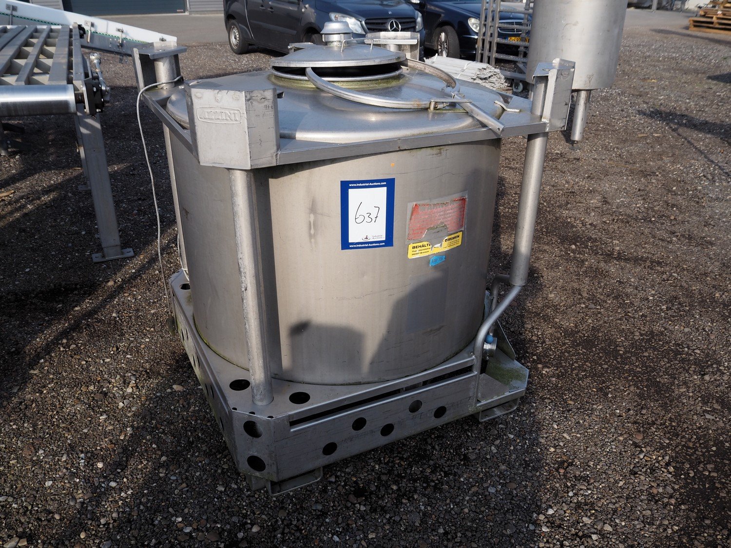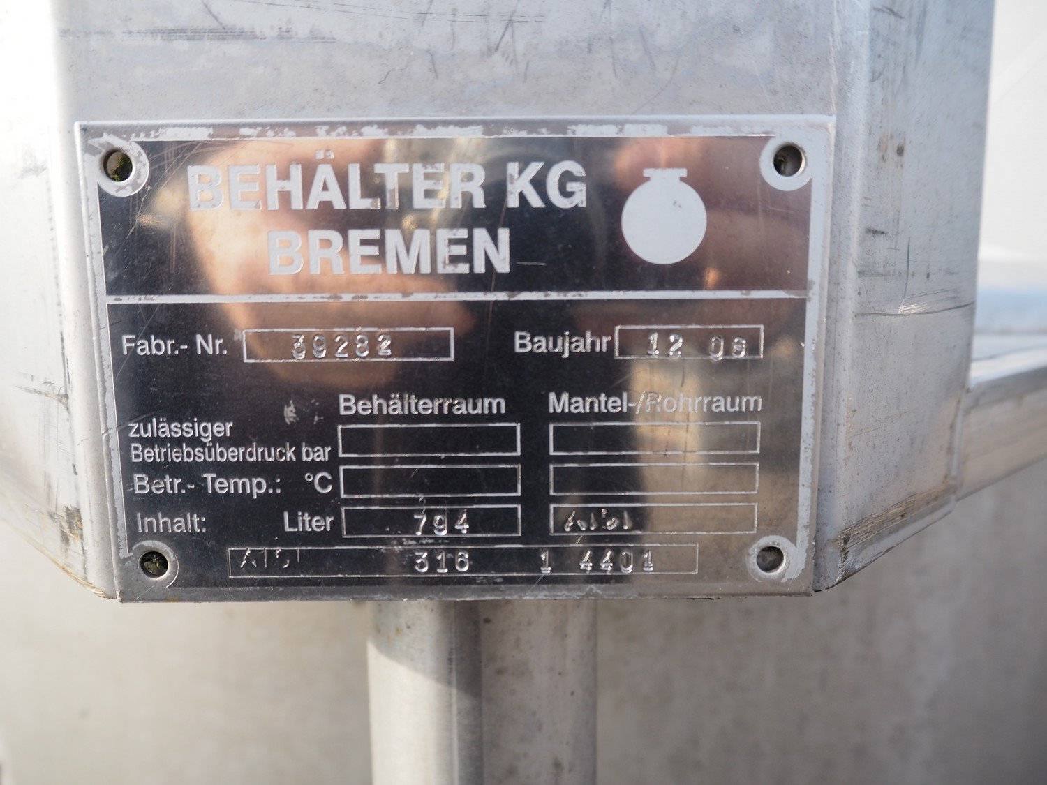 Behälter kg - Bremen s/s tank on steel frame, fabrication number: 39282, year of construction: 12.06, volume: 794 liter, dimensions frame: 1150 mm x 1150 mm x 1300 mm. Kavel locatie: Amfoor 6, 4421 SE Kapelle, Nederland