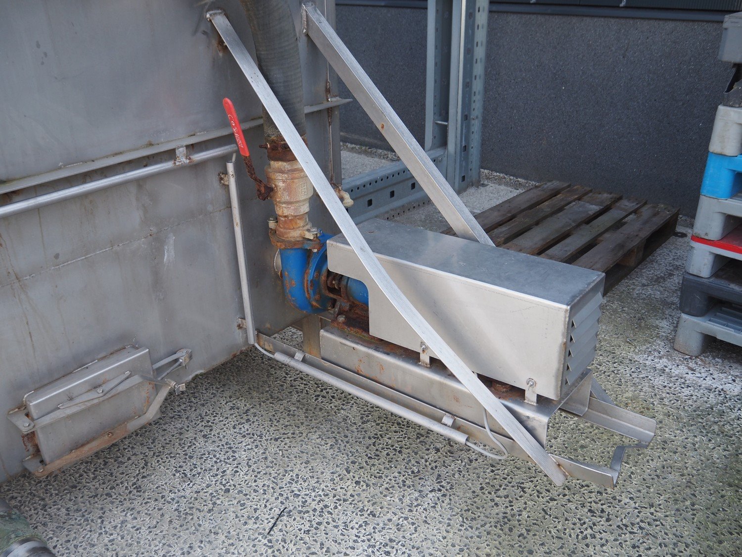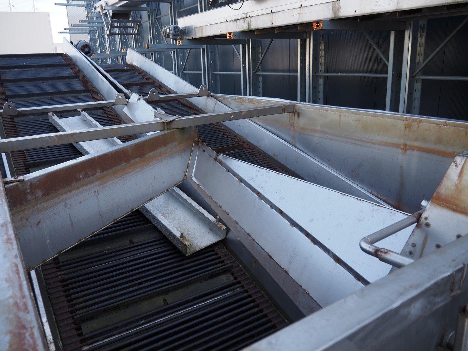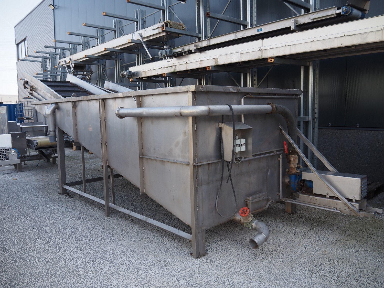 Steel tub used as salt bath with steel elevating belt, belt width: 100 mm and 600 mm, total dimensions: 7100 mm x 2300 mm x 2500 mm. Kavel locatie: Amfoor 6, 4421 SE Kapelle, Nederland