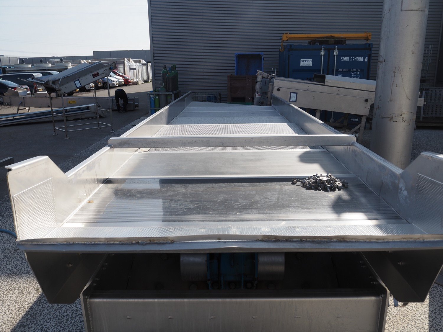 Key Technology BV vibrating gutter with 2 s/s pillars, type: MVSDW, serial number: S2001633, year of construction: 2015, weight: 2560 kg, gutter width: 1420 mm, dimensions vibrating gutter: 6850 mm x 1600 mm x 1440 mm, (2x) 1400 mm x 600 mm x 3750 mm. Kavel locatie: Amfoor 6, 4421 SE Kapelle, Nederland
