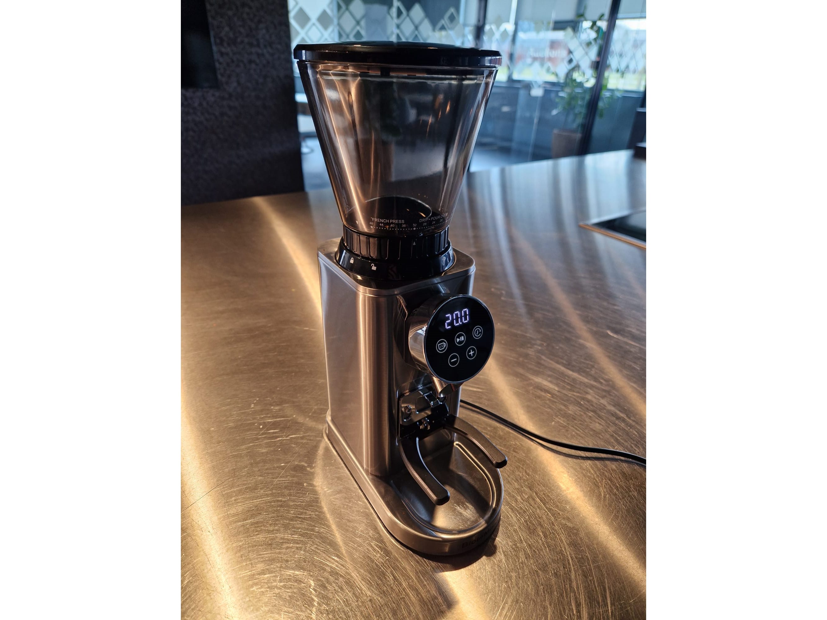 S/s coffee grinder, grinding level: 48 adjustable settings, capacity: up to 90 grams. Kavel locatie: Looyenbeemd 11, 5652 BH Eindhoven, Nederland