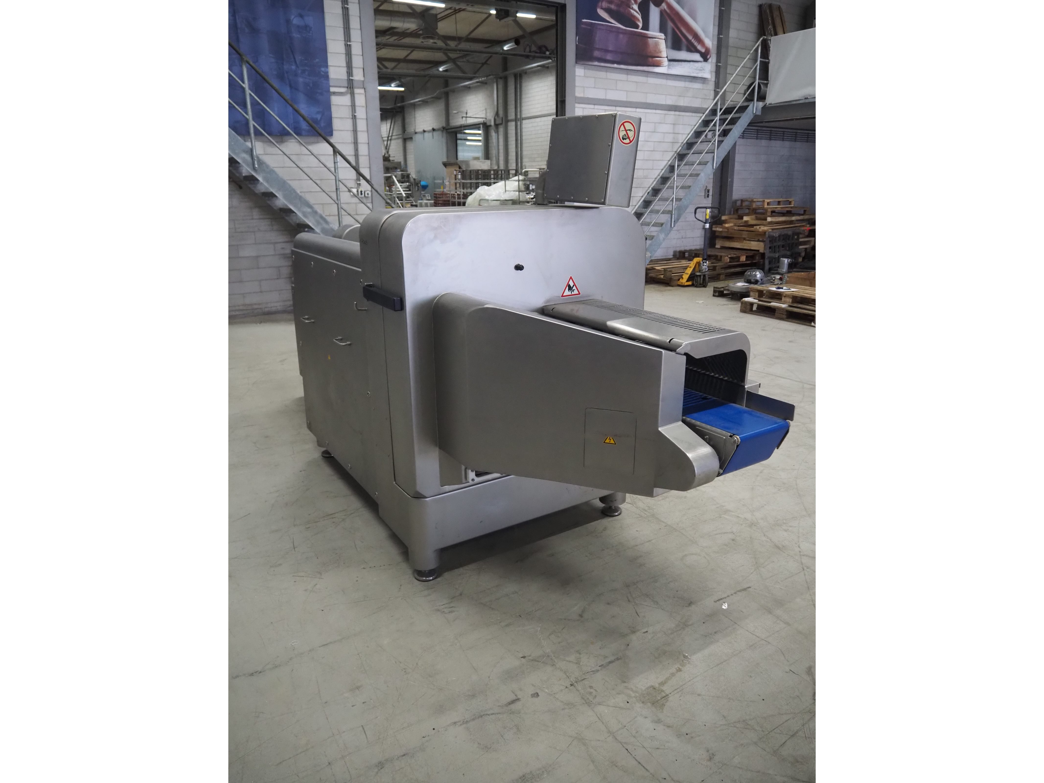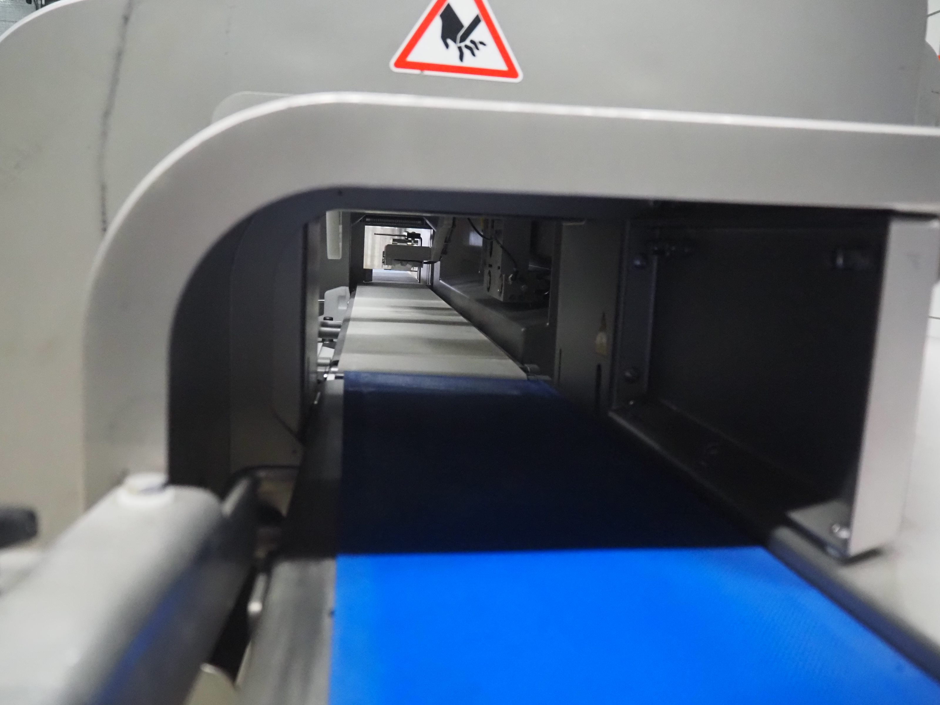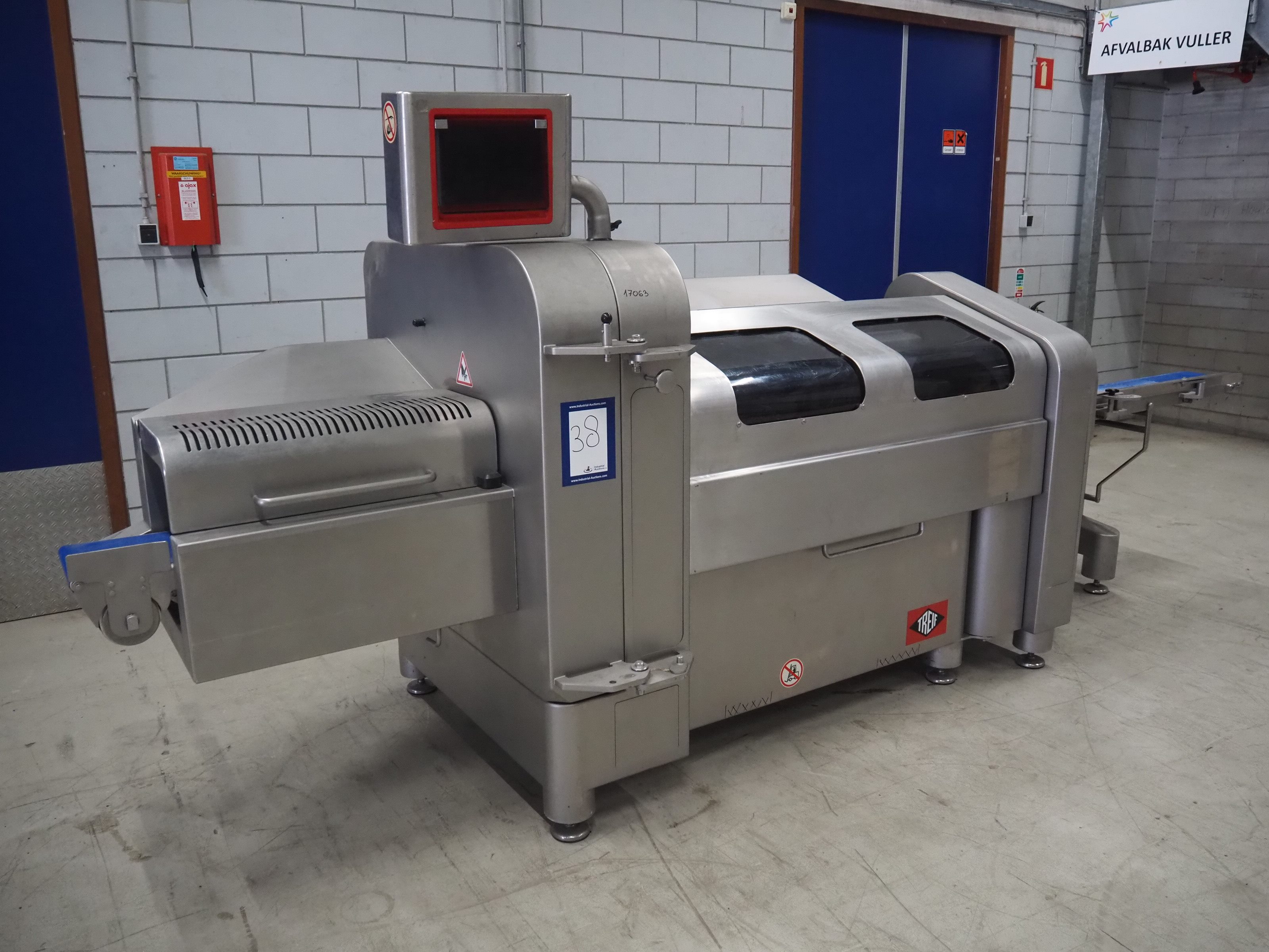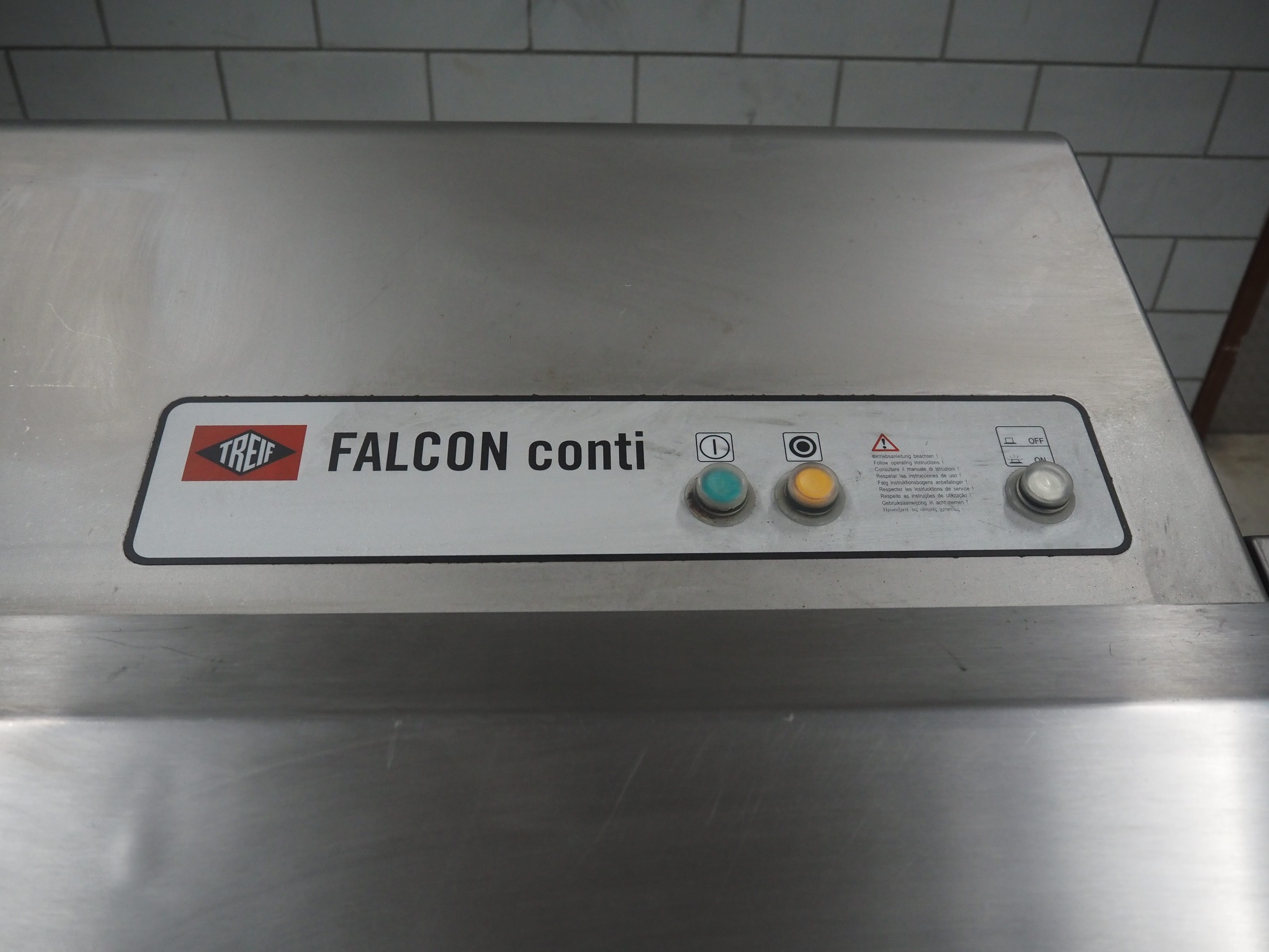 Treif Maschinenbau GmbH slice and portion cutter, model: FALCON CONTI, machine number: 461007.162571.113261, year of construction: 11/2013, 380/480 V, 3 Ph, 50/60 Hz, 22/18/32 A, 8.6/11.7 kW, weight: 750 kg, plastic belts, belt width: 220 mm, clearance: 200 mm x 220 mm, total dimensions: 4600 mm x 1350 mm x 1840 mm. Switch cabinet incomplete. Kavel locatie: Looyenbeemd 11, 5652 BH Eindhoven, Nederland
