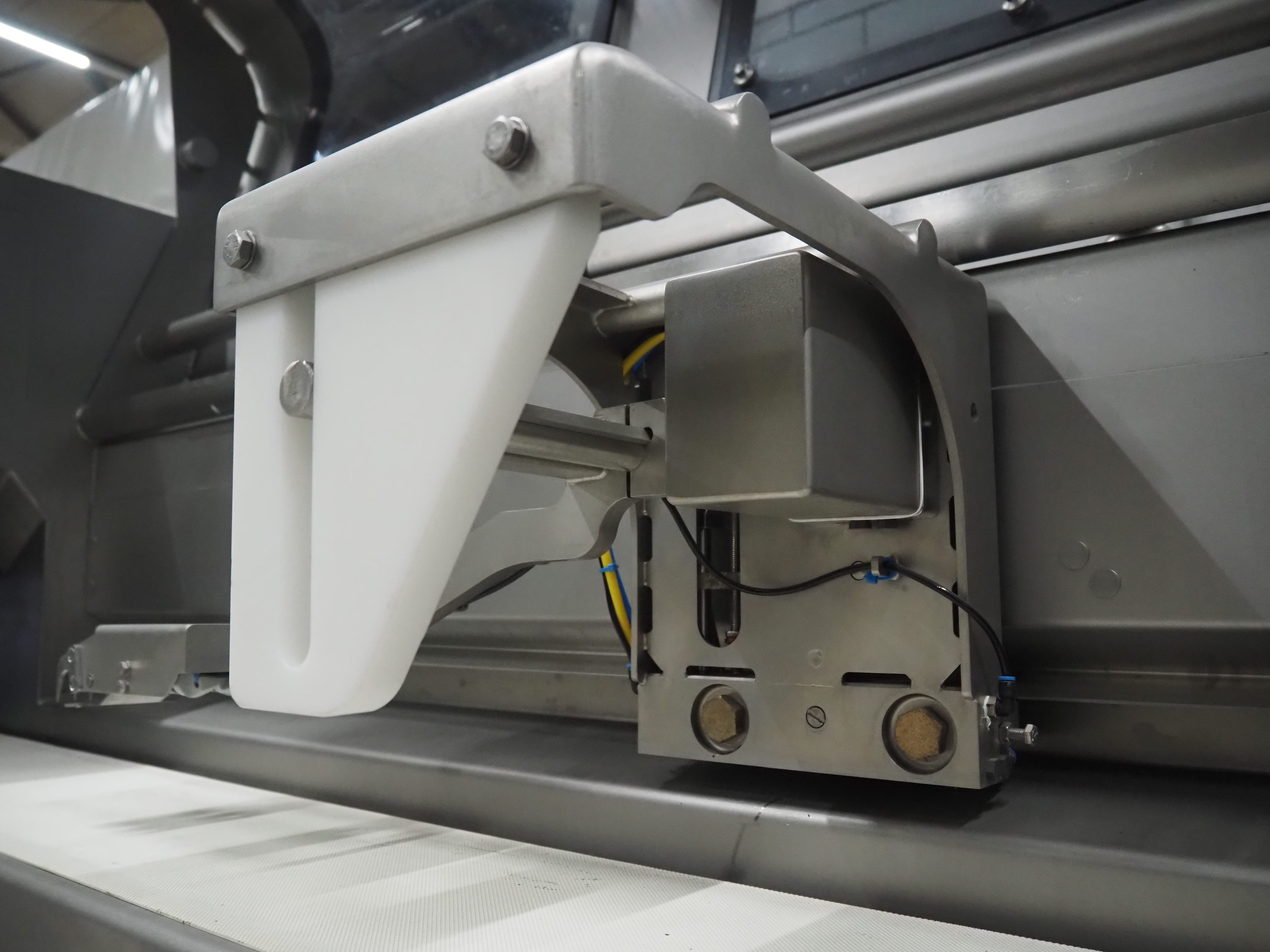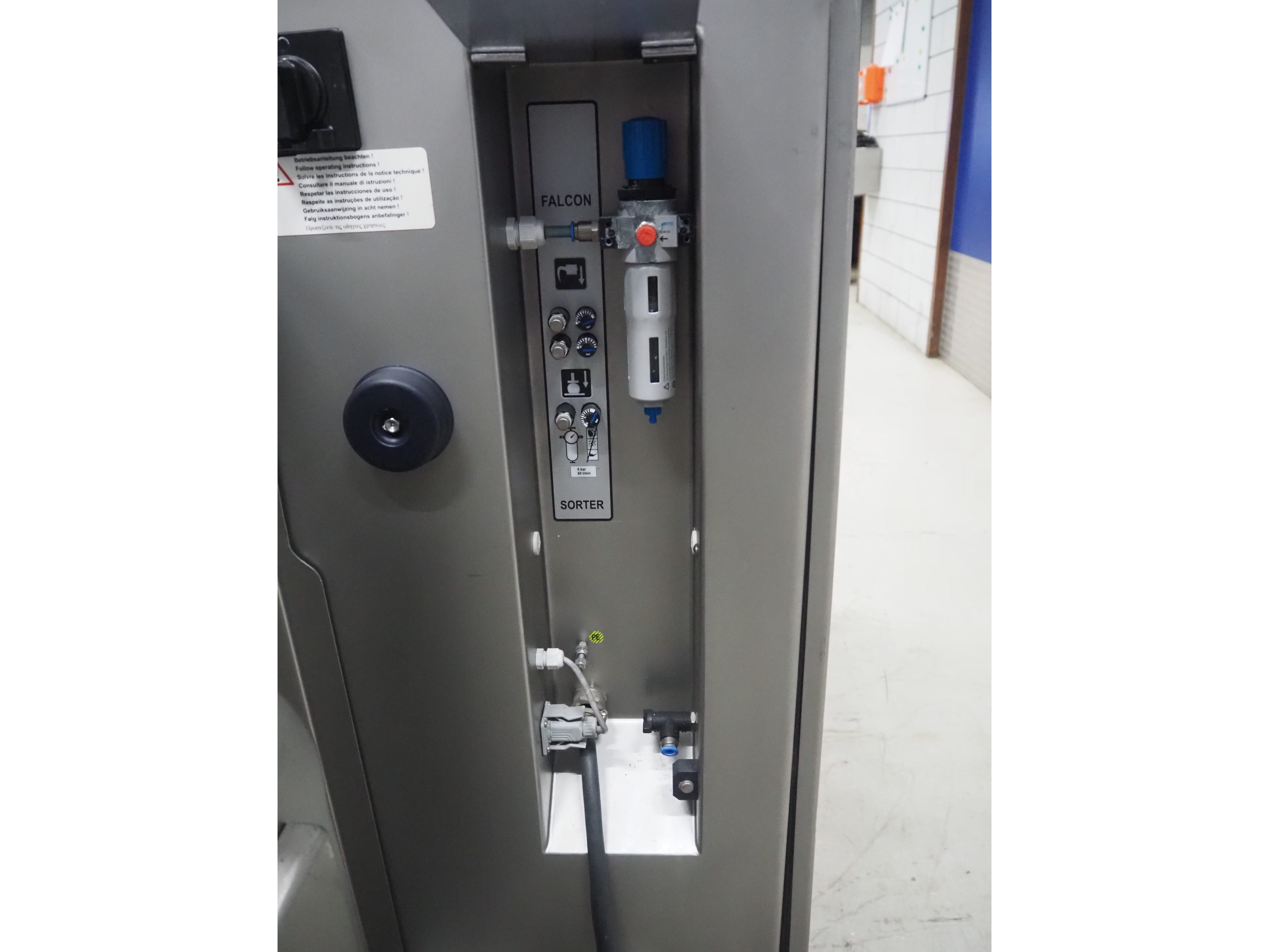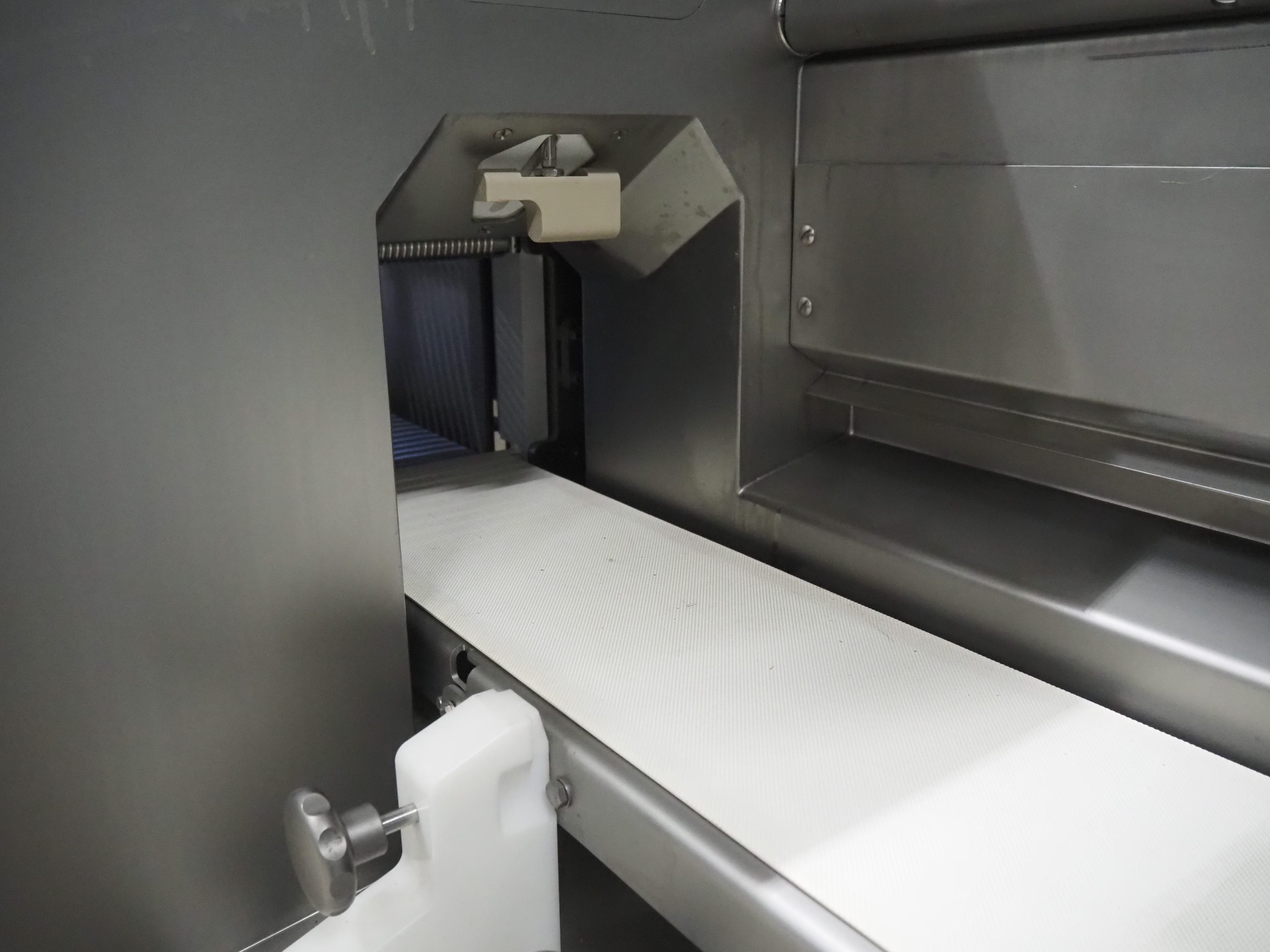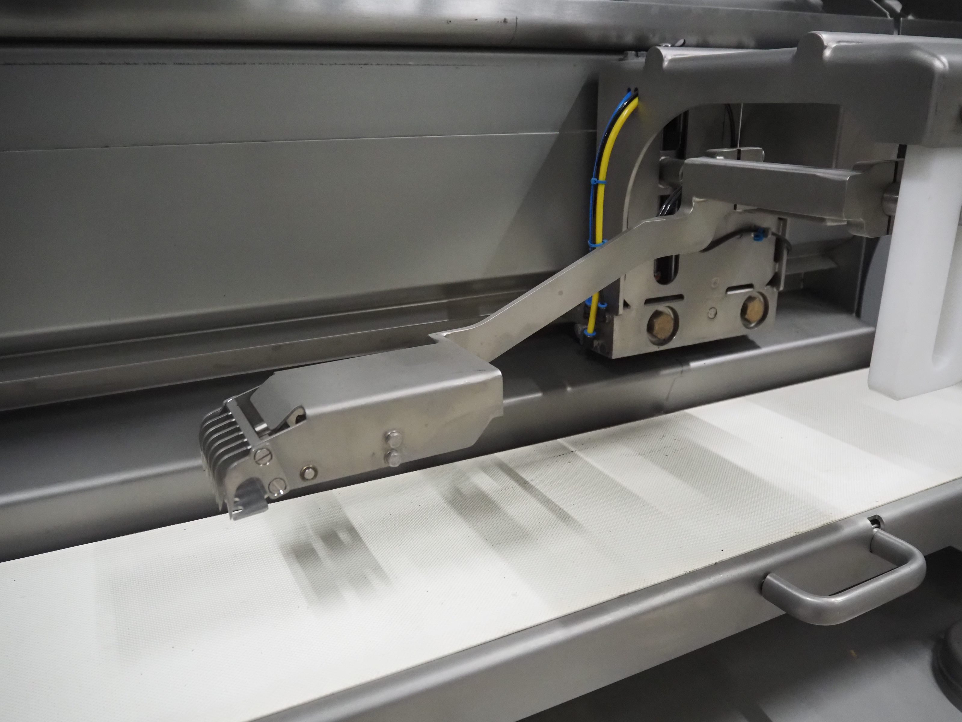 Treif Maschinenbau GmbH slice and portion cutter, model: FALCON CONTI, machine number: 461007.162571.113261, year of construction: 11/2013, 380/480 V, 3 Ph, 50/60 Hz, 22/18/32 A, 8.6/11.7 kW, weight: 750 kg, plastic belts, belt width: 220 mm, clearance: 200 mm x 220 mm, total dimensions: 4600 mm x 1350 mm x 1840 mm. Switch cabinet incomplete. Kavel locatie: Looyenbeemd 11, 5652 BH Eindhoven, Nederland