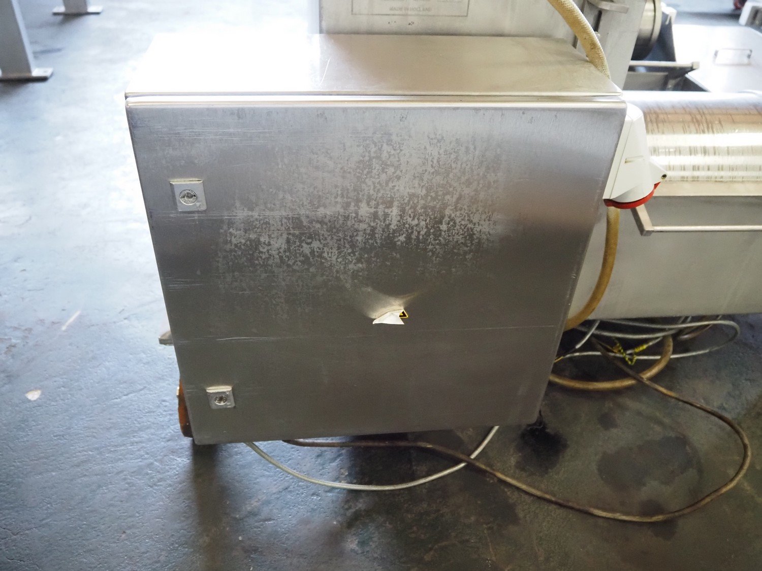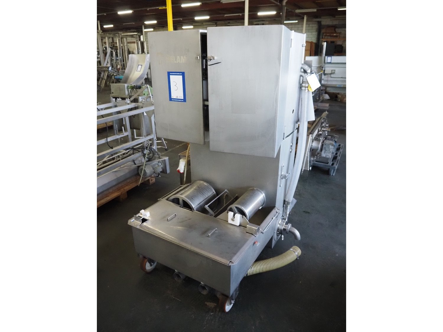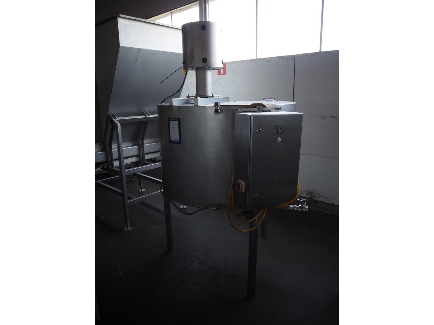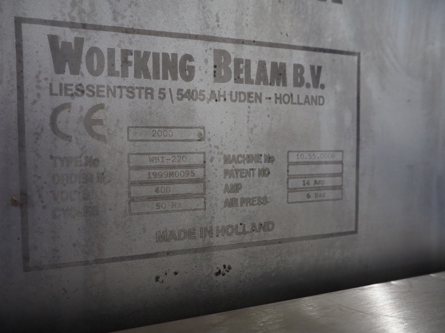 Wolfking Belam injector for whole chickens with outfeed belt and Voltman Konstruktie BV brine mixing tank, injector model: WBI-220, year of construction: 2000, 400 V, 50 Hz, 14 A, capacity: up to 2100 bph, 120 needles, dimensions injector: 1500 mm x 1100 mm x 1780 mm, outfeed belt, s/s frame, plastic mesh belt, belt width: 250 mm, dimensions outfeed belt: 3950 mm x 750 mm x 1100 mm. Voltman Konstruktie BV s/s brine mixing tank, type: BM 900, serial number: 1699, year of construction: 2000-08, inside dimensions: ø 1120 mm x 750 mm, total dimensions: 1500 mm x 1450 mm x 2200 mm. Kavel locatie: Pastoorslaan 22, 2182 BX Hillegom, Nederland
