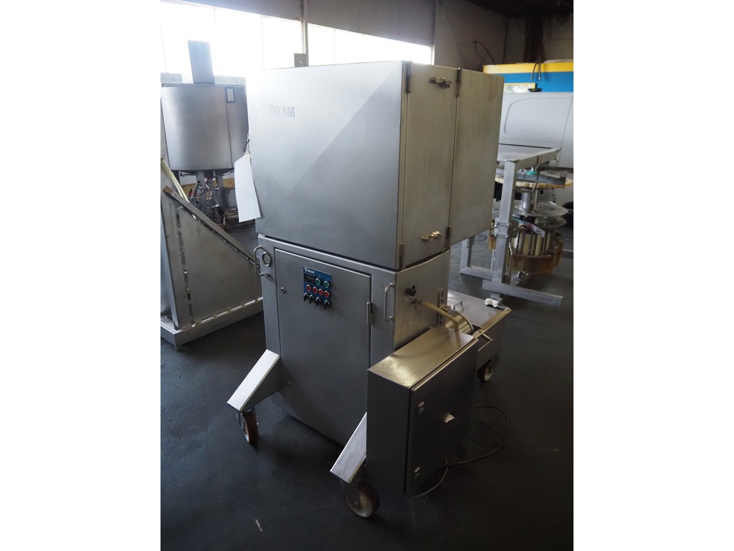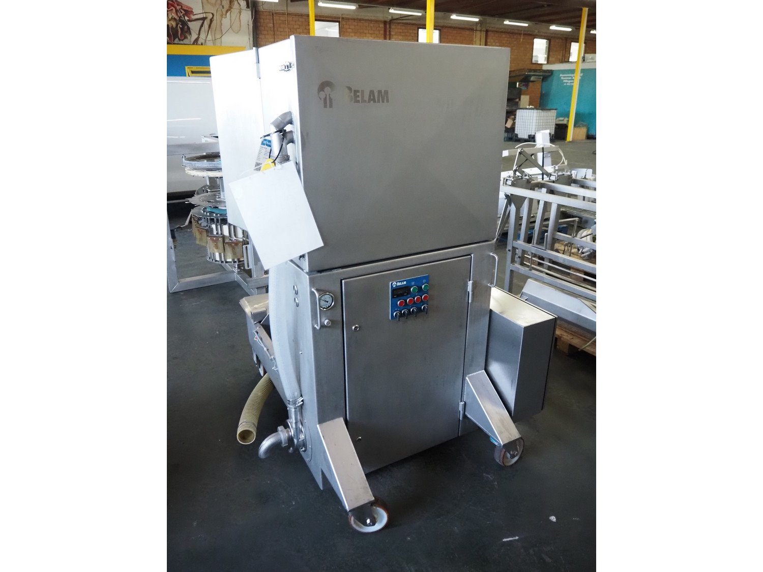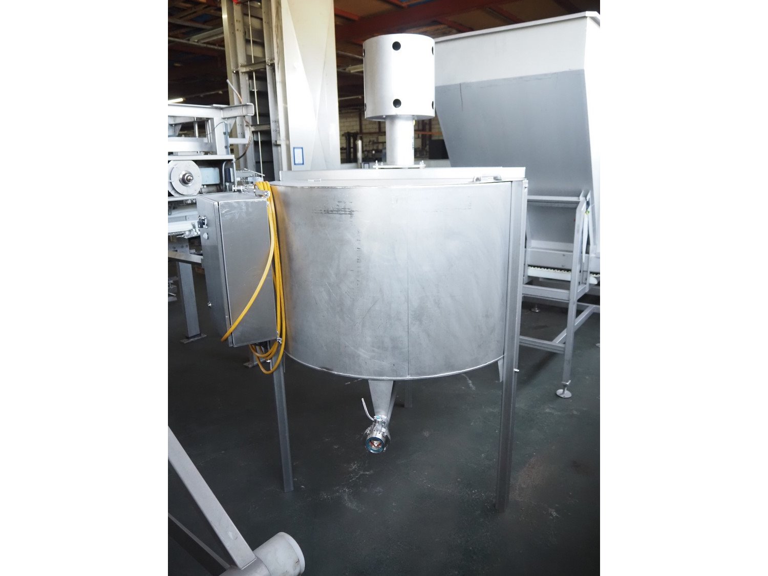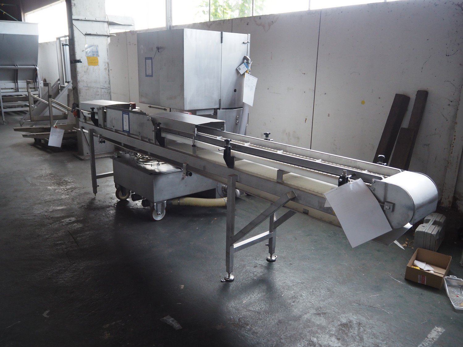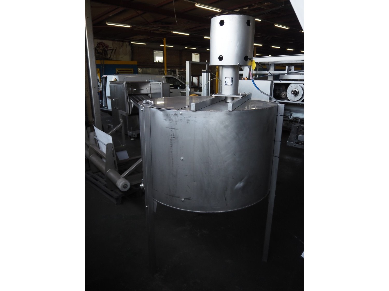 Wolfking Belam injector for whole chickens with outfeed belt and Voltman Konstruktie BV brine mixing tank, injector model: WBI-220, year of construction: 2000, 400 V, 50 Hz, 14 A, capacity: up to 2100 bph, 120 needles, dimensions injector: 1500 mm x 1100 mm x 1780 mm, outfeed belt, s/s frame, plastic mesh belt, belt width: 250 mm, dimensions outfeed belt: 3950 mm x 750 mm x 1100 mm. Voltman Konstruktie BV s/s brine mixing tank, type: BM 900, serial number: 1699, year of construction: 2000-08, inside dimensions: ø 1120 mm x 750 mm, total dimensions: 1500 mm x 1450 mm x 2200 mm. Kavel locatie: Pastoorslaan 22, 2182 BX Hillegom, Nederland
