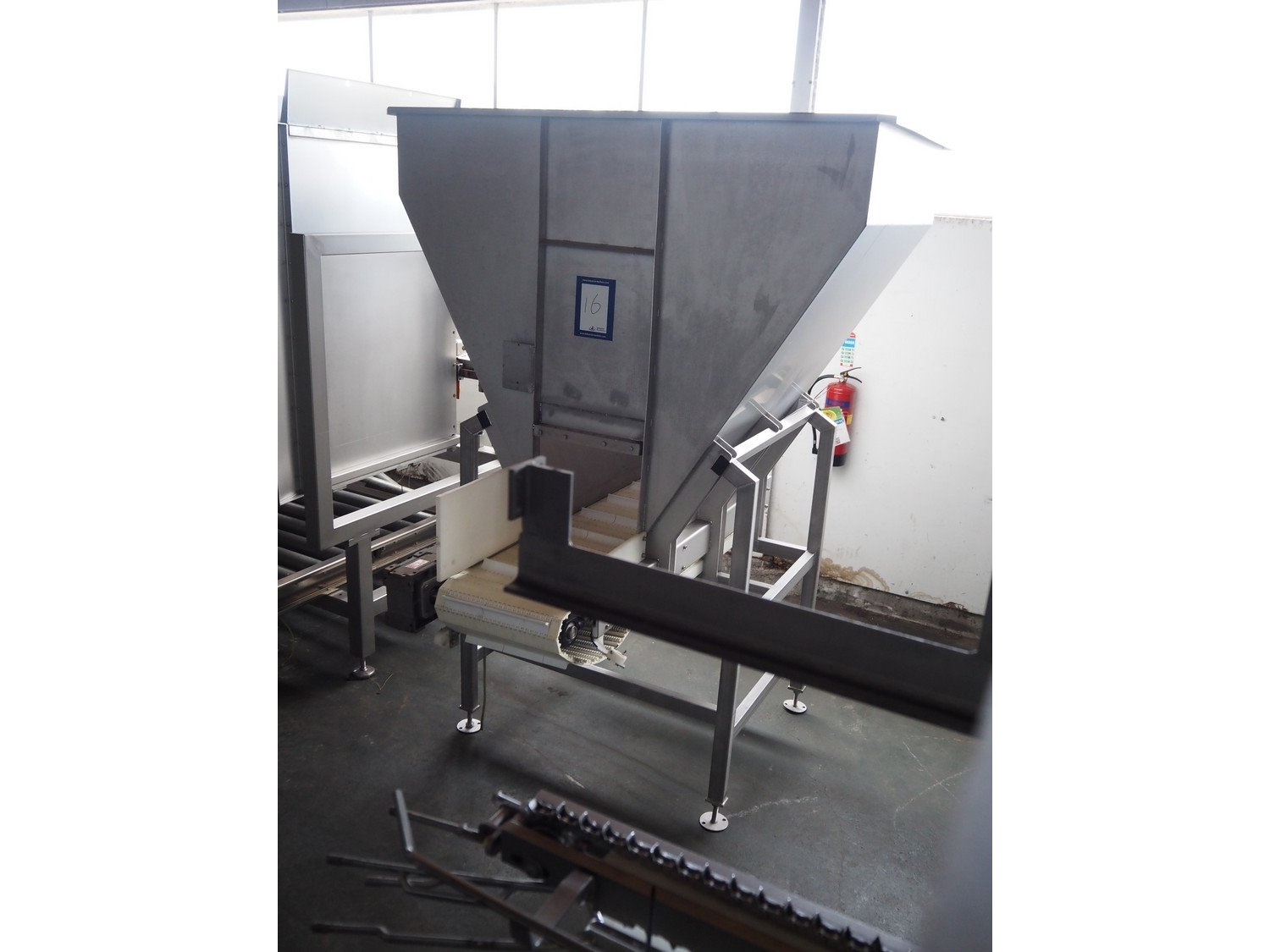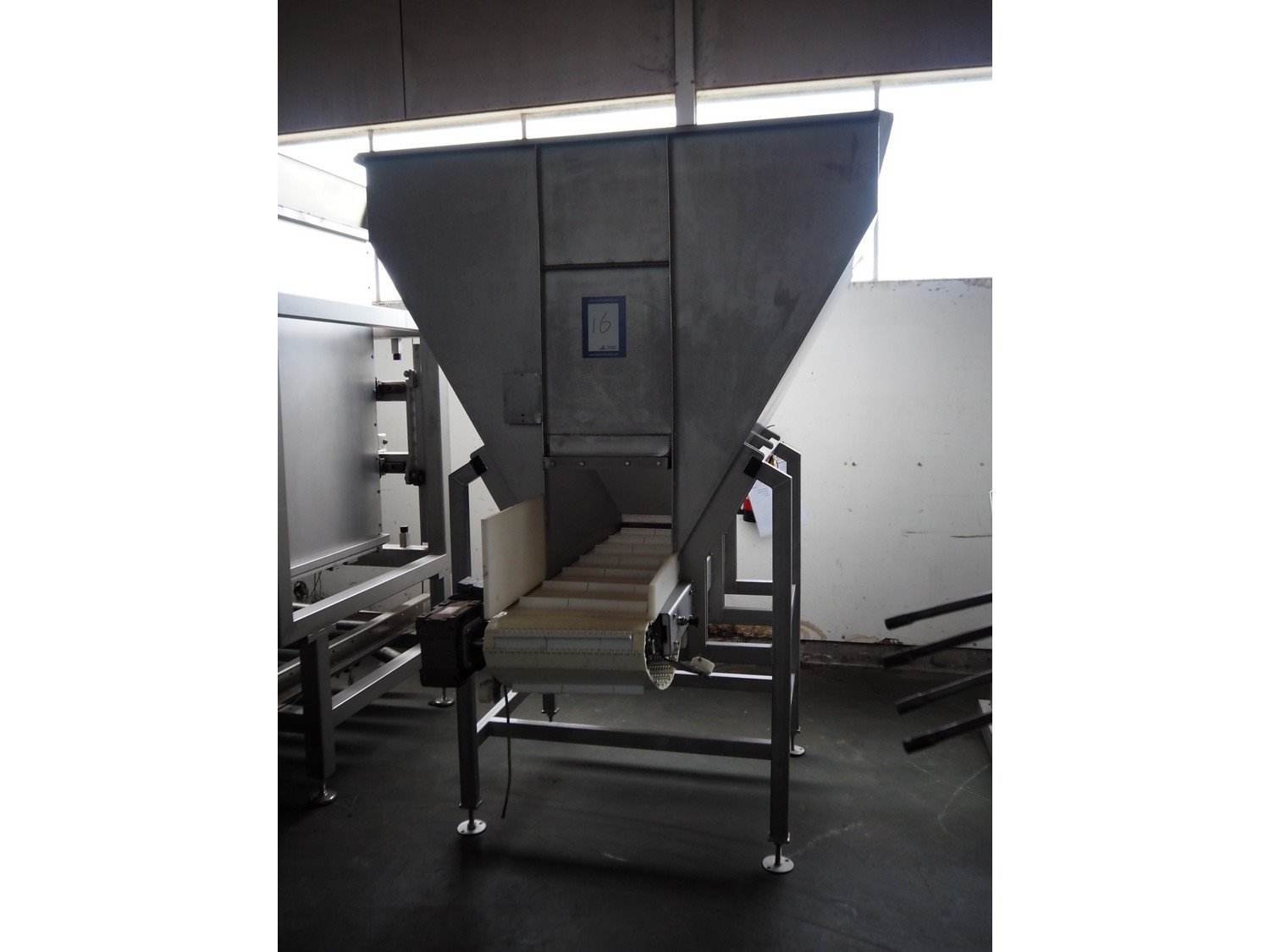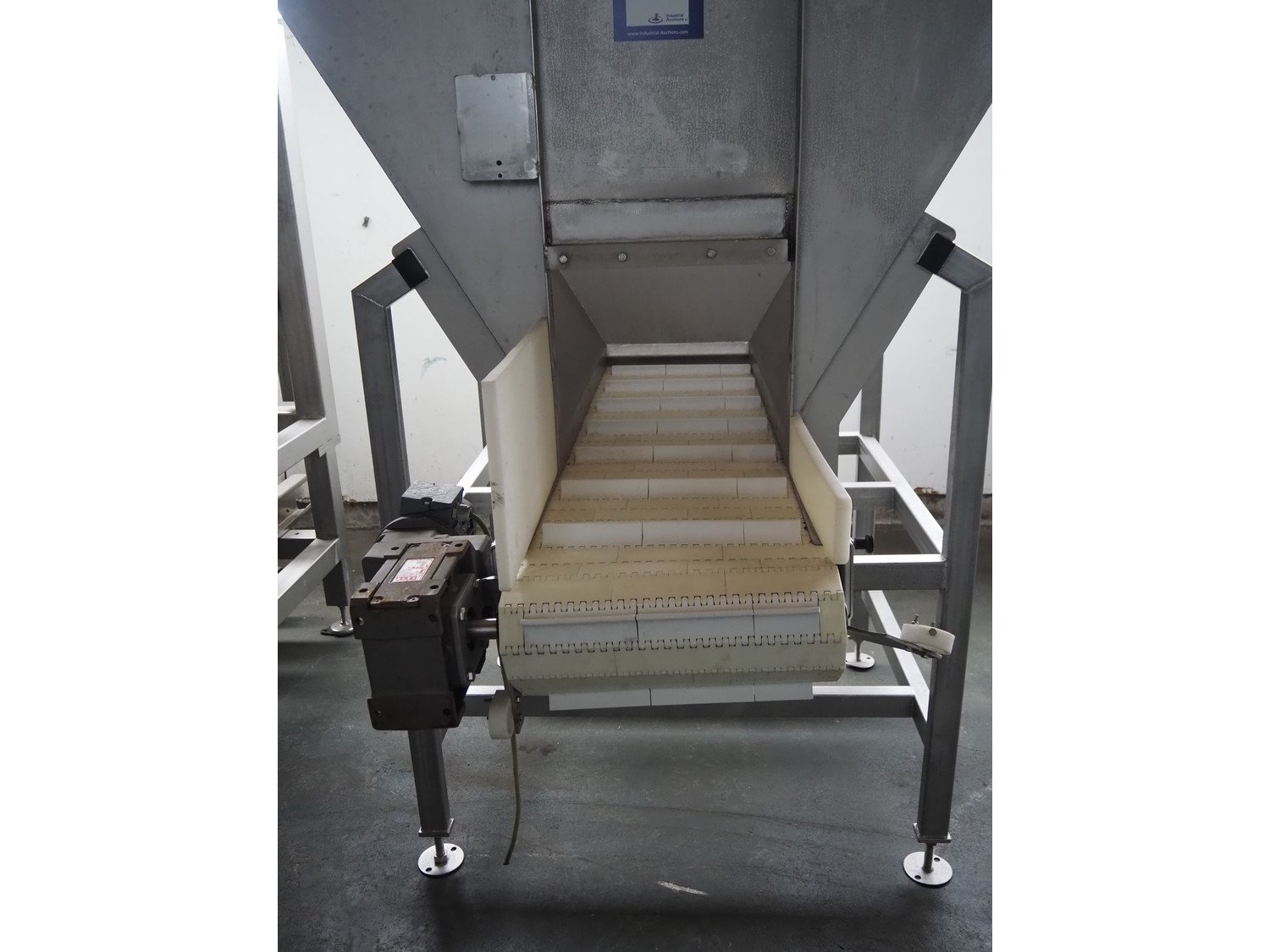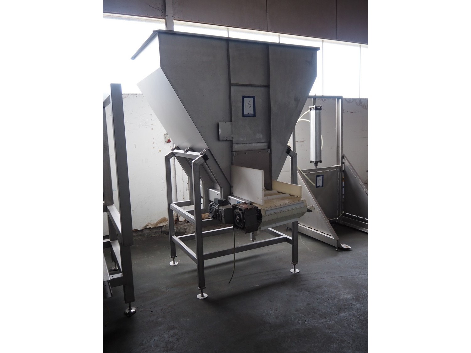 Ground s/s infeed bunker with outfeed belt, model: DH100/225, year of construction: 2005, plastic belt with dividers, belt width: 455 mm, divider height: 30 mm, distance between dividers: 200 mm, total dimensions: 1750 mm x 1800 mm x 2400 mm. Kavel locatie: Pastoorslaan 22, 2182 BX Hillegom, Nederland