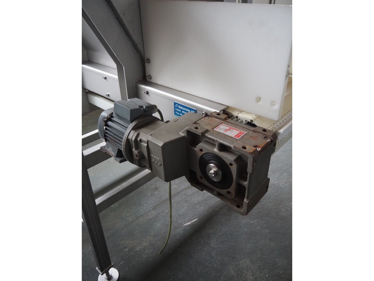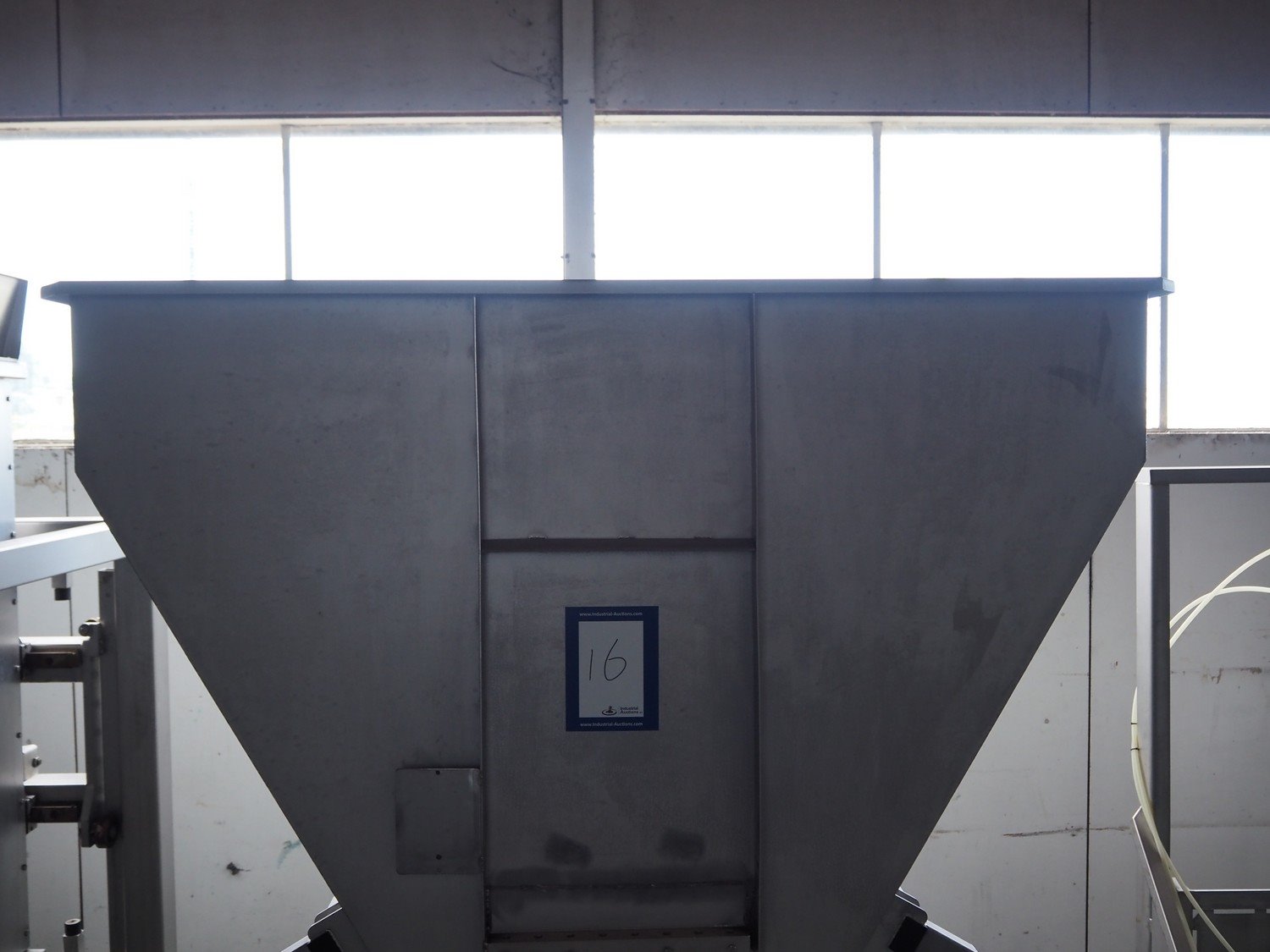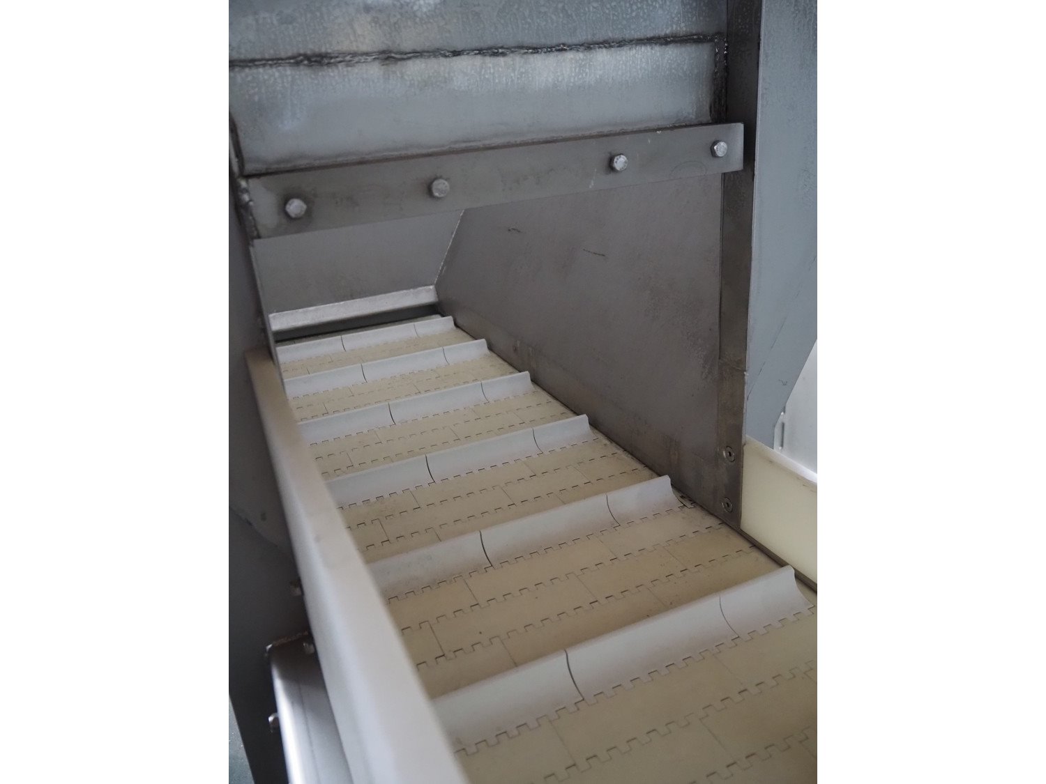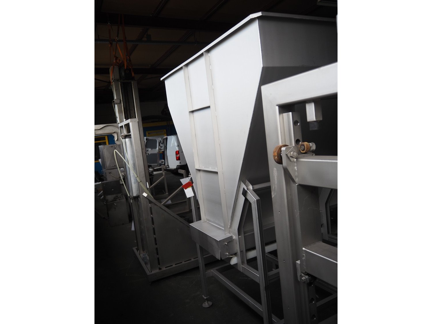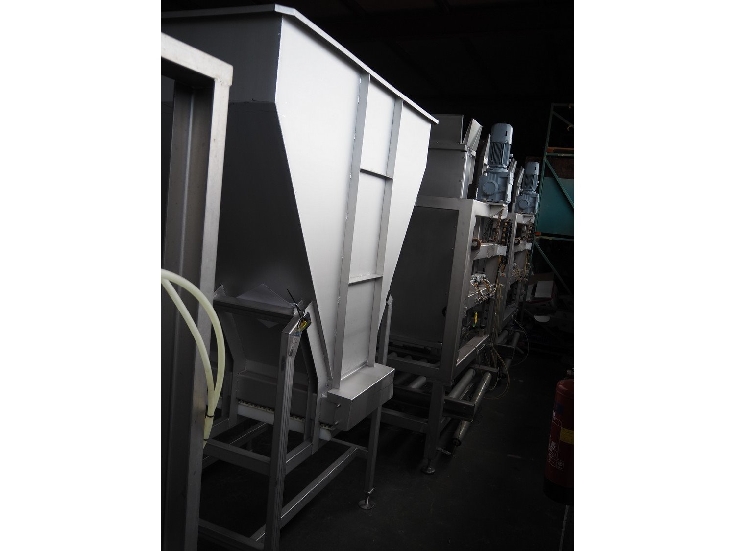 Ground s/s infeed bunker with outfeed belt, model: DH100/225, year of construction: 2005, plastic belt with dividers, belt width: 455 mm, divider height: 30 mm, distance between dividers: 200 mm, total dimensions: 1750 mm x 1800 mm x 2400 mm. Kavel locatie: Pastoorslaan 22, 2182 BX Hillegom, Nederland