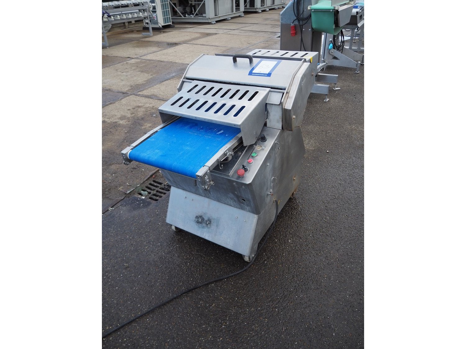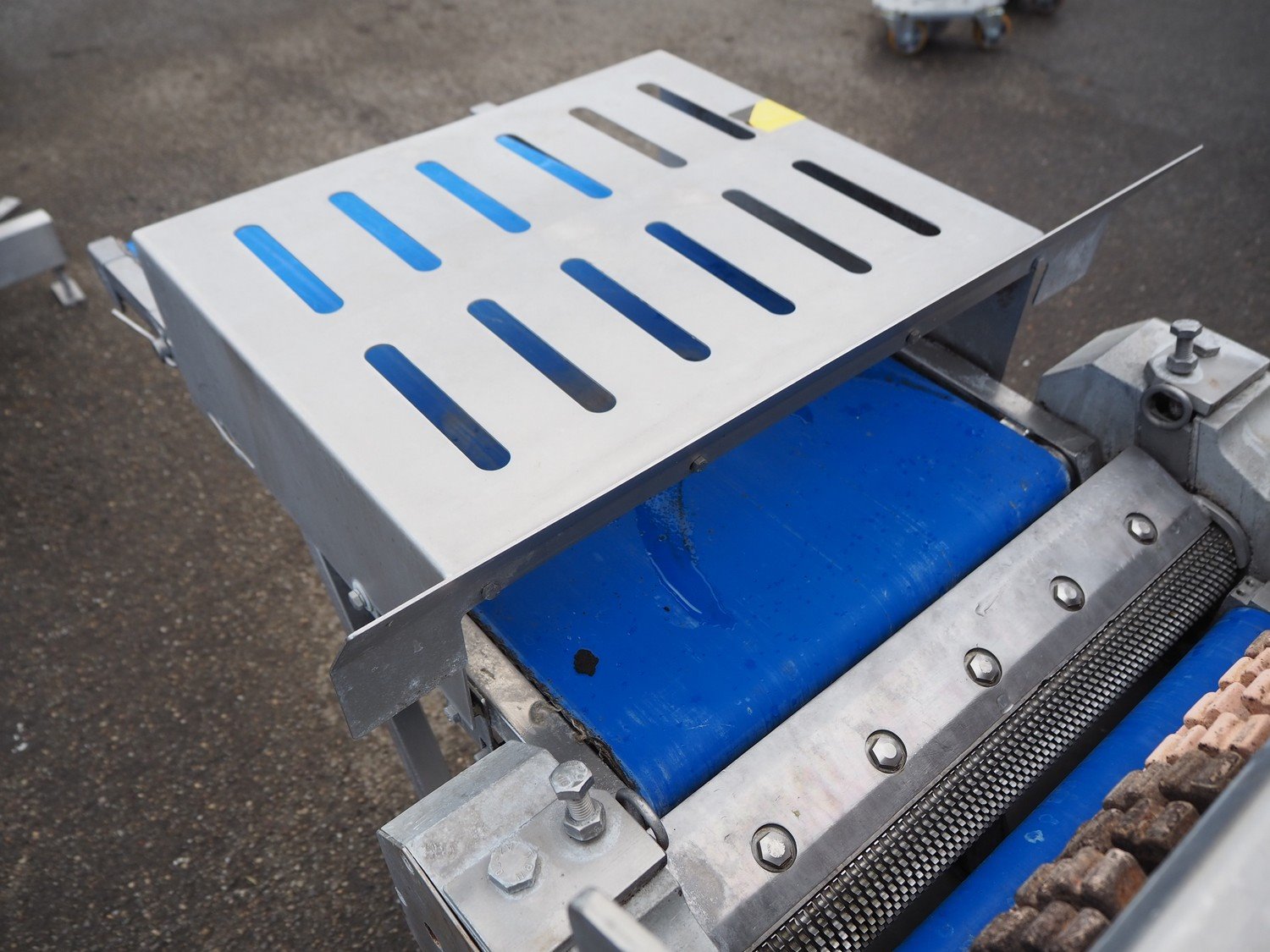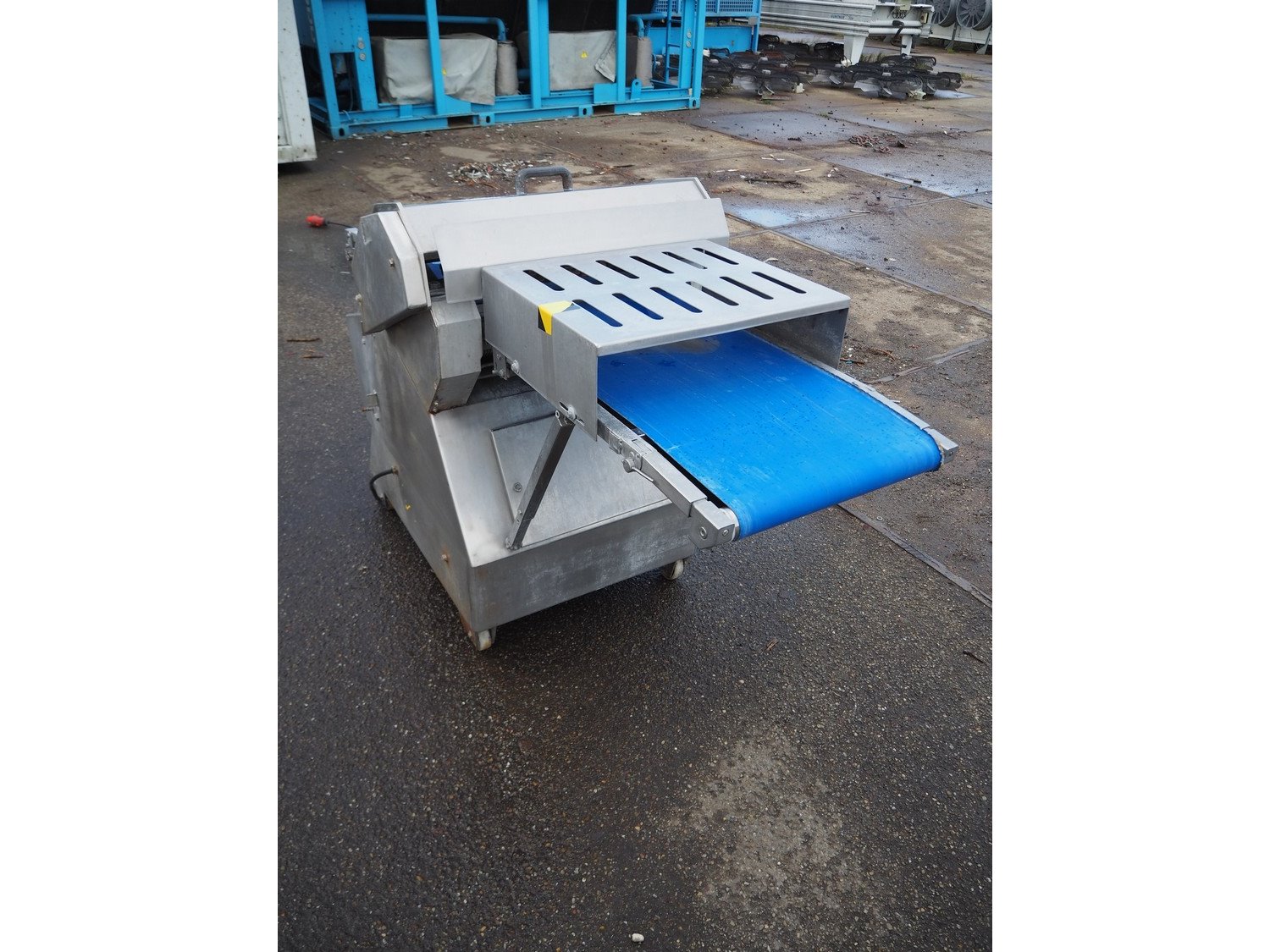 Mobile skinning and derinding machine, plastic belt, belt width: 440 mm, working width: 500 mm, total dimensions: 1900 mm x 840 mm x 1200 mm. Technical condition unknown. Kavel locatie: Pastoorslaan 22, 2182 BX Hillegom, Nederland