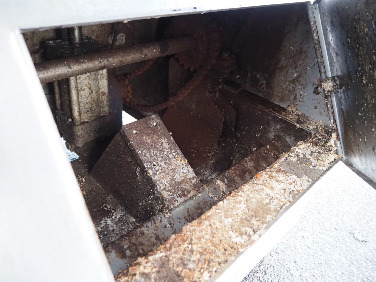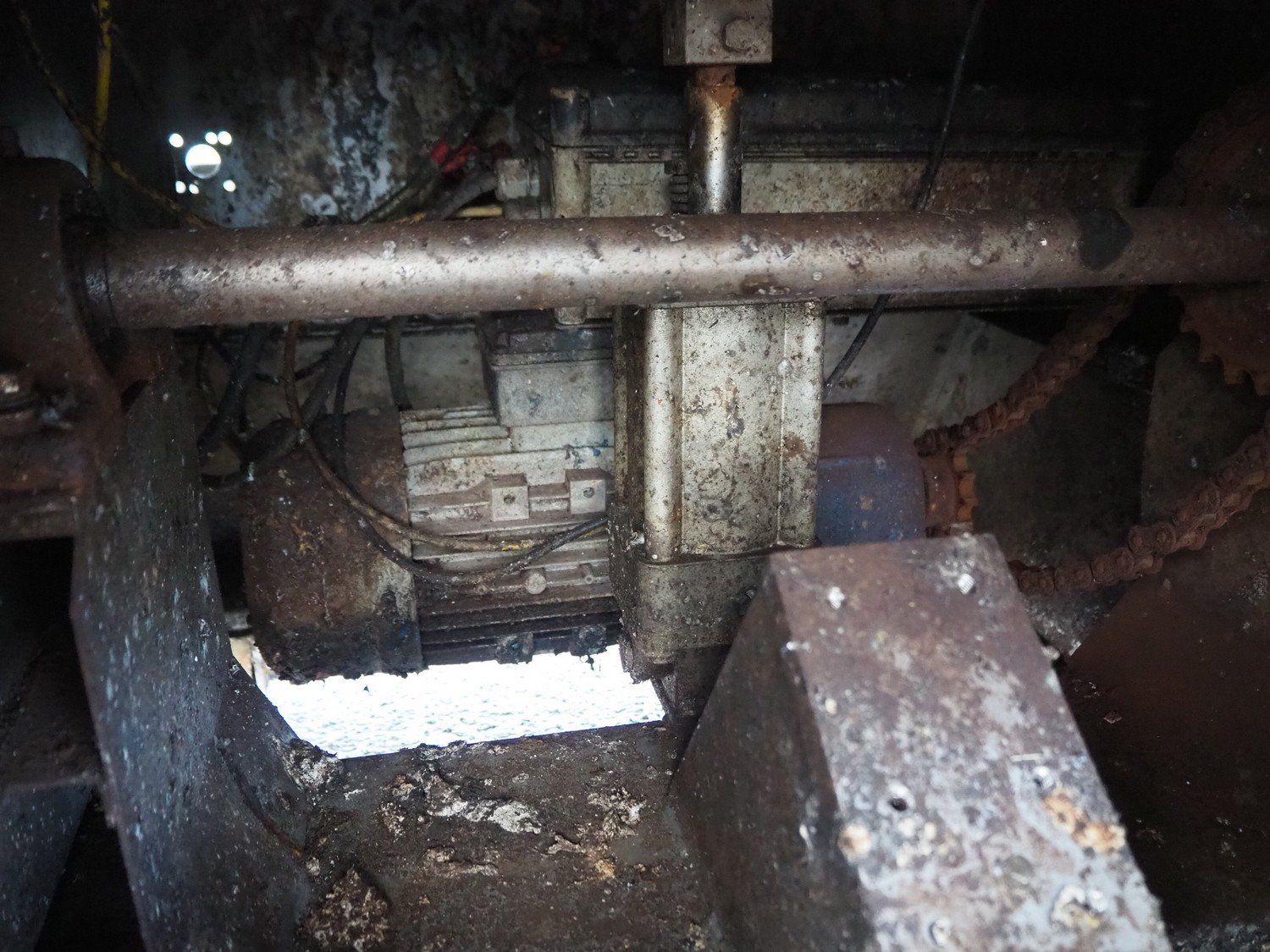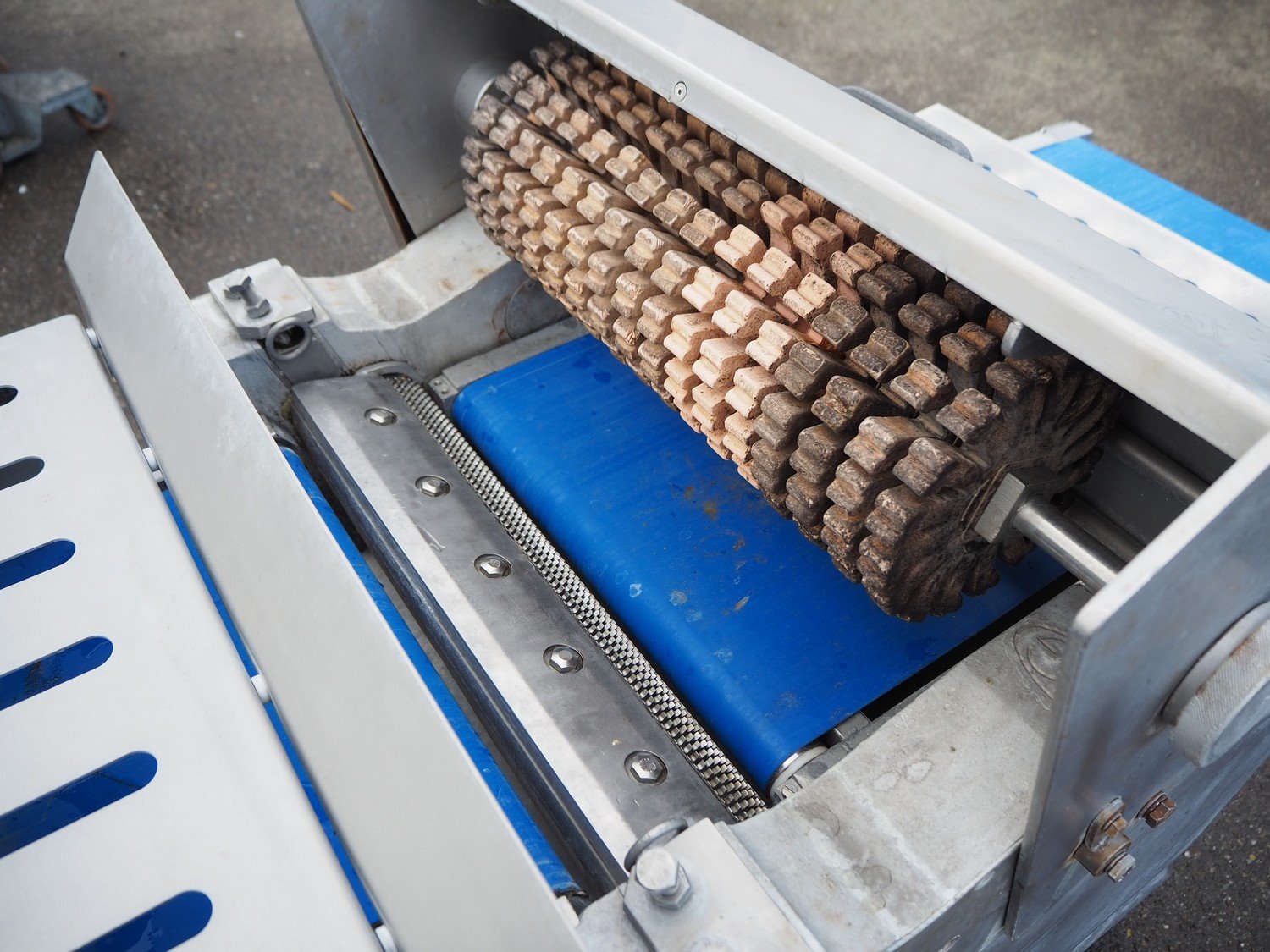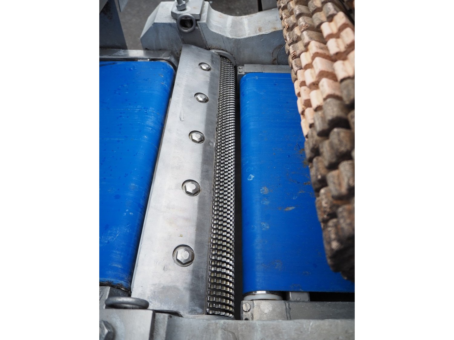 Mobile skinning and derinding machine, plastic belt, belt width: 440 mm, working width: 500 mm, total dimensions: 1900 mm x 840 mm x 1200 mm. Technical condition unknown. Kavel locatie: Pastoorslaan 22, 2182 BX Hillegom, Nederland