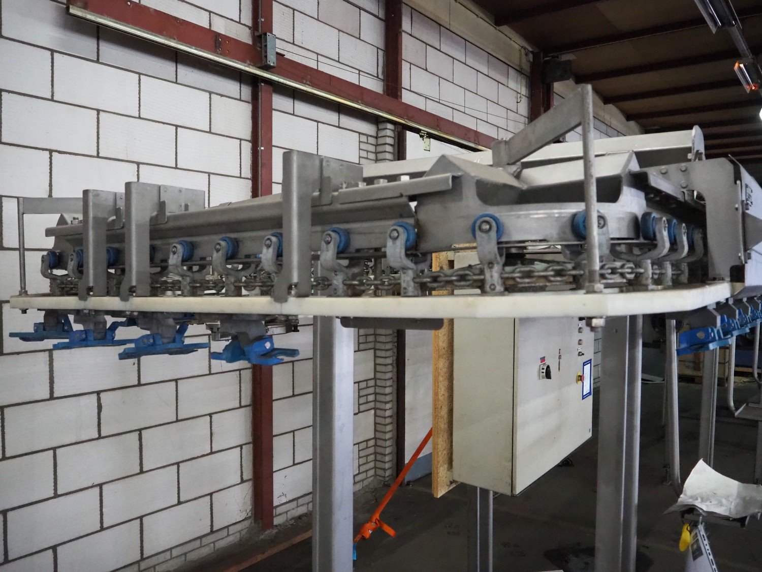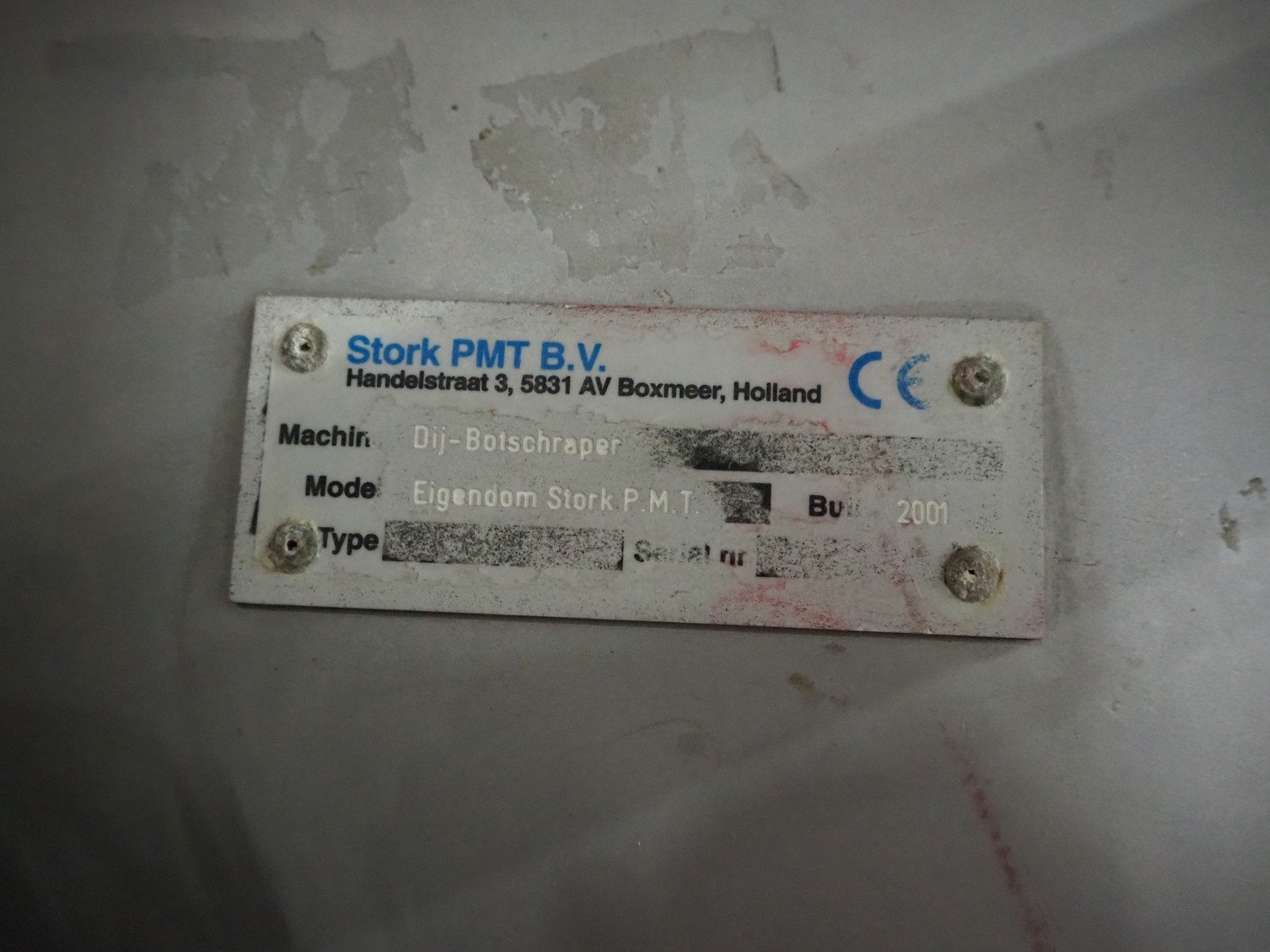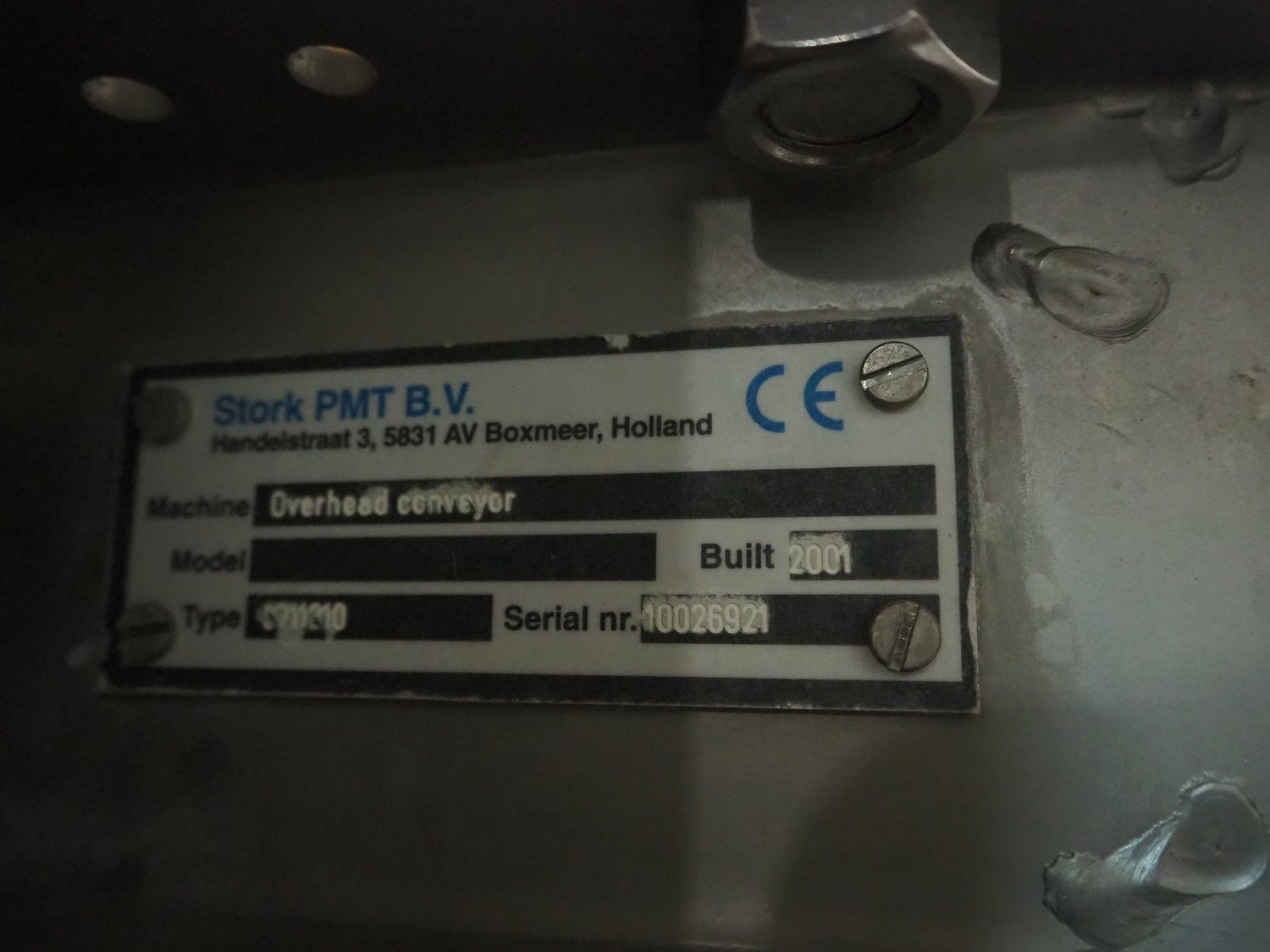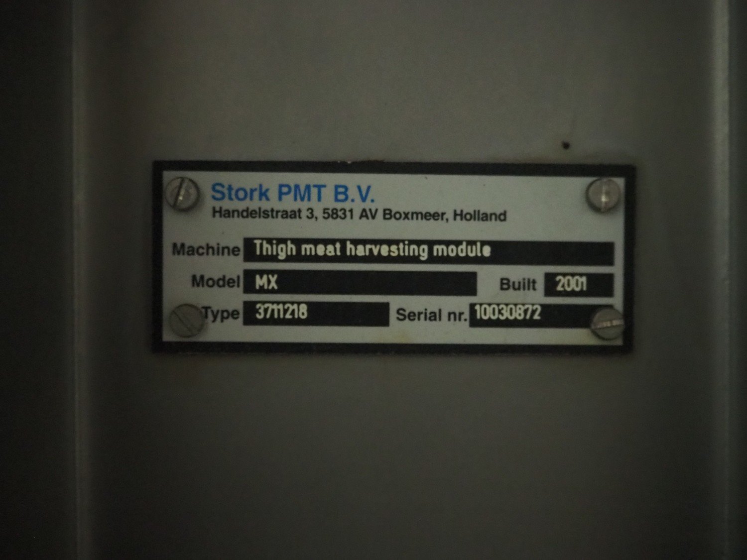 Stork B.V. leg deboning line, consisting of: Drumstick deboning module, type: 37112717, serial number: 10030871. Hanging station, type: 1711213, serial number: 10030864, whizzard knife. Thigh bone scraper, thigh meat harvesting module, type: 3711218, serial number: 10030872. Shackle washer, type: 1242700, processing station, type: 3711214, serial number: 10030869. Total dimensions: 10500 mm x 3200 mm x 2700 mm. Kavel locatie: Pastoorslaan 22, 2182 BX Hillegom, Nederland