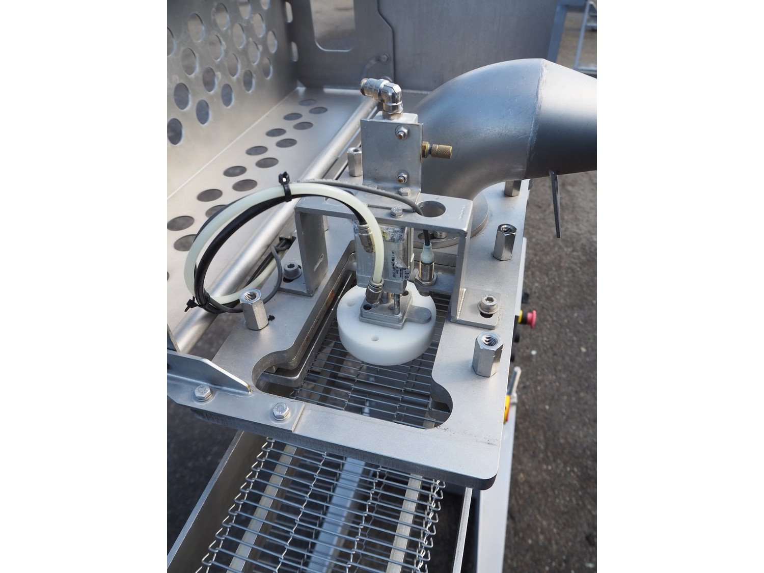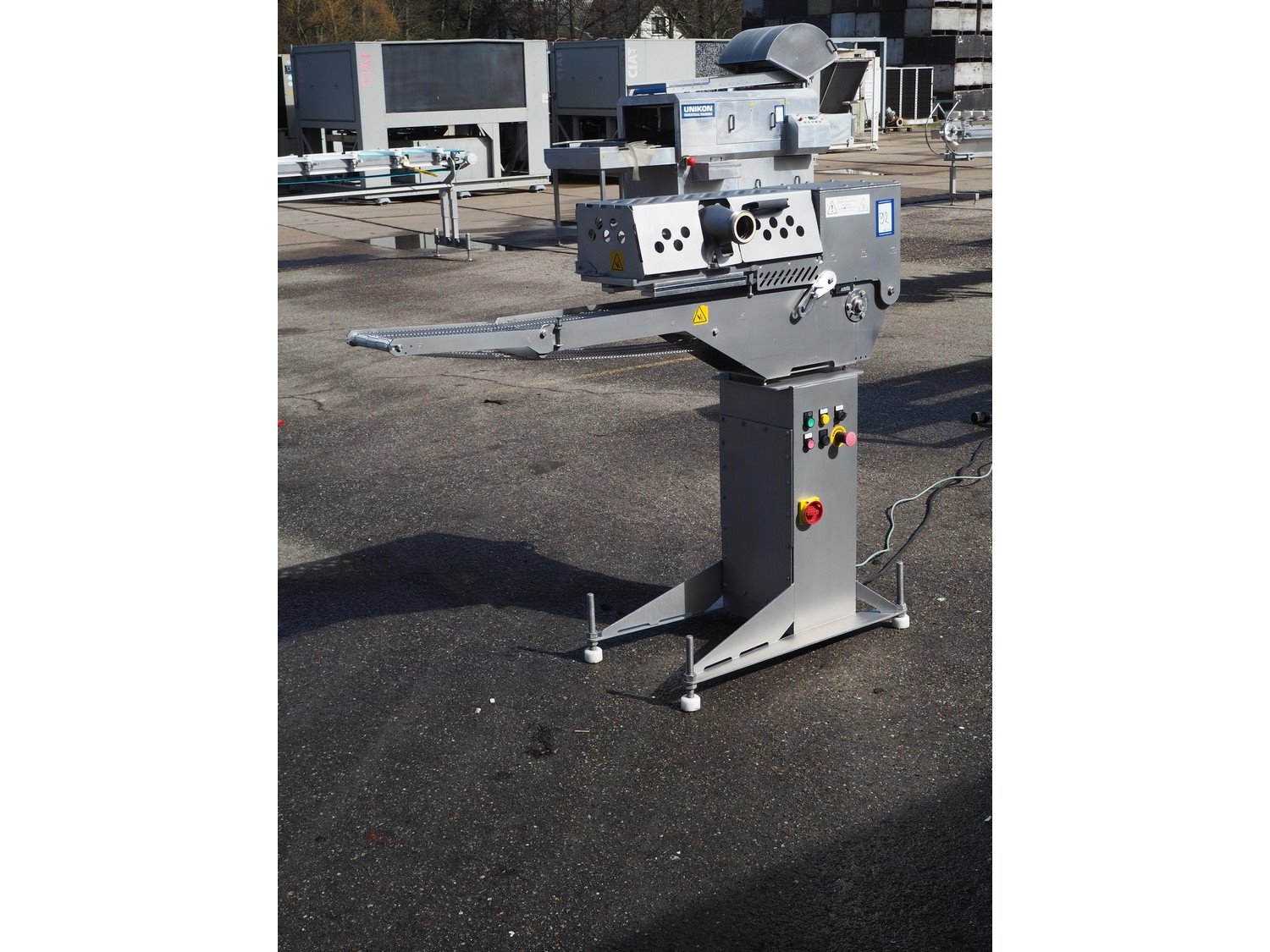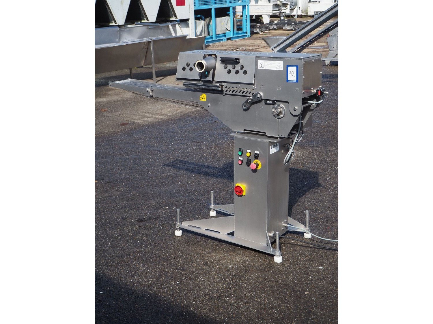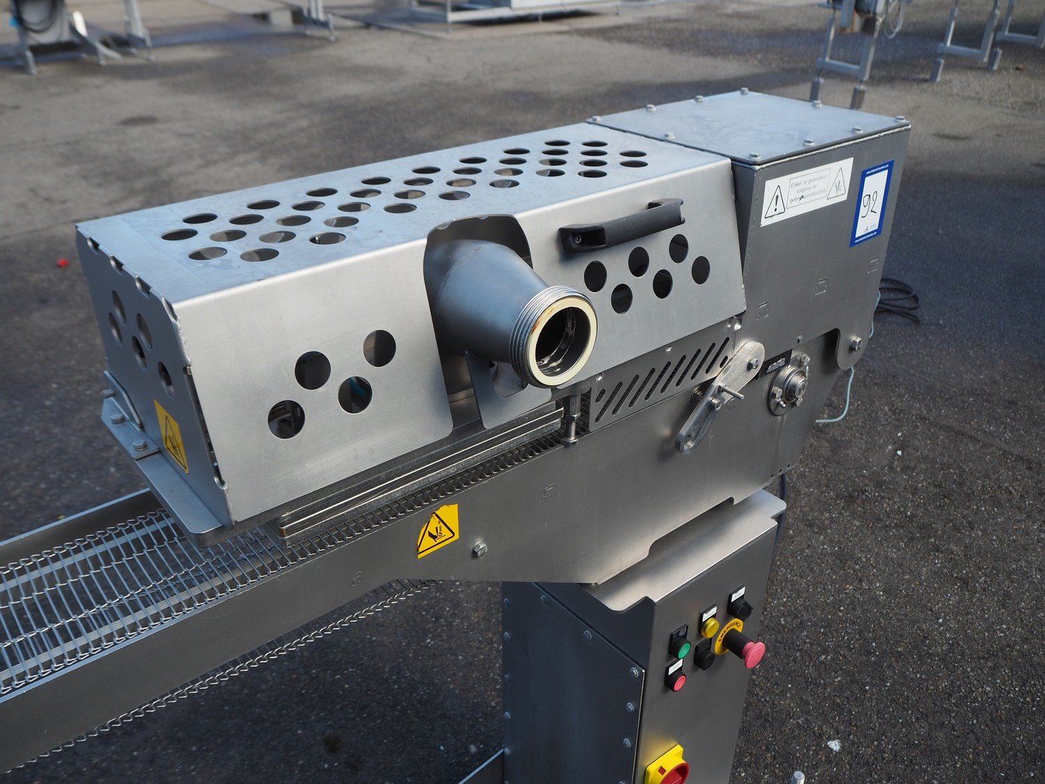 Dmatic hamburger forming machine, type: DBM/S3/501, year of construction: 2005/06, 400 V, 3 Ph, 50 Hz, 6 A, 0.18 kW, s/s mesh belt, belt width: 160 mm, form diameter: 85 mm, total dimensions: 1650 mm x 500 mm x 1300 mm. Kavel locatie: Pastoorslaan 22, 2182 BX Hillegom, Nederland