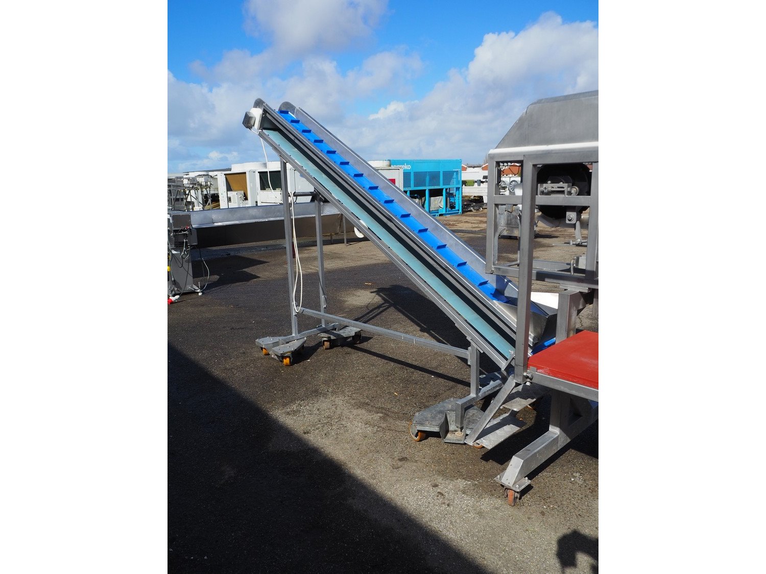 Systemate elevating belt, plastic belt with dividers, belt width: 300 mm, distance between dividers: 210 mm, divider height: 30 mm, elevating height: 2200 mm, total dimensions: 3100 mm x 650 mm x 2400 mm. Kavel locatie: Pastoorslaan 22, 2182 BX Hillegom, Nederland