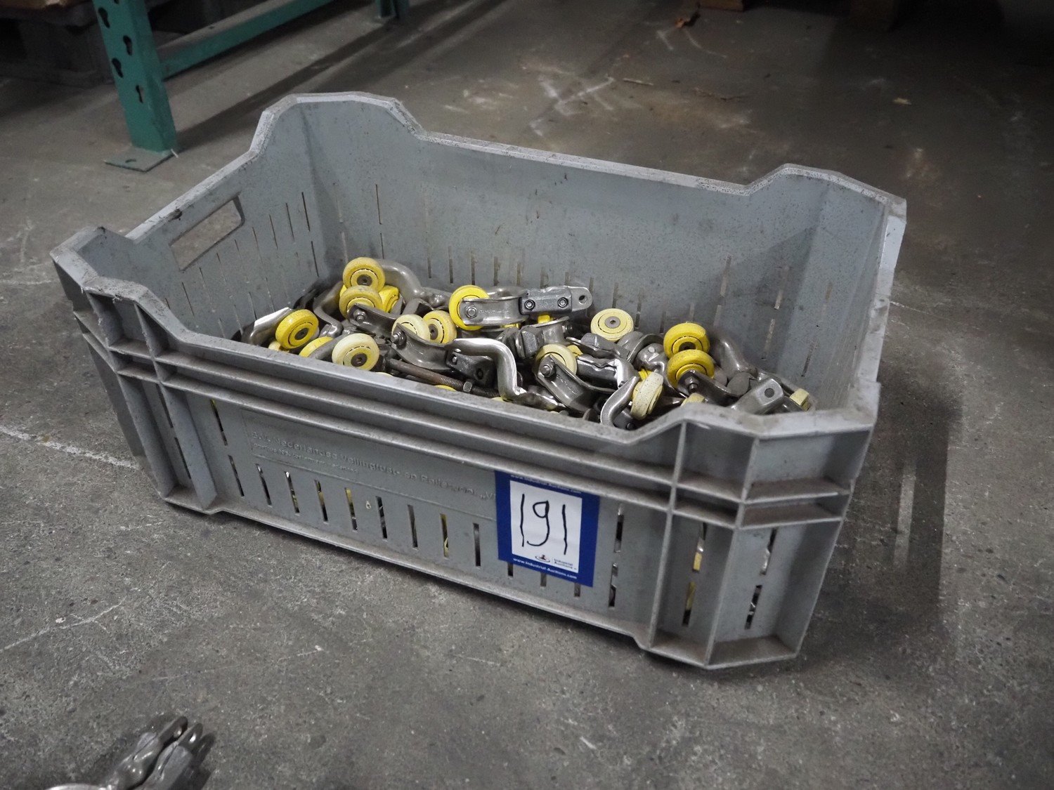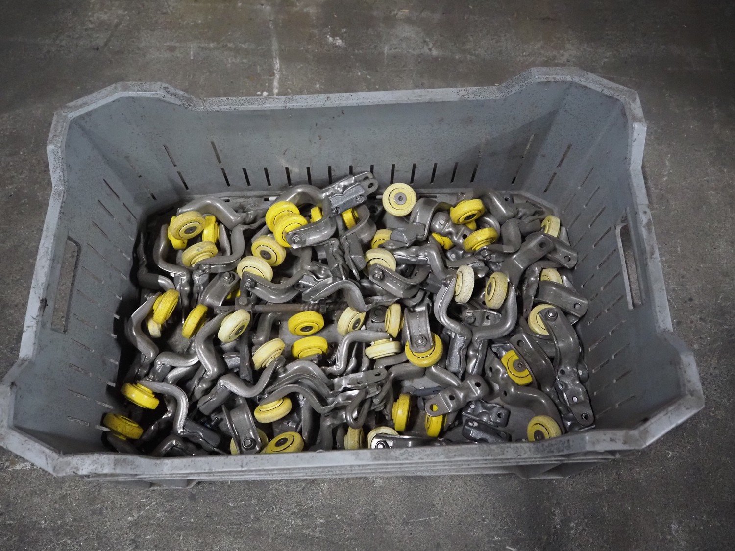 Crate with various trolleys for tube track, dimensions: 600 mm x 400 mm x 200 mm. Kavel locatie: Pastoorslaan 22, 2182 BX Hillegom, Nederland