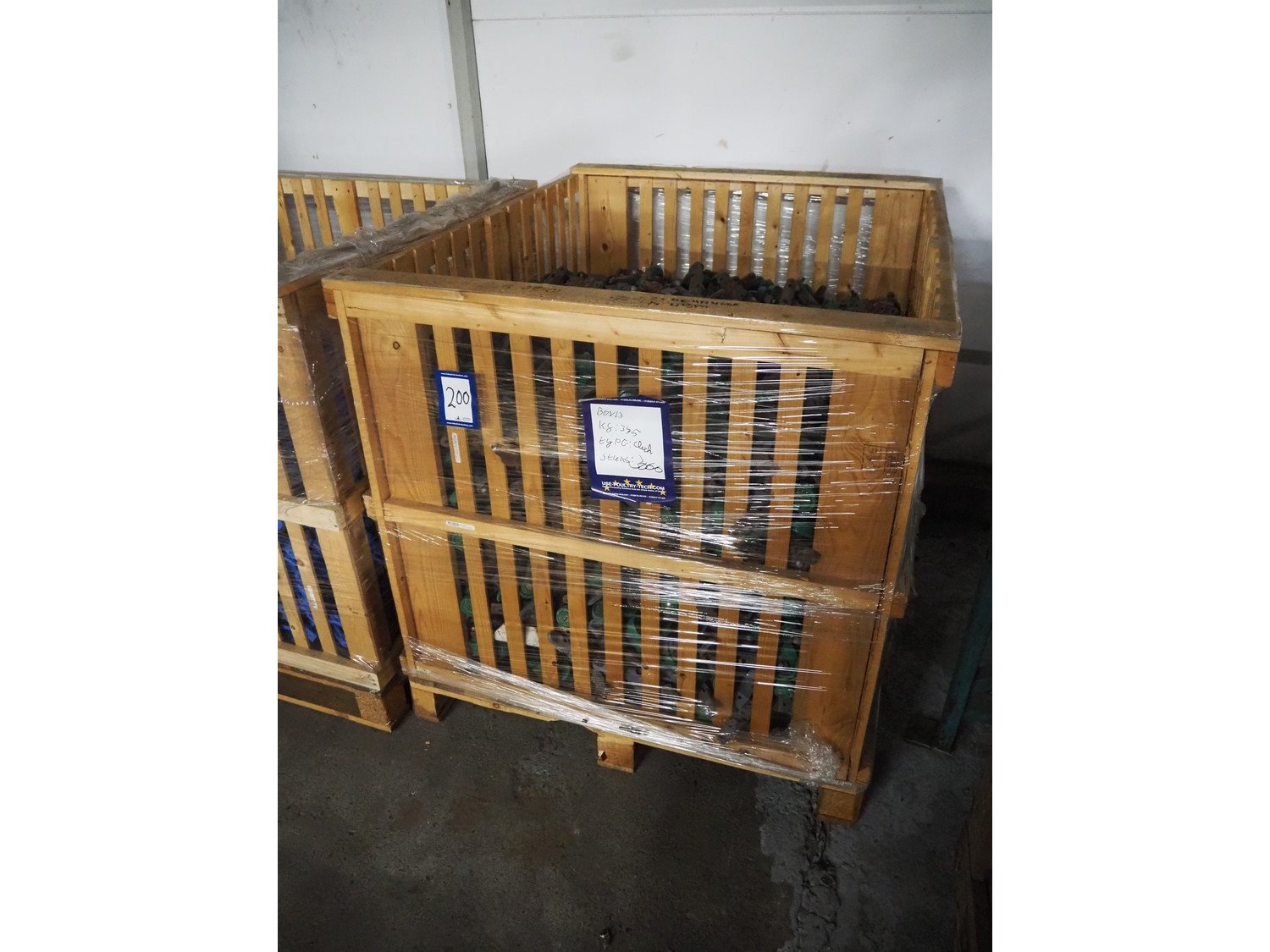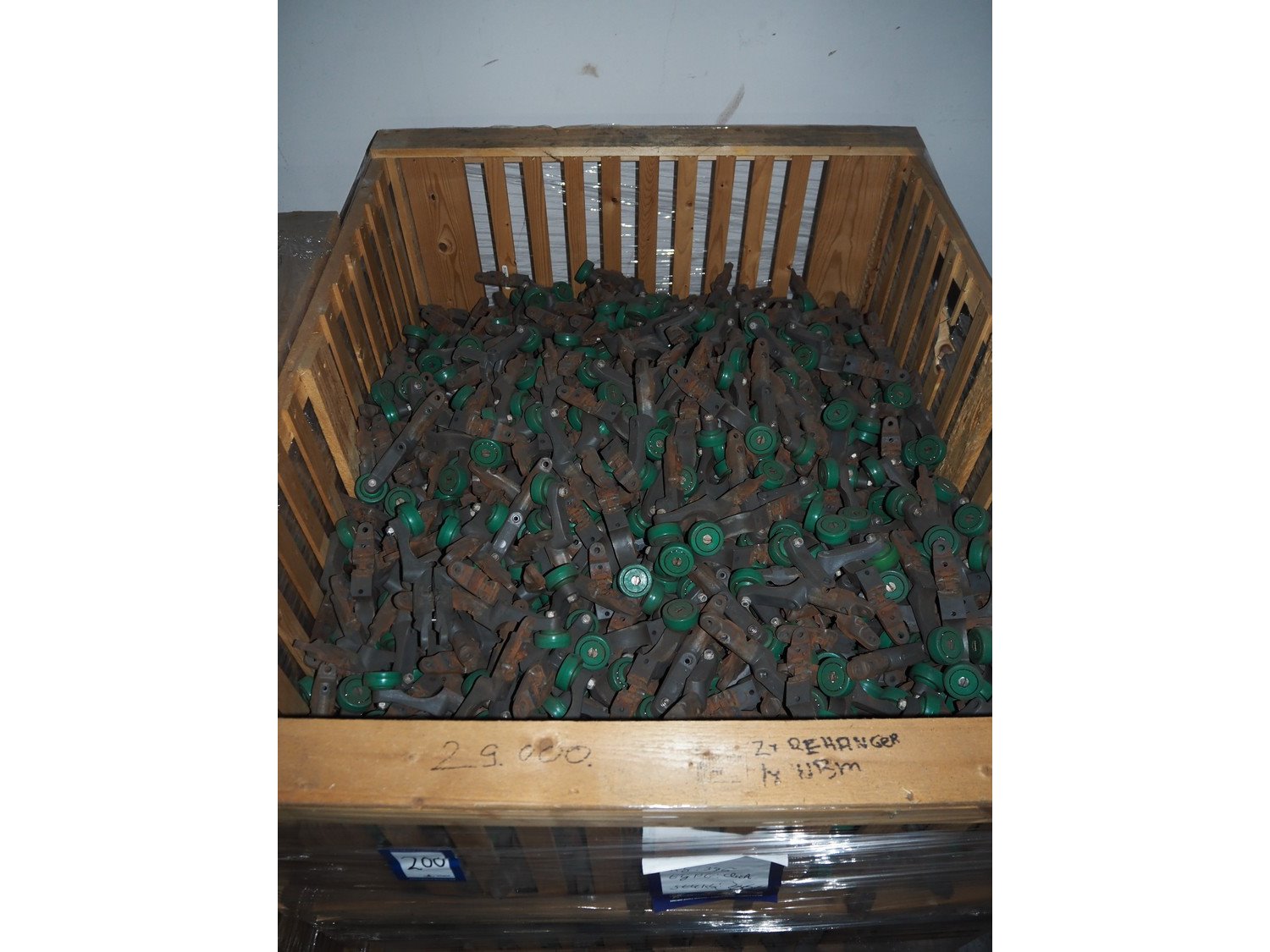 Pallet box with large amount of Meyn trolleys for tube track, 1500 pairs, weight: 375 kg, dimensions: 1200 mm x 760 mm x 580 mm. Kavel locatie: Pastoorslaan 22, 2182 BX Hillegom, Nederland