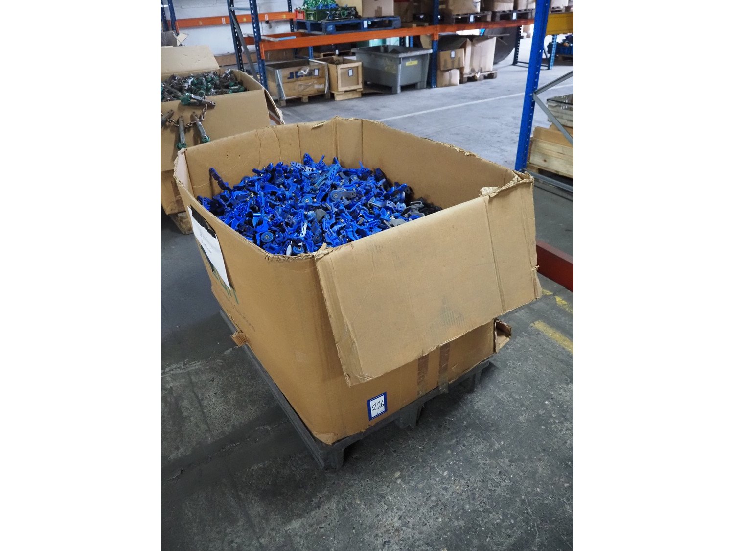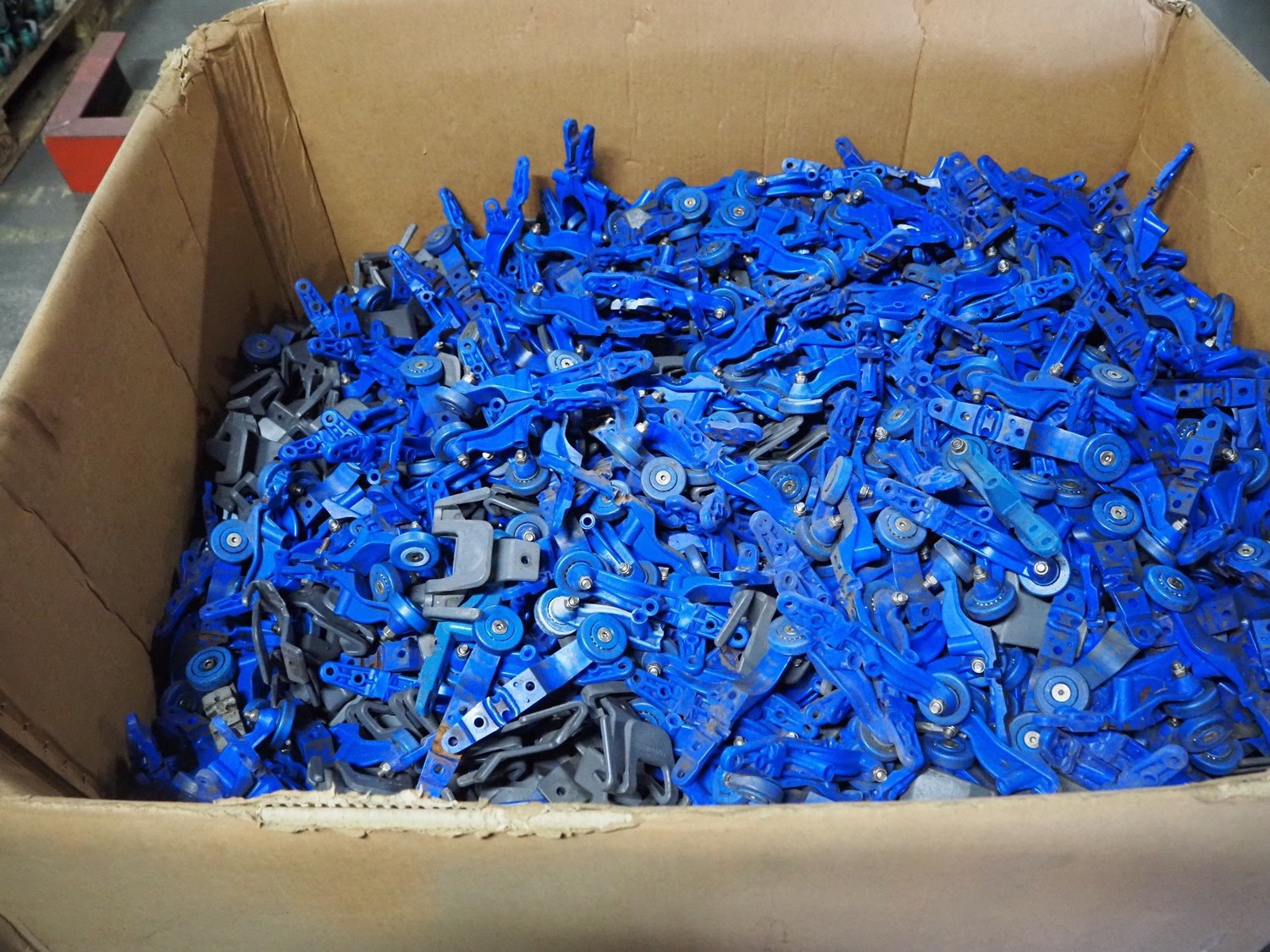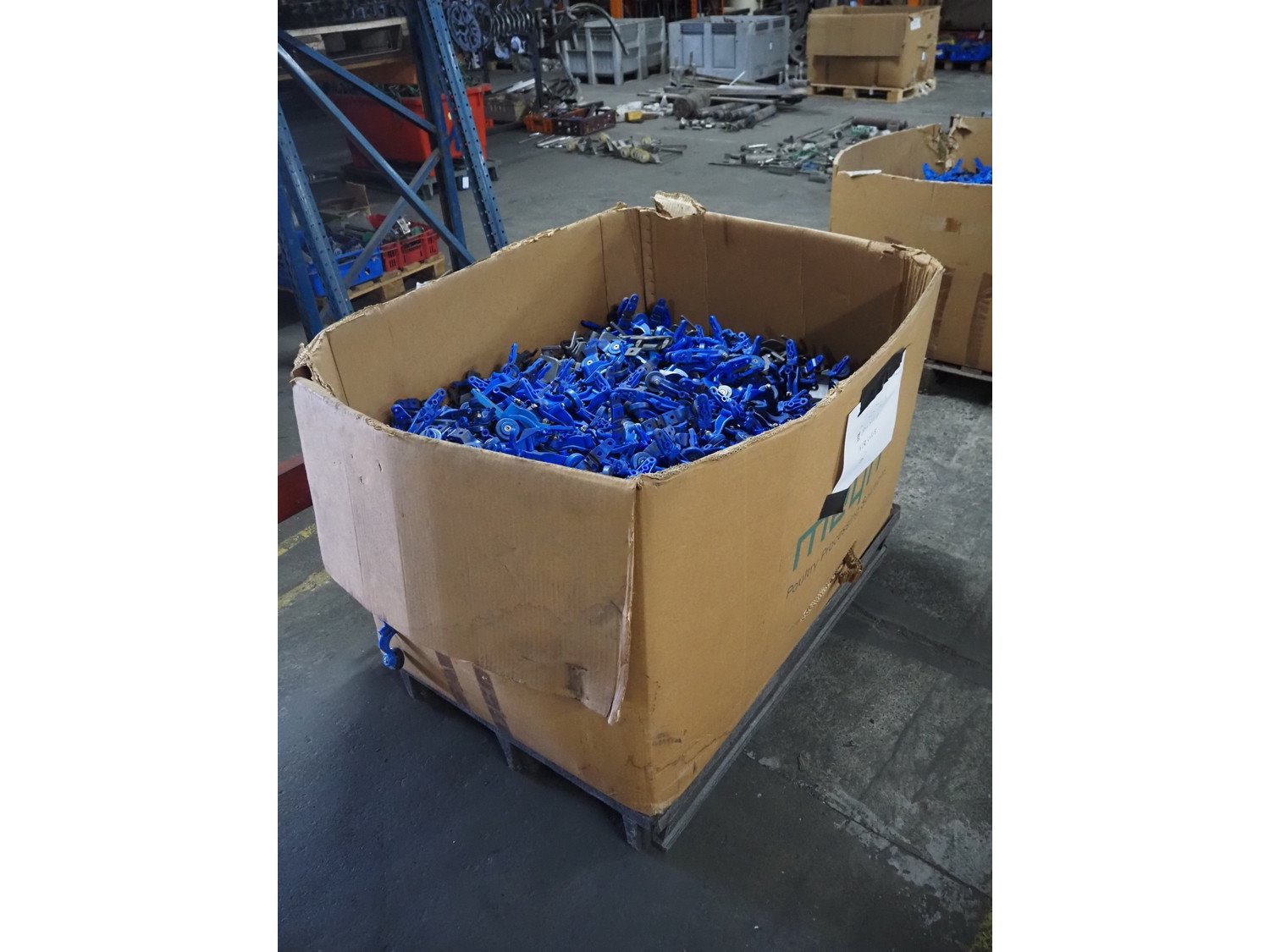 Pallet box with large amount of Foodmate trolleys for tube track, 800 pairs, weight: 245 kg, dimensions: 1300 mm x 1200 mm x 900 mm. Kavel locatie: Pastoorslaan 22, 2182 BX Hillegom, Nederland