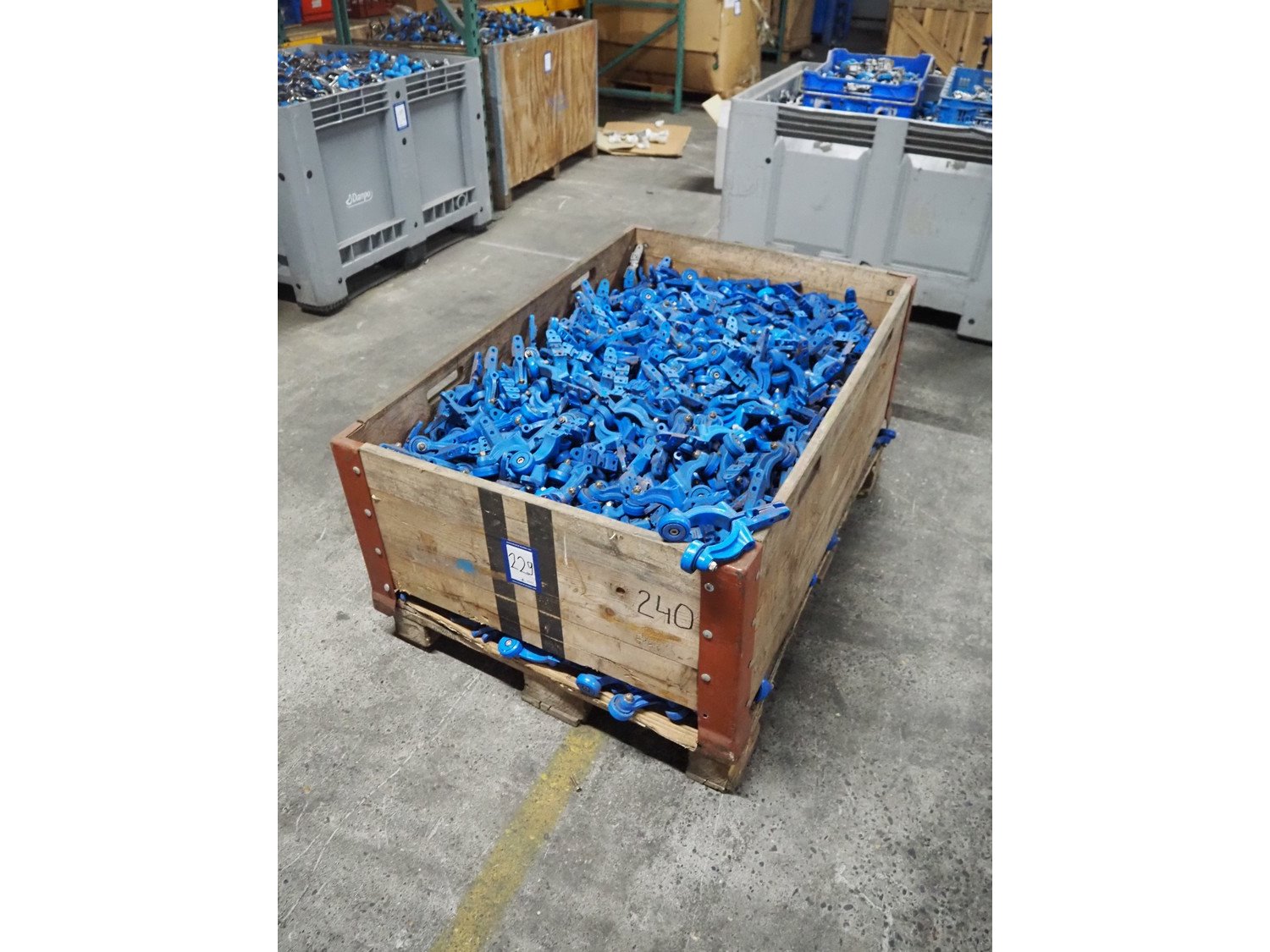 Crate with large amount of trolleys for tube track, dimensions: 1200 mm x 800 mm x 570 mm. Kavel locatie: Pastoorslaan 22, 2182 BX Hillegom, Nederland