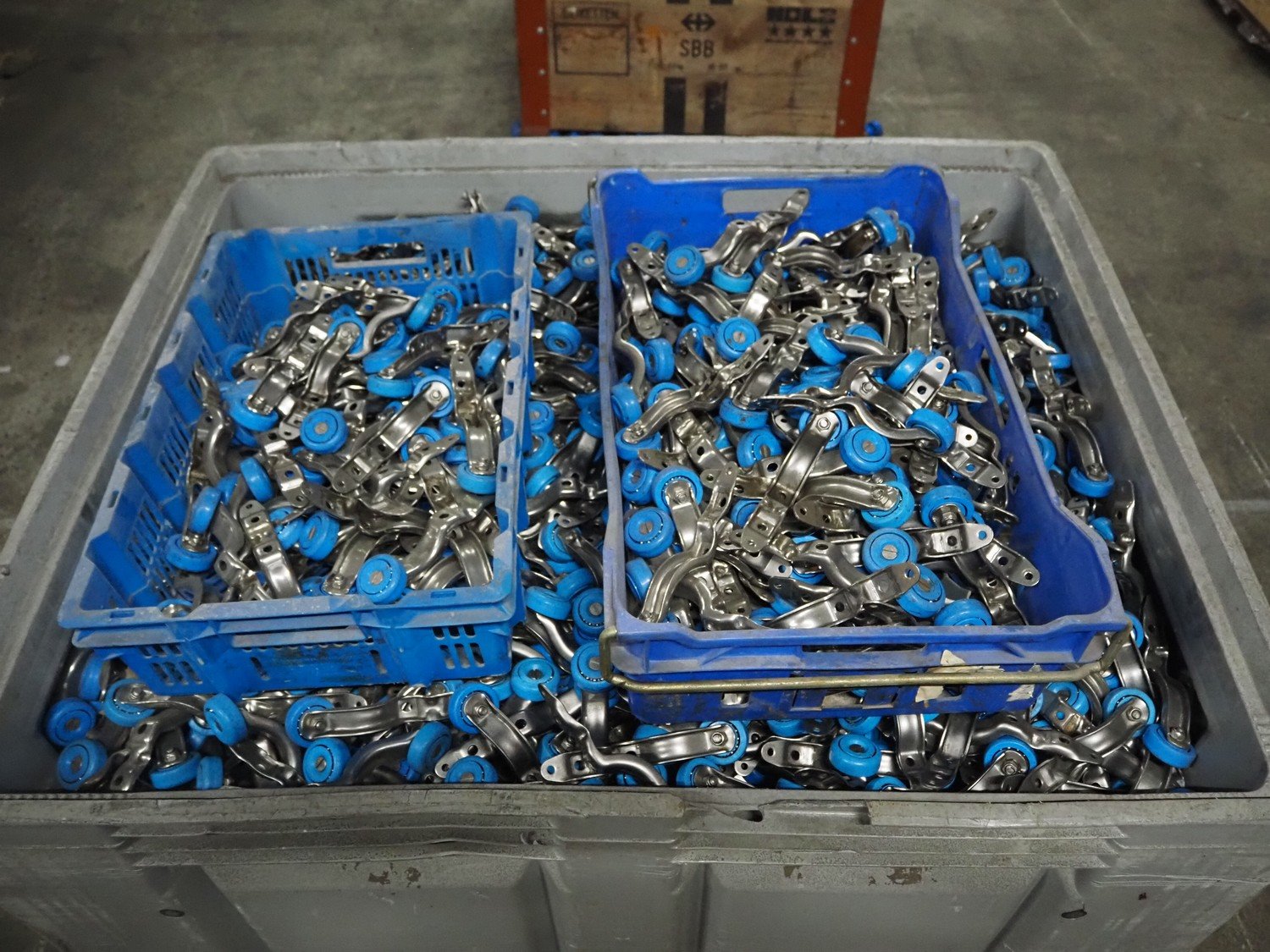 Pallet box with large amount of s/s Linco trolleys for tube track, dimensions: 1200 mm x 1000 mm x 900 mm. Kavel locatie: Pastoorslaan 22, 2182 BX Hillegom, Nederland