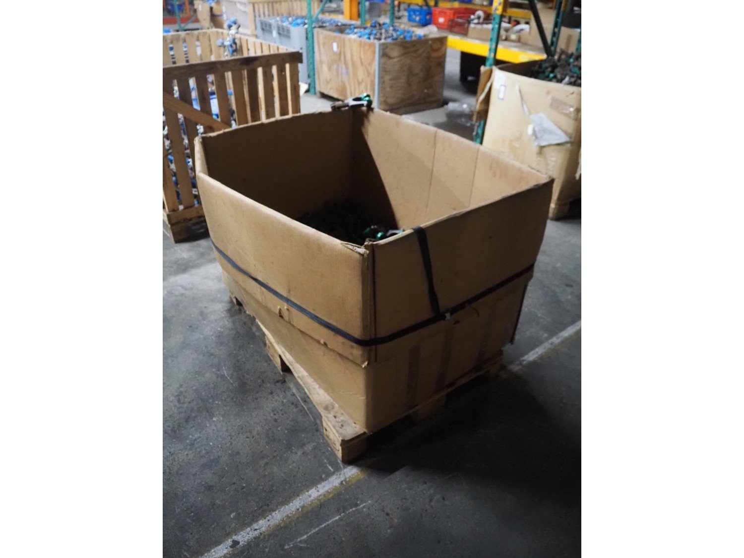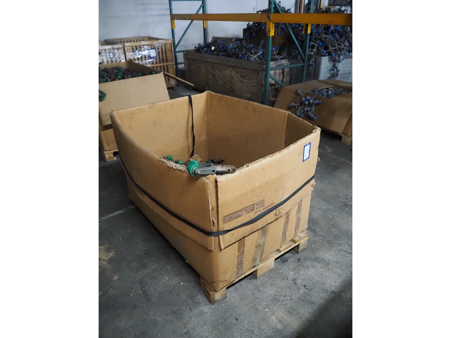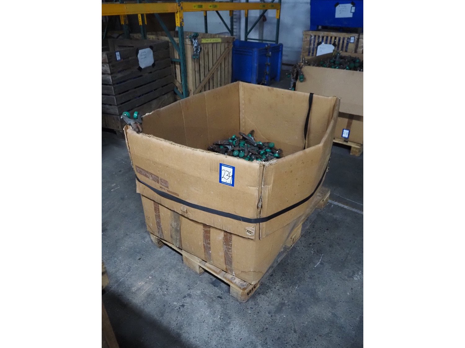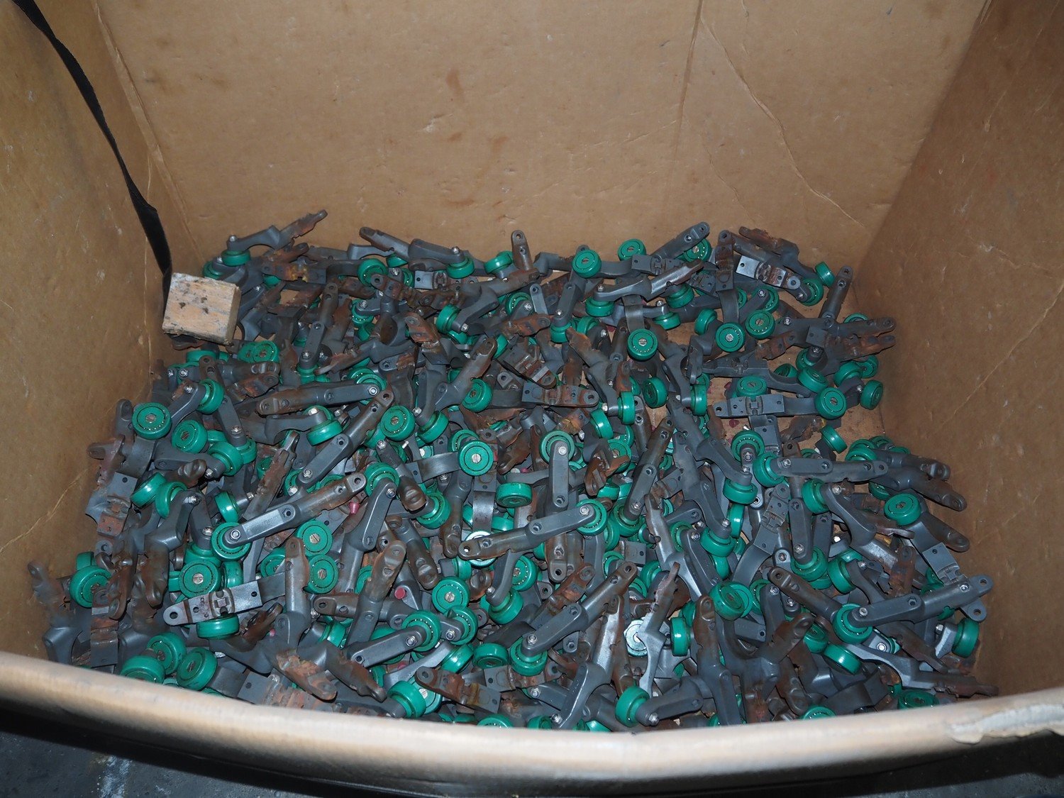 Crate with large amount of Meyn trolleys for tube track, dimensions: 1200 mm x 800 mm x 750 mm. Kavel locatie: Pastoorslaan 22, 2182 BX Hillegom, Nederland