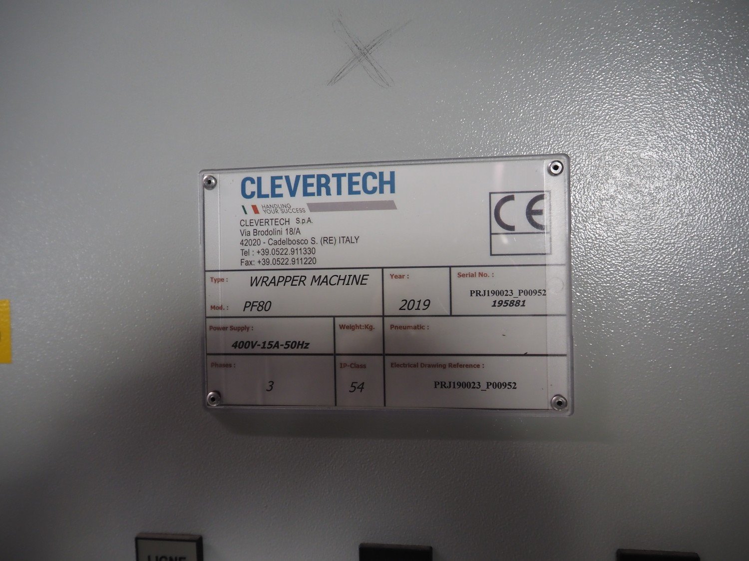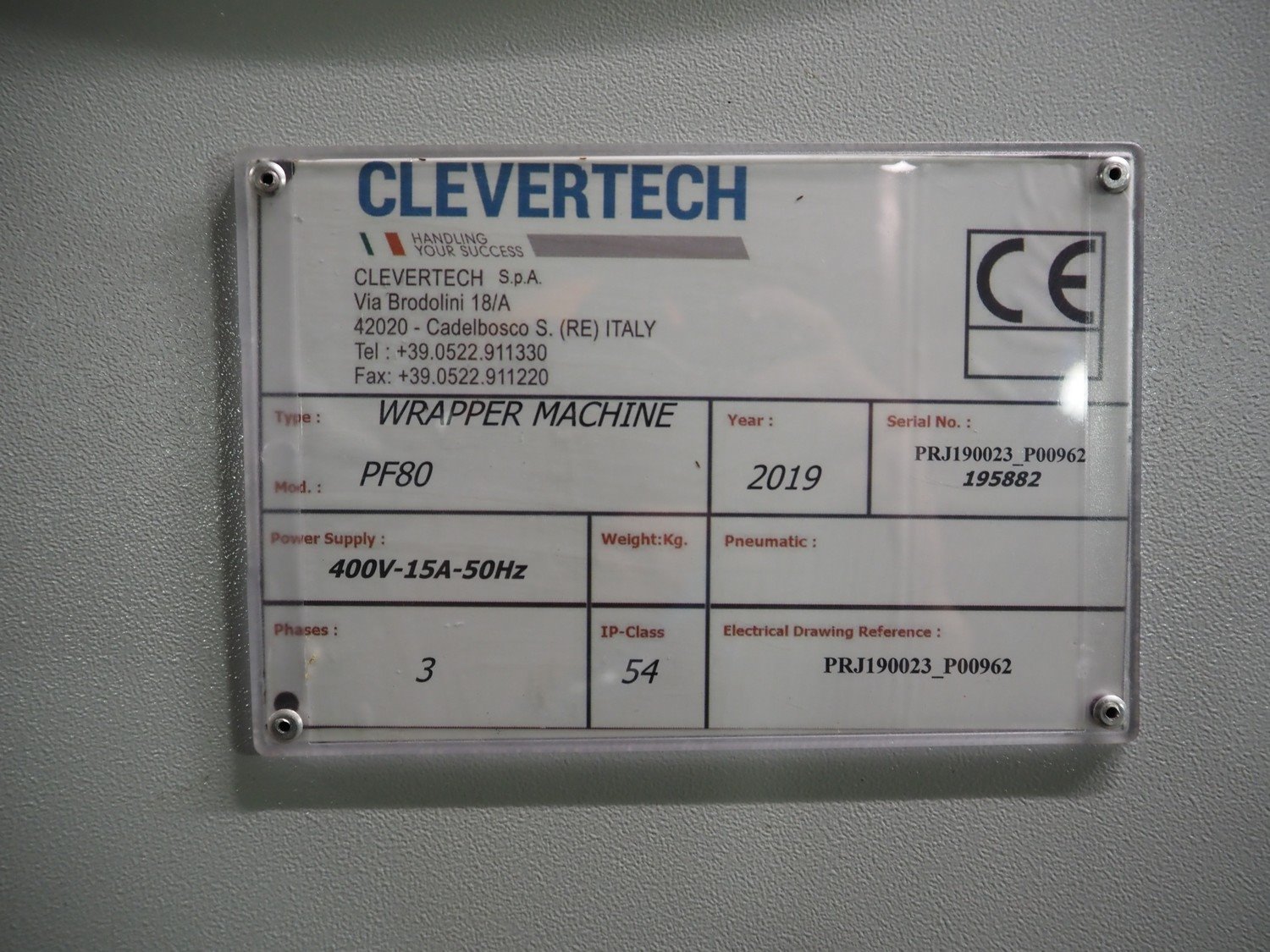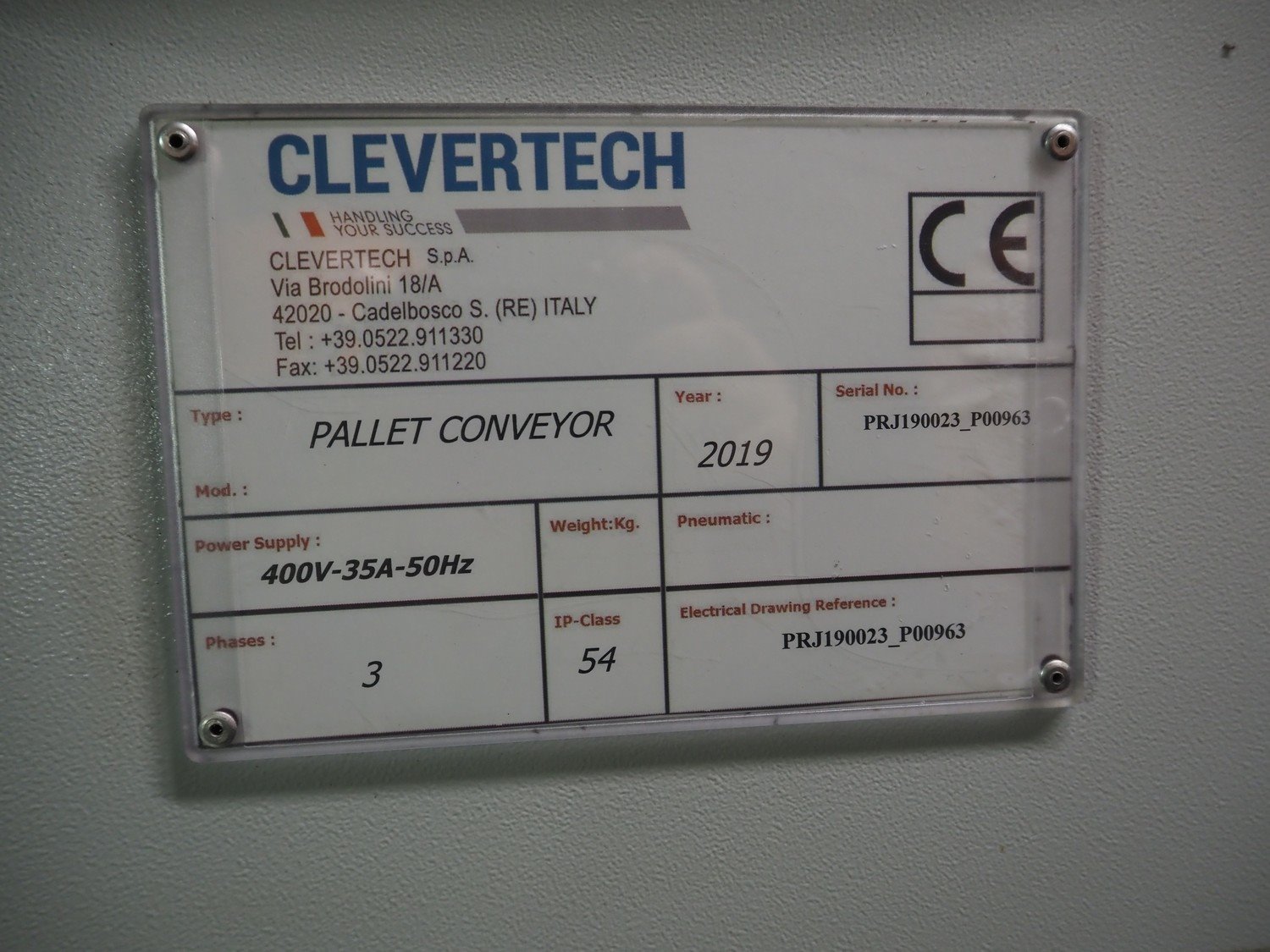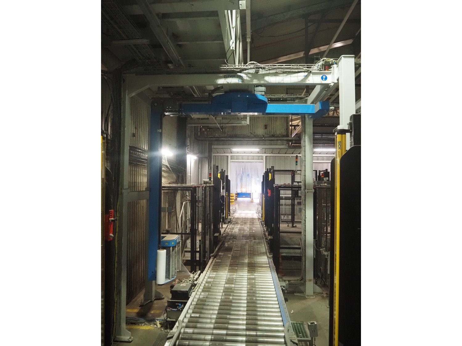 Clevertech pallet wrapping and labelling installation consisting of: Clevertech pallet wrapper, model: PF80, serial number: 195882, year of construction: 2019, 400 V, 3 Ph, 50 Hz, 15 A, Clevertech pallet wrapper, model: PF80, serial number: 195881, year of construction: 2019, 400 V, 3 Ph, 50 Hz, 15 A, 2 pallet labellers, Clevertech conveyor system, year of construction: 2019, 400 V, 3 Ph, 50 Hz, 35 A, s/s rollers, roller width: 1200 mm, 2 steel switch cabinets, dimensions: 5600 mm x 500 mm x 2200 mm and 3800 mm x 500 mm x 2200 mm. total floors dimensions: 18000 mm x 10000 mm. Kavel locatie: Parc Entreprise Motte du Bois, 62440 Harnes, Frankrijk