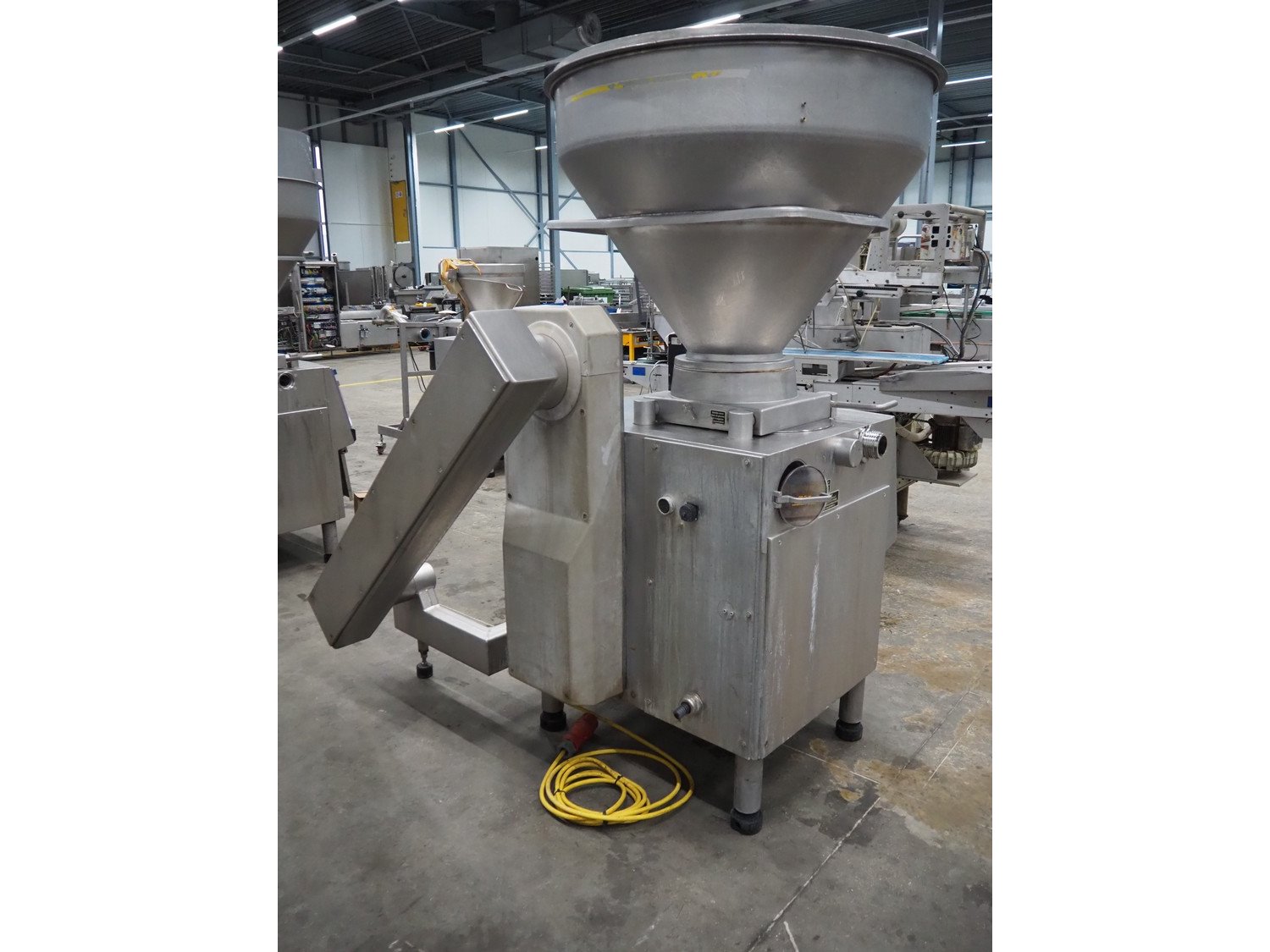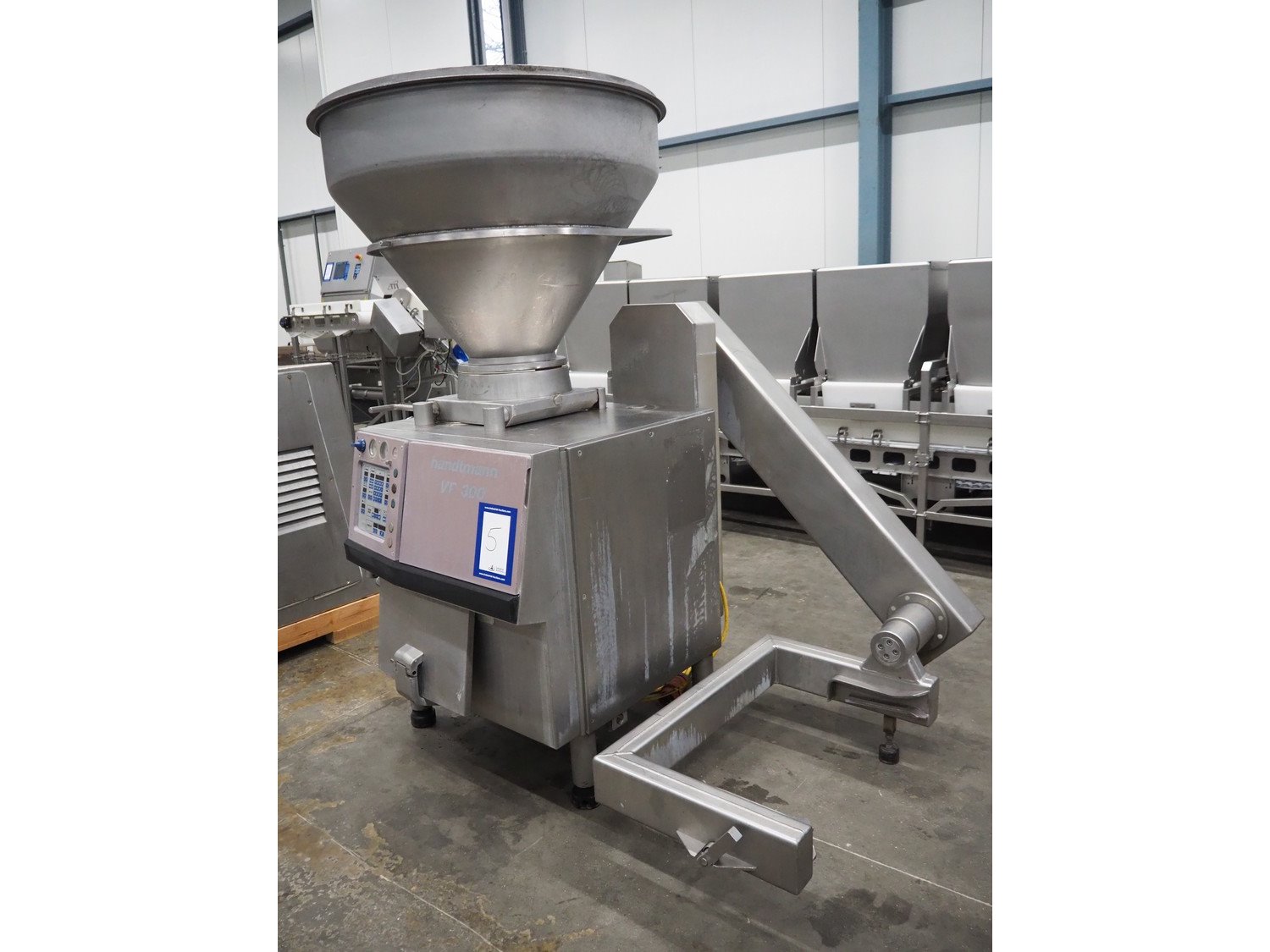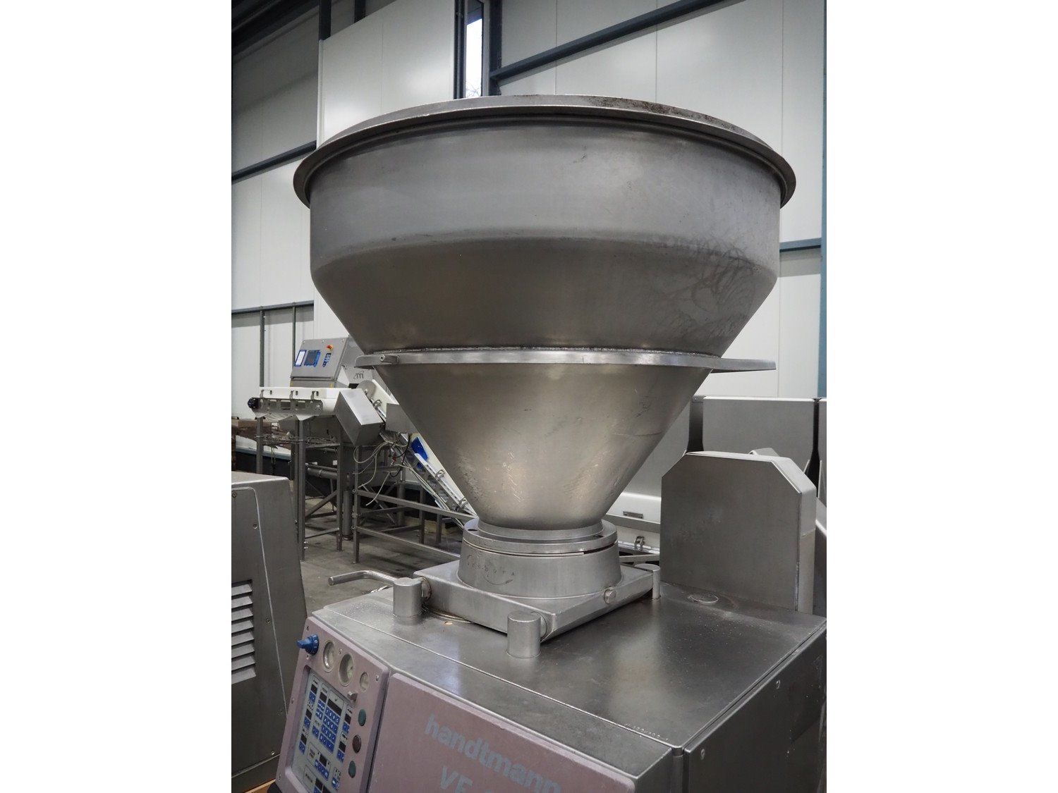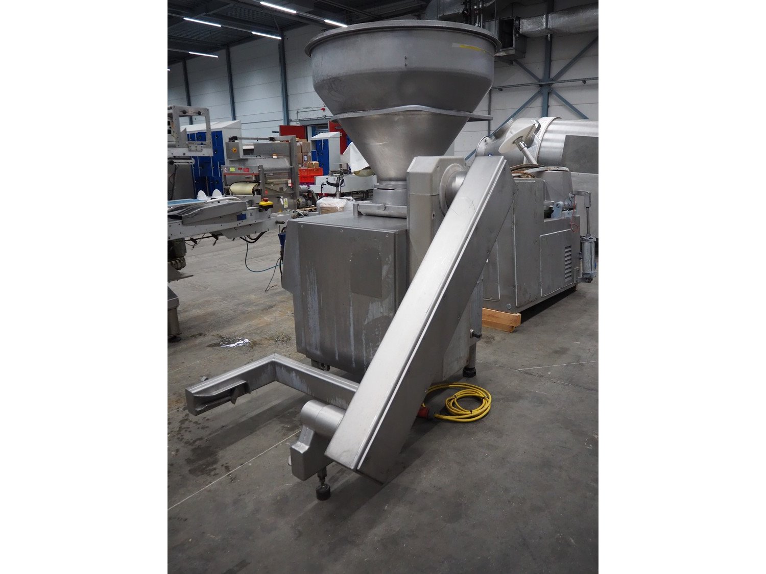 Handtmann vacuum filling machine with lifter for meat bins, type: VF300 B, number: 700, 420 V, 50 Hz, 23.6 A, 9.5 kW, dimensions: 1700 mm x 1300 mm x 2020 mm. Kavel locatie: Schouwrooij 29, 5281 RE Boxtel, Nederland