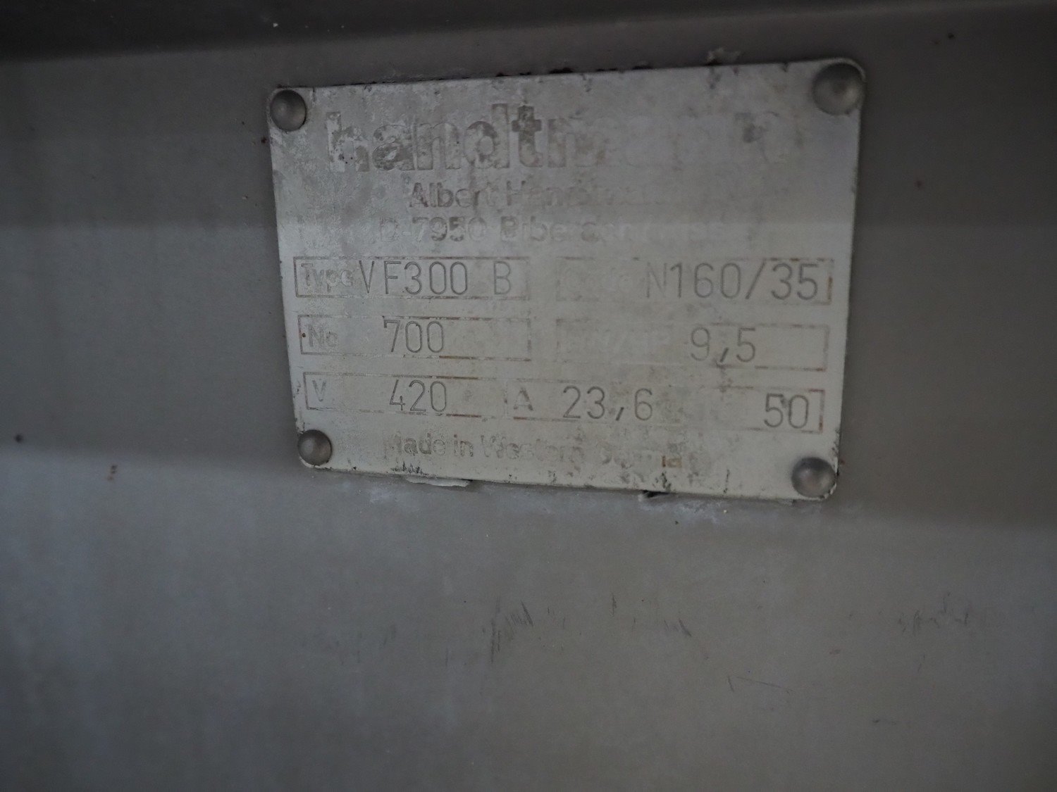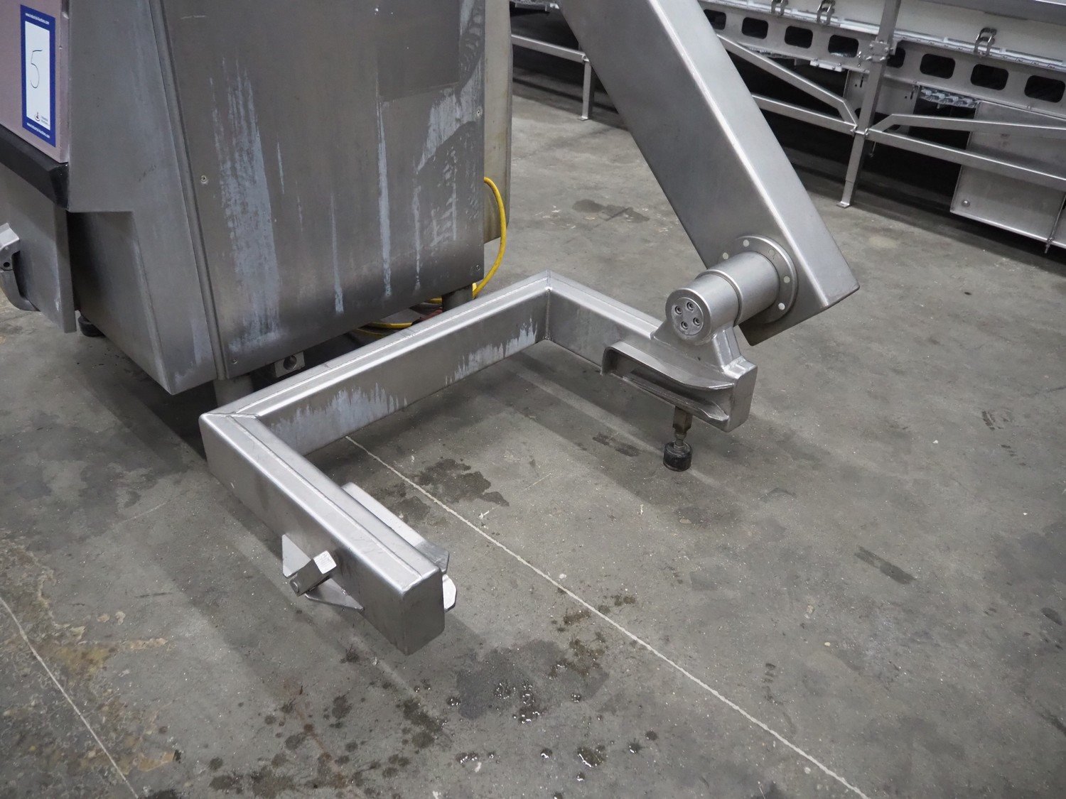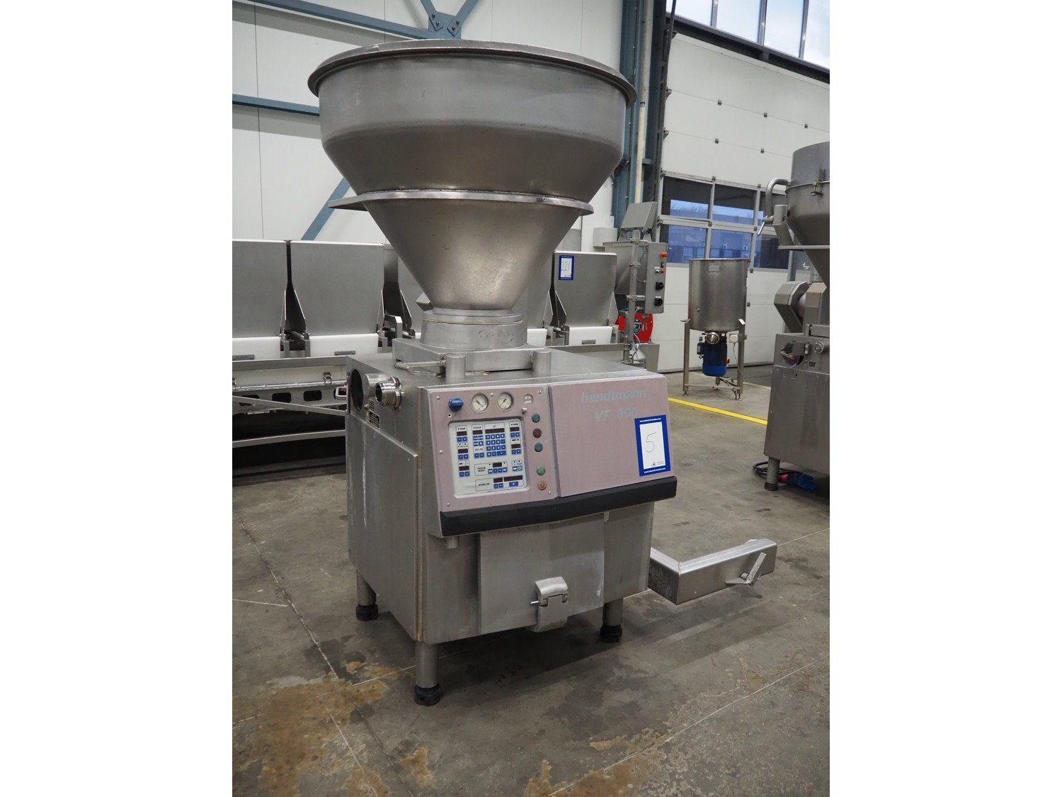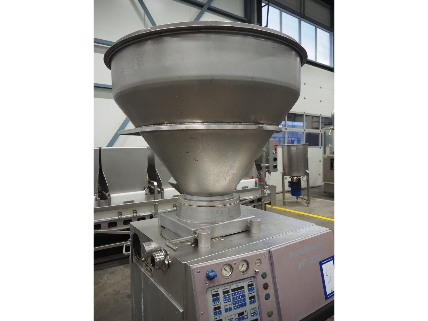 Handtmann vacuum filling machine with lifter for meat bins, type: VF300 B, number: 700, 420 V, 50 Hz, 23.6 A, 9.5 kW, dimensions: 1700 mm x 1300 mm x 2020 mm. Kavel locatie: Schouwrooij 29, 5281 RE Boxtel, Nederland