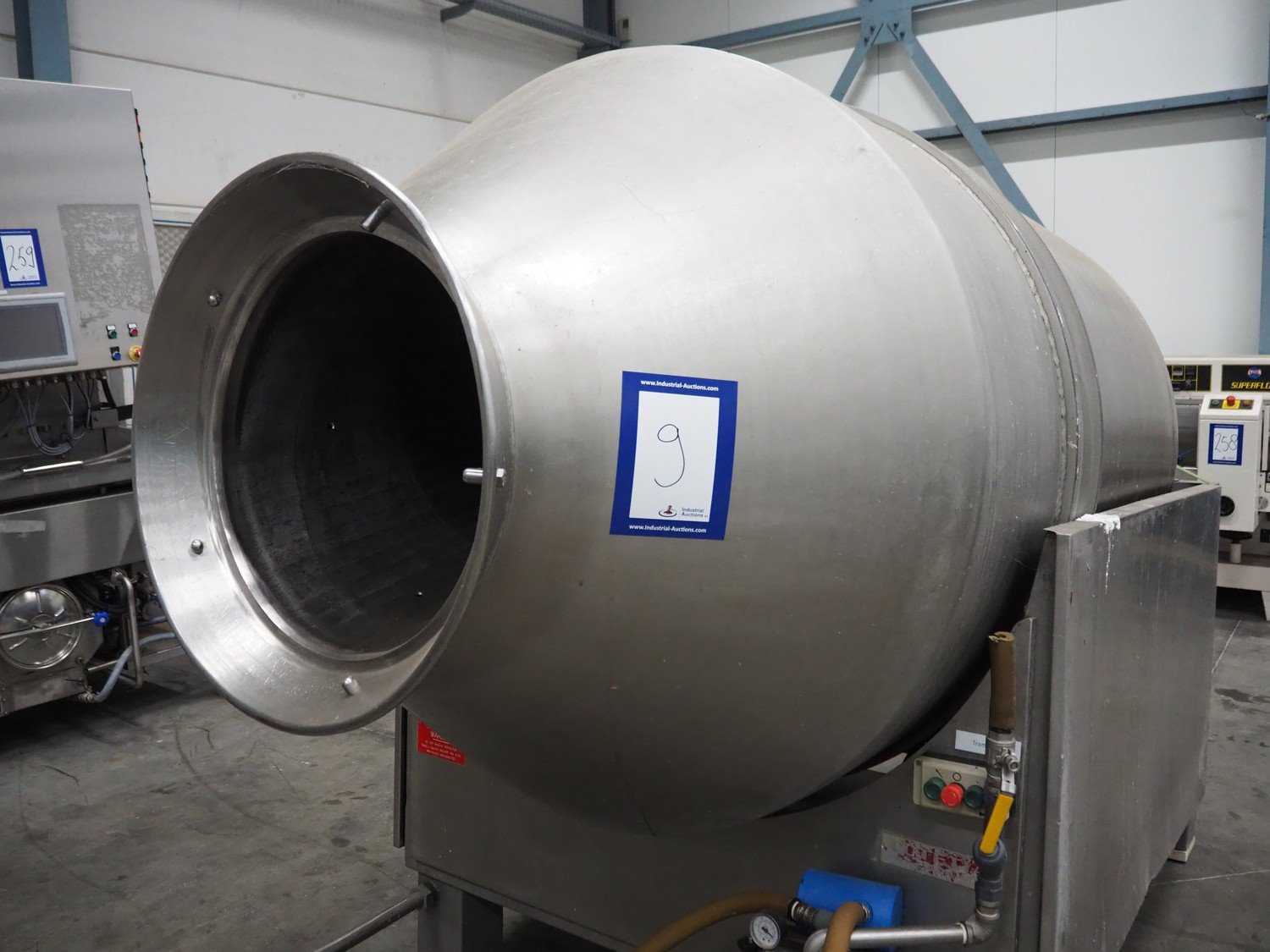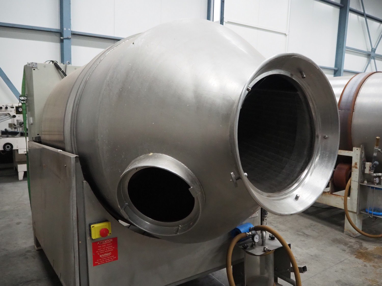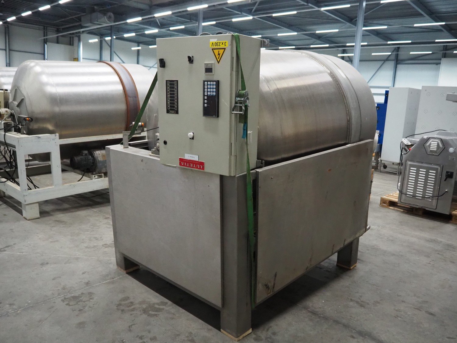 Lutetia vacuum tumbler, serial number: 7666, 3 Ph, 220 V, dimensions drum: Ø 1300 mm x 1600 mm, total dimensions: 2900 mm x 1450 mm x 1950 mm. Without vacuum pump, missing 1 lid. Kavel locatie: Schouwrooij 29, 5281 RE Boxtel, Nederland