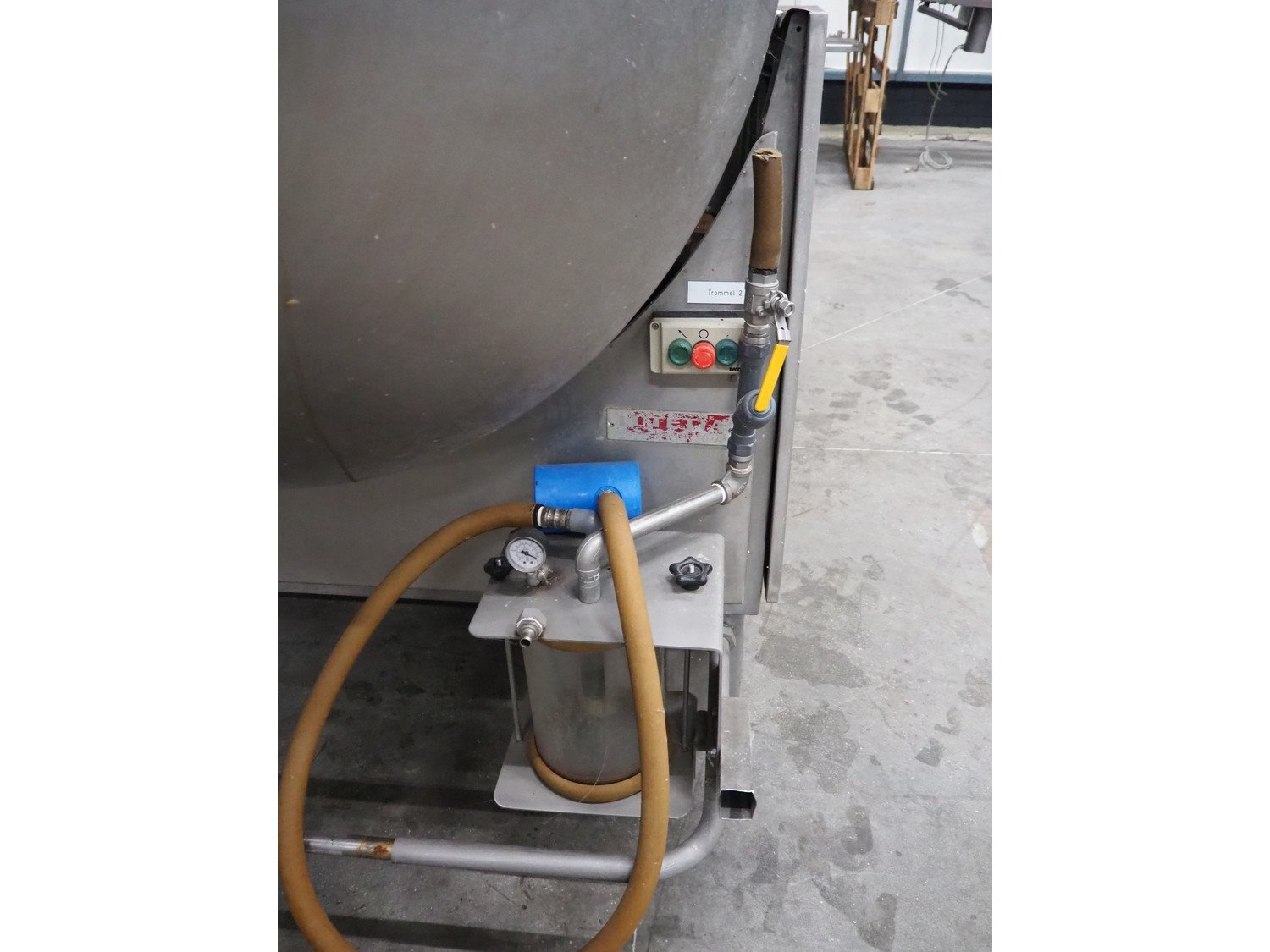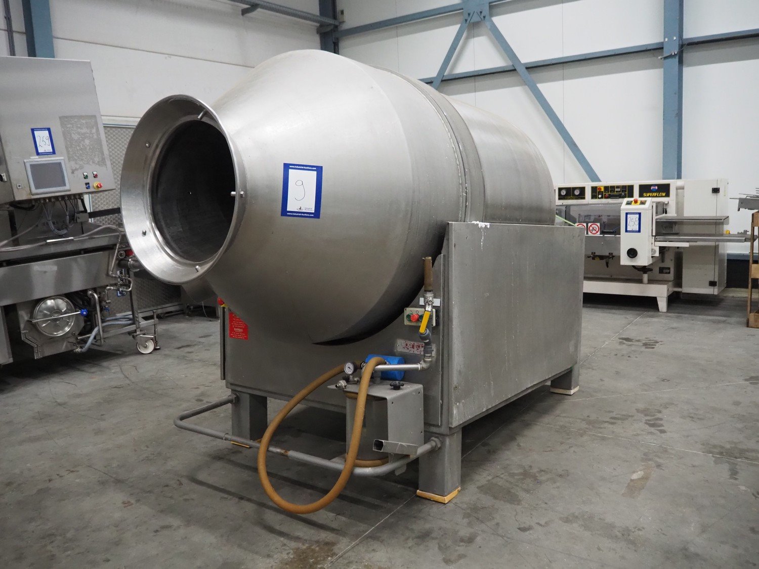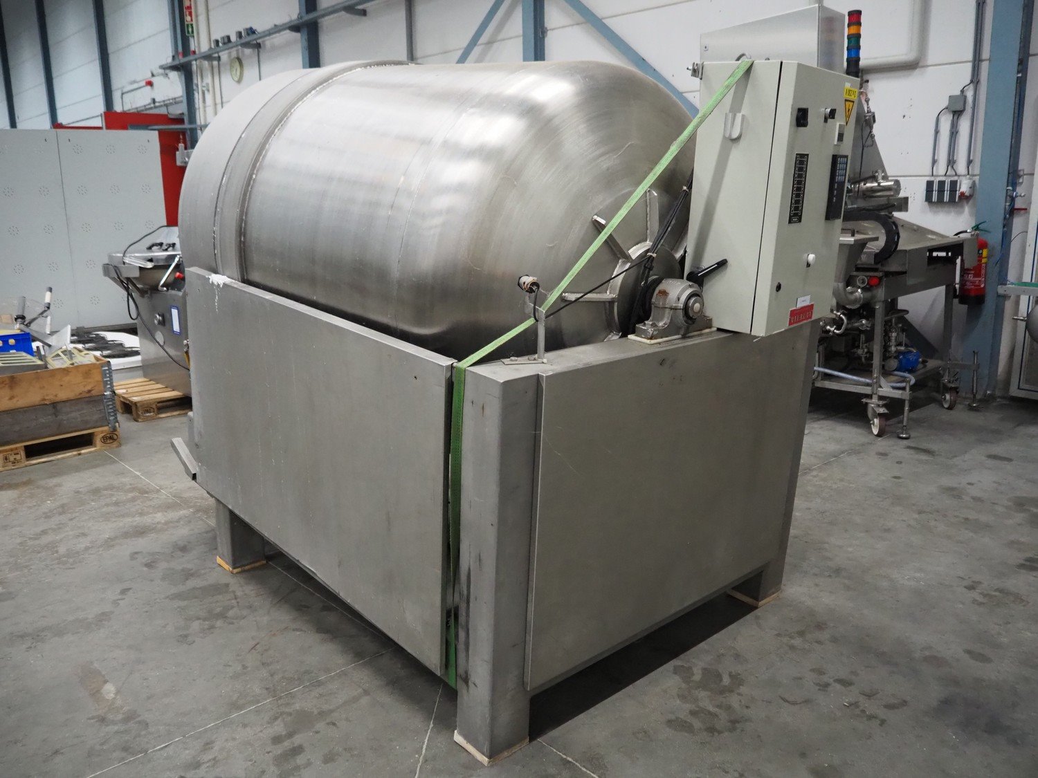 Lutetia vacuum tumbler, serial number: 7666, 3 Ph, 220 V, dimensions drum: Ø 1300 mm x 1600 mm, total dimensions: 2900 mm x 1450 mm x 1950 mm. Without vacuum pump, missing 1 lid. Kavel locatie: Schouwrooij 29, 5281 RE Boxtel, Nederland