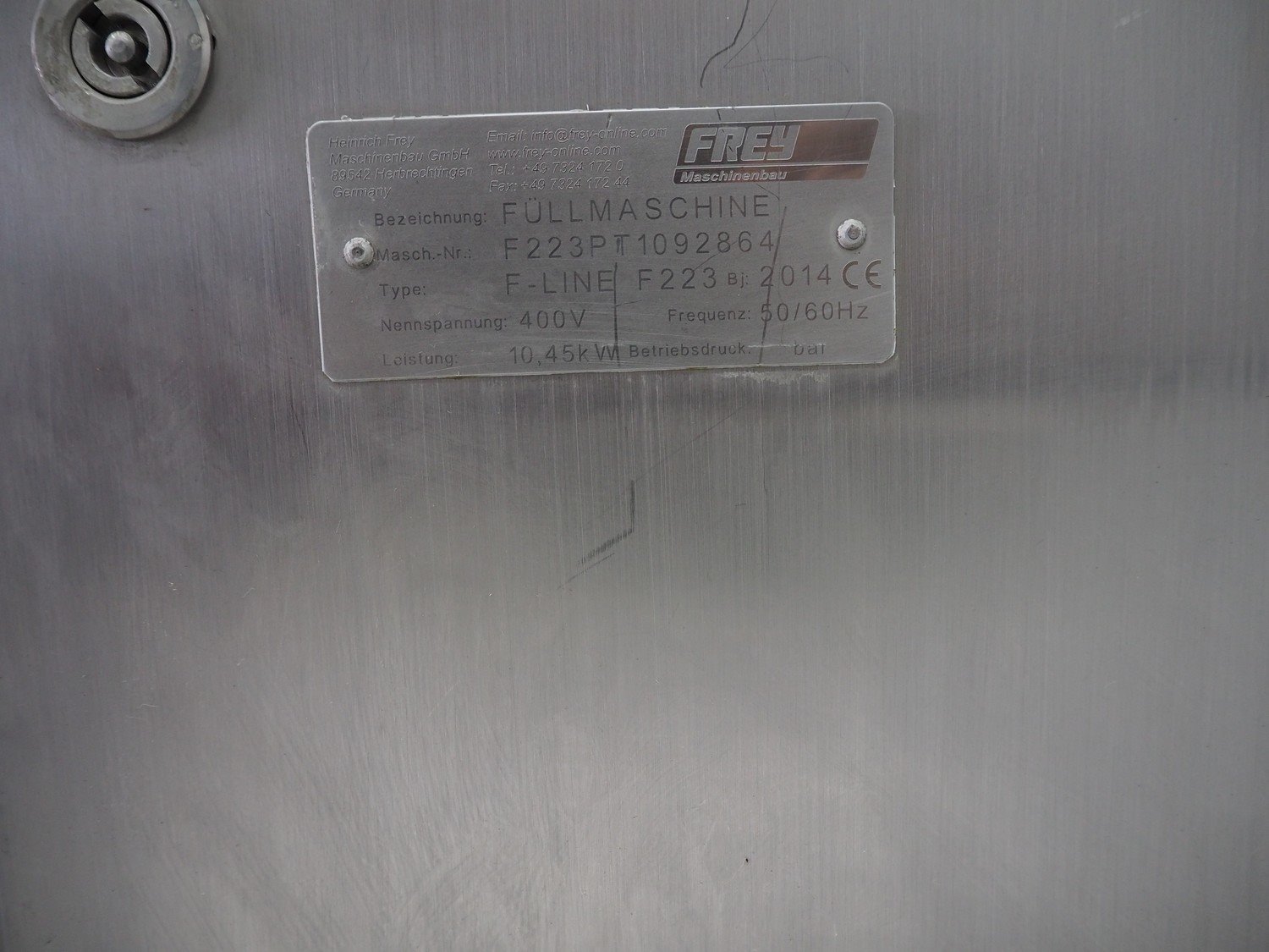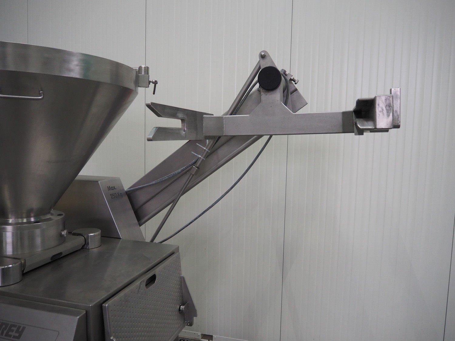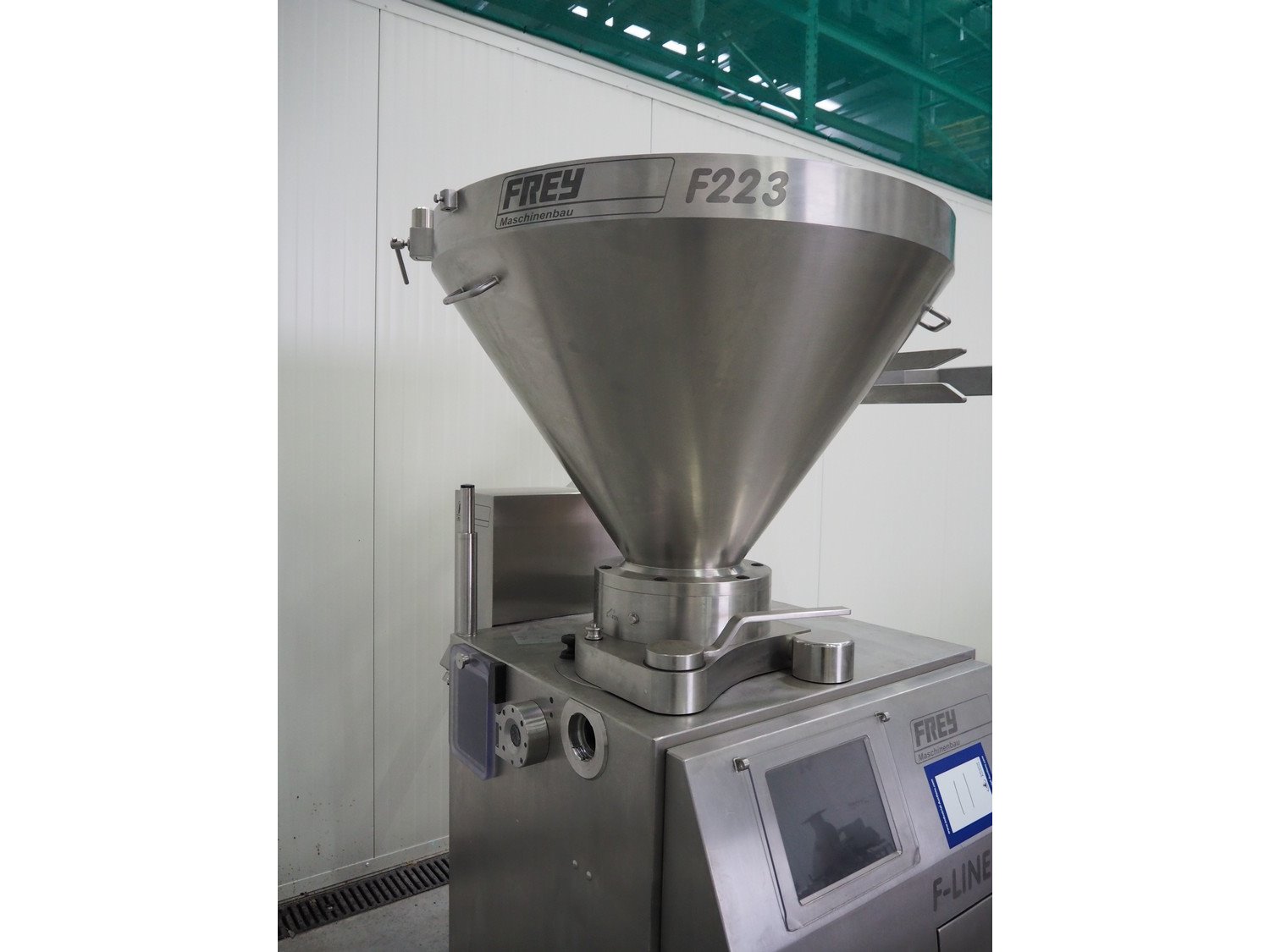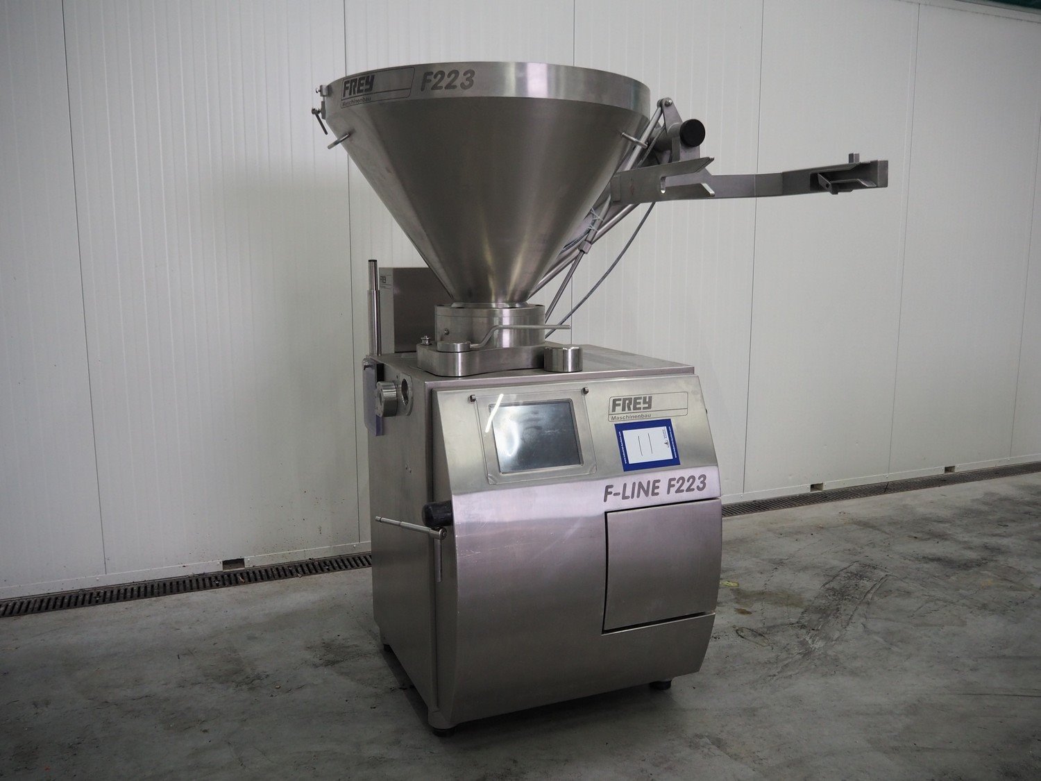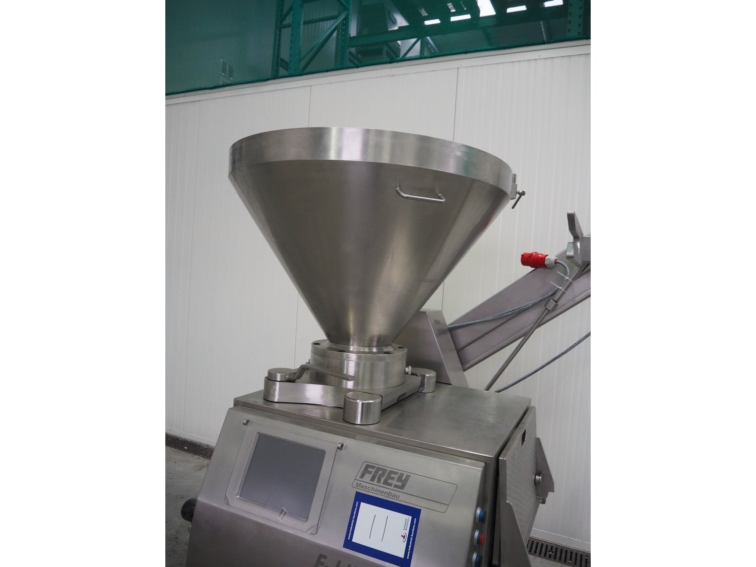 Frey Maschinenbau vacuum filling machine with lifter for 200 liter meat bins, type: F-Line F223, machine number: F223PT1092864, year of construction: 2014, 400 V, 50/60 Hz, 10.45 kW, Busch vacuum pump, type: RC 0021 C 3Z3, serial number: D18180231, year of construction: 2018, capacity: 24 m³ per hour, total dimensions: 2000 mm x 1300 mm x 2100 mm. Including box with various parts. Kavel locatie: Schouwrooij 29, 5281 RE Boxtel, Nederland
