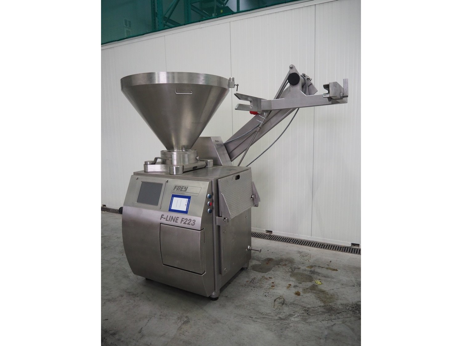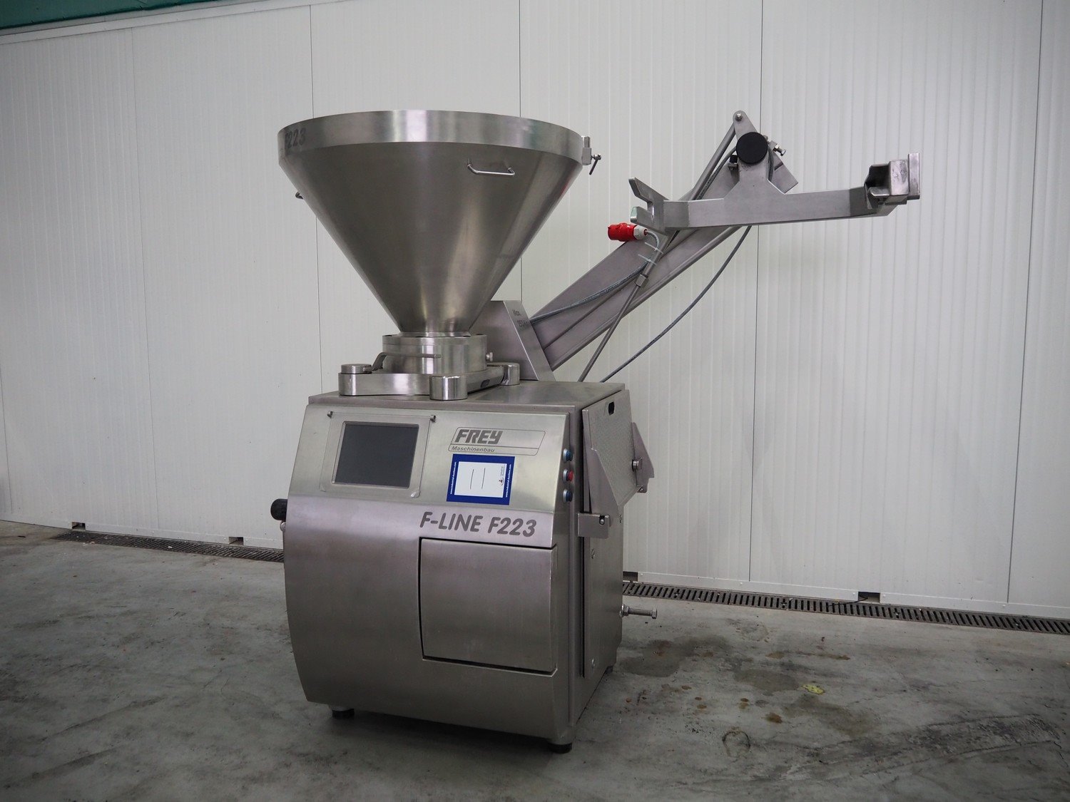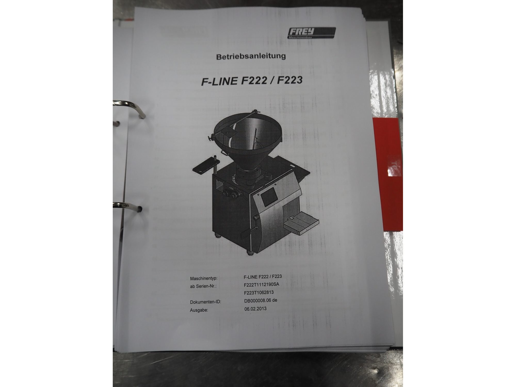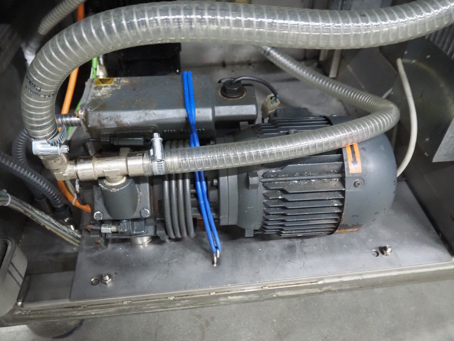 Frey Maschinenbau vacuum filling machine with lifter for 200 liter meat bins, type: F-Line F223, machine number: F223PT1092864, year of construction: 2014, 400 V, 50/60 Hz, 10.45 kW, Busch vacuum pump, type: RC 0021 C 3Z3, serial number: D18180231, year of construction: 2018, capacity: 24 m³ per hour, total dimensions: 2000 mm x 1300 mm x 2100 mm. Including box with various parts. Kavel locatie: Schouwrooij 29, 5281 RE Boxtel, Nederland