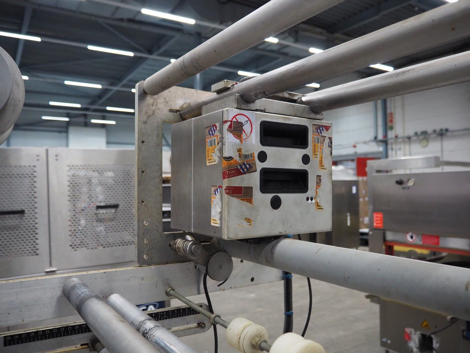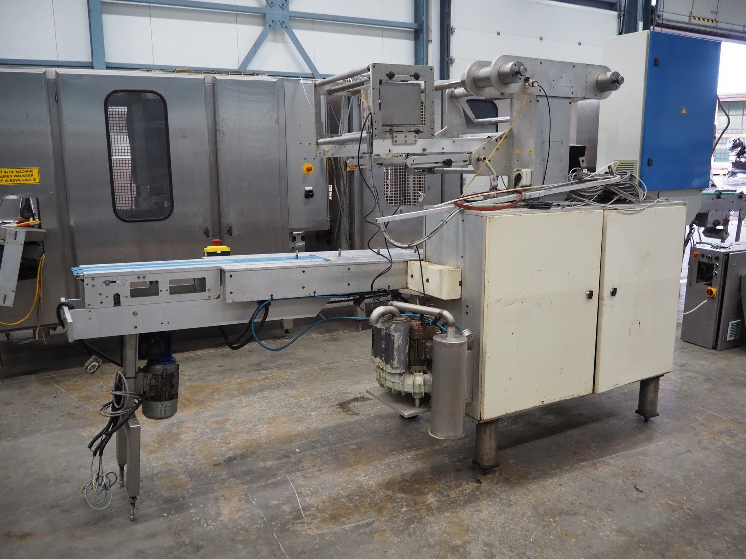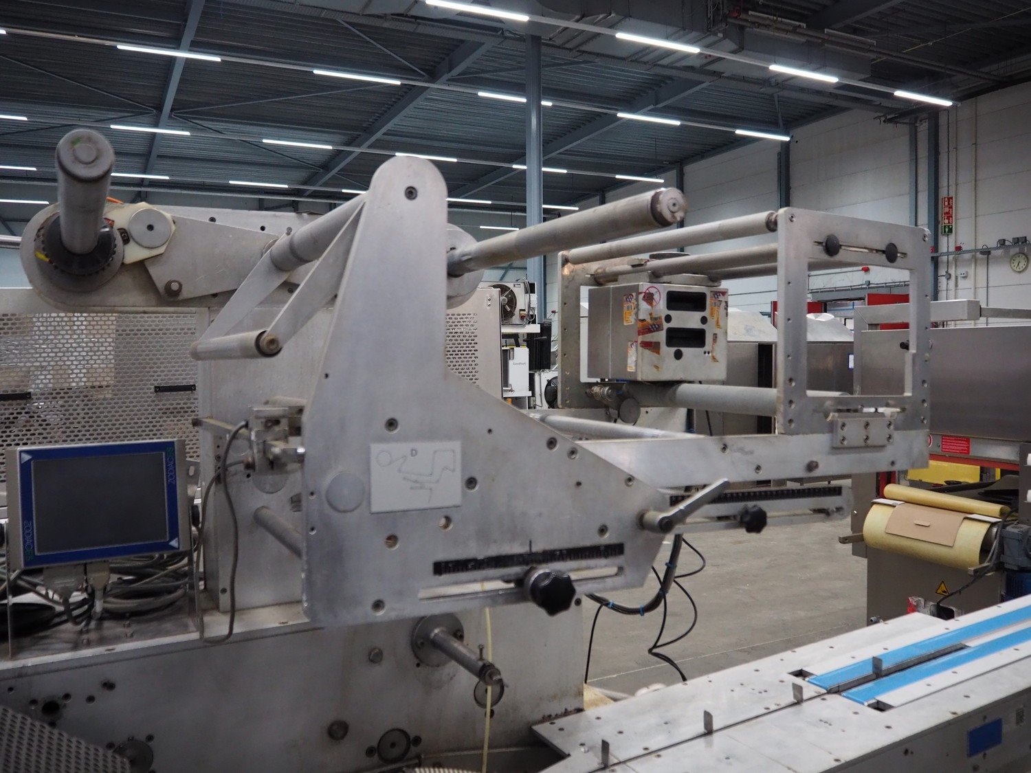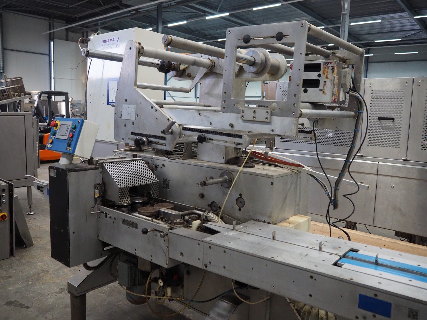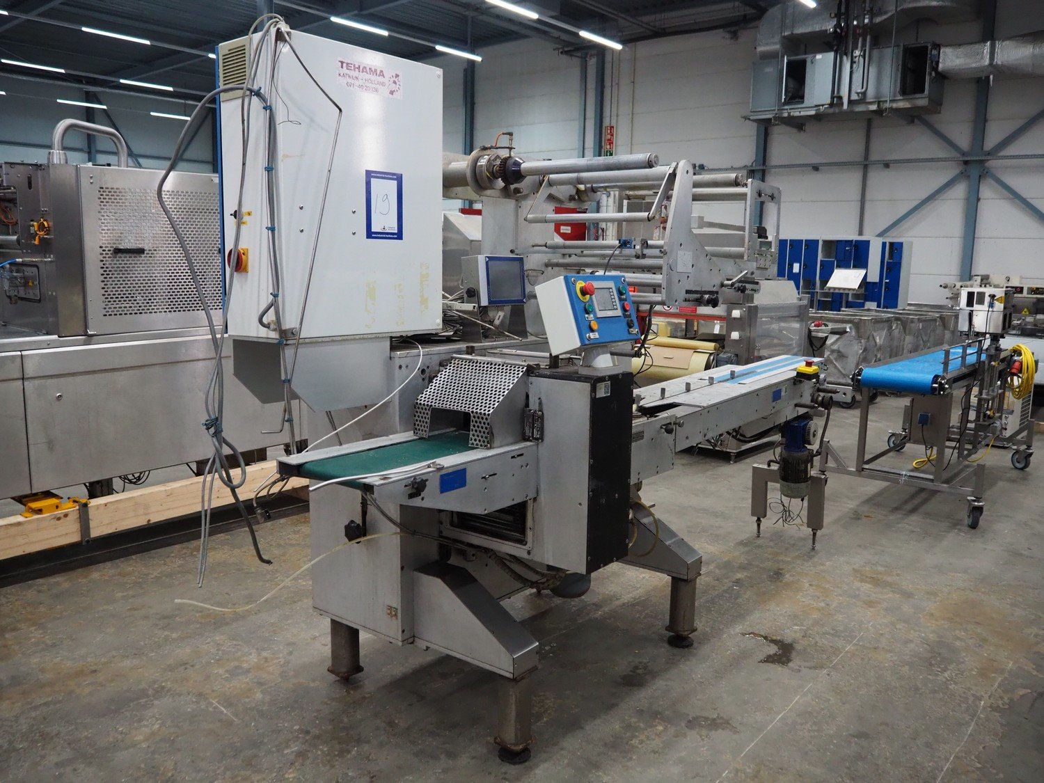 Tevopharm flowpacker with ZodiacES coding attachment, seal width: 190 mm, plastic belt, belt width: 250 mm, total dimensions: 3650 mm x 1150 mm x 2100 mm. Kavel locatie: Schouwrooij 29, 5281 RE Boxtel, Nederland