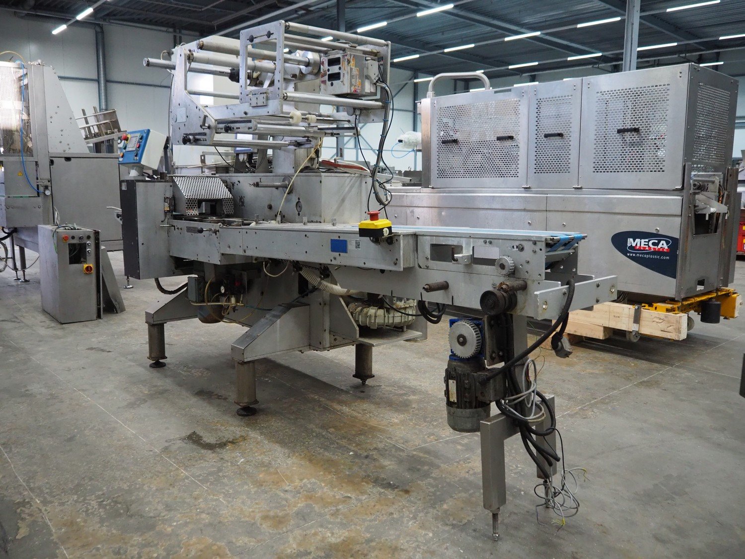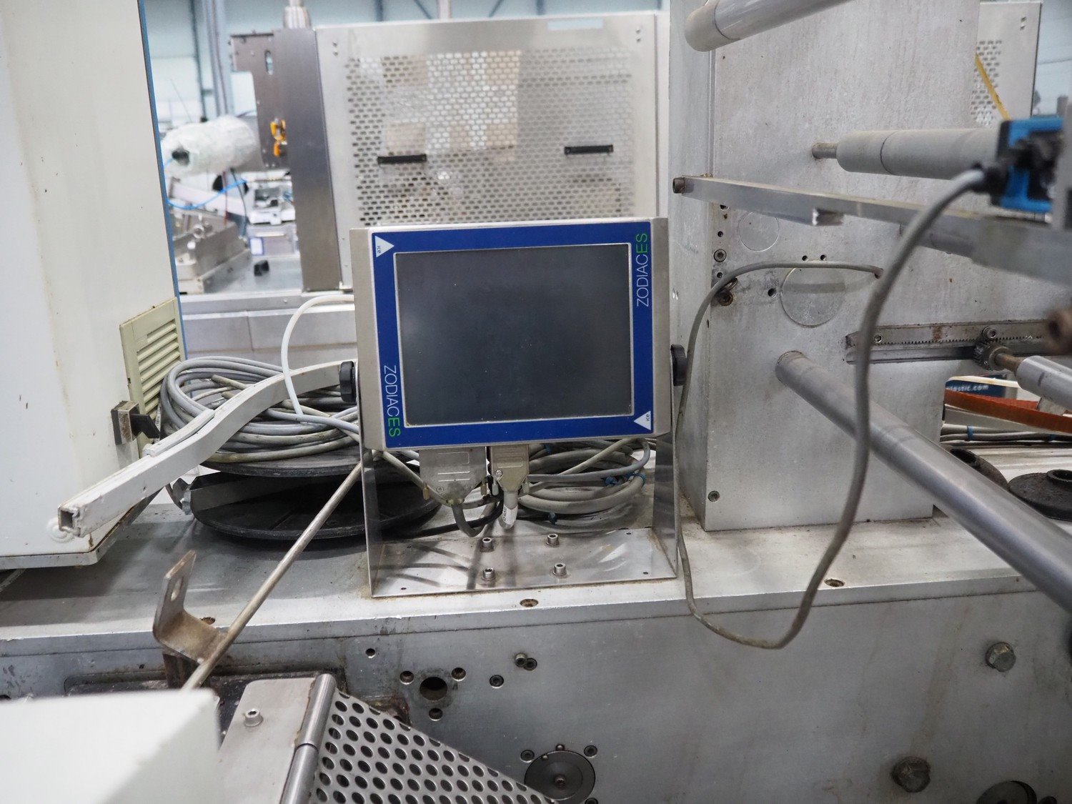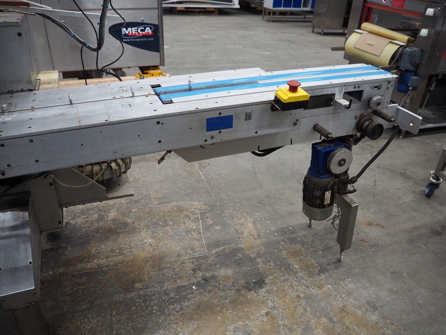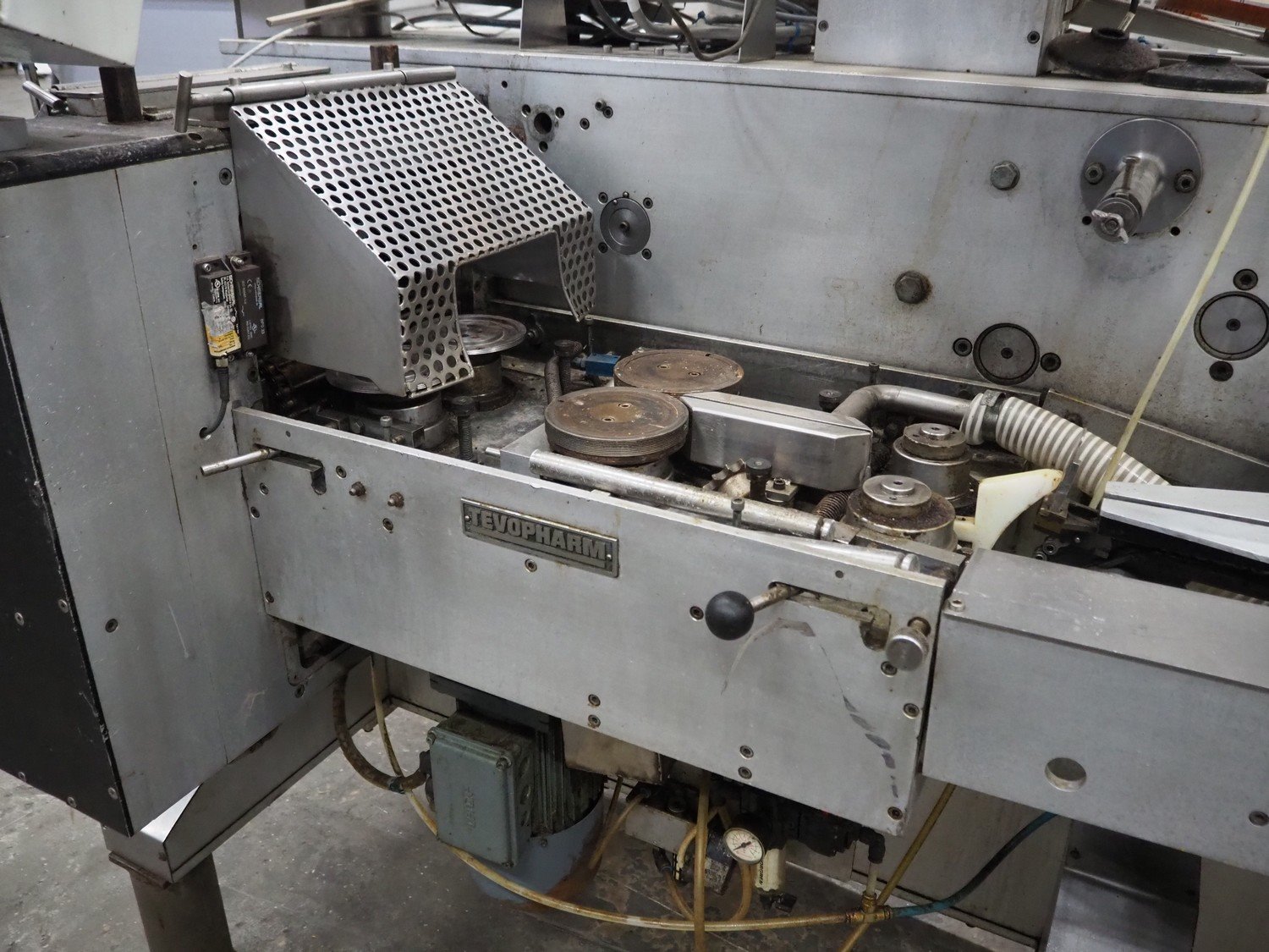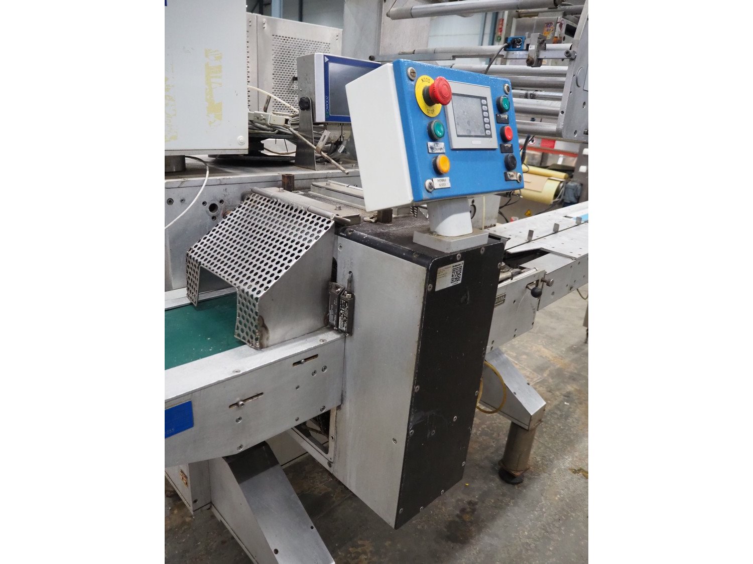 Tevopharm flowpacker with ZodiacES coding attachment, seal width: 190 mm, plastic belt, belt width: 250 mm, total dimensions: 3650 mm x 1150 mm x 2100 mm. Kavel locatie: Schouwrooij 29, 5281 RE Boxtel, Nederland