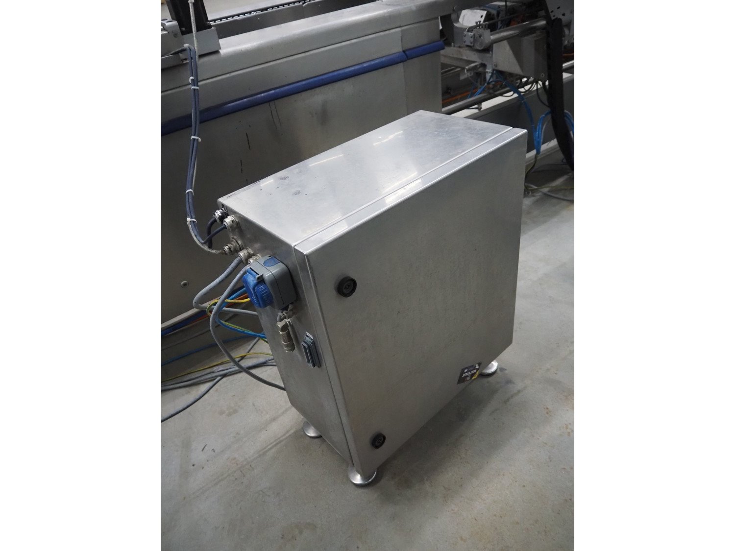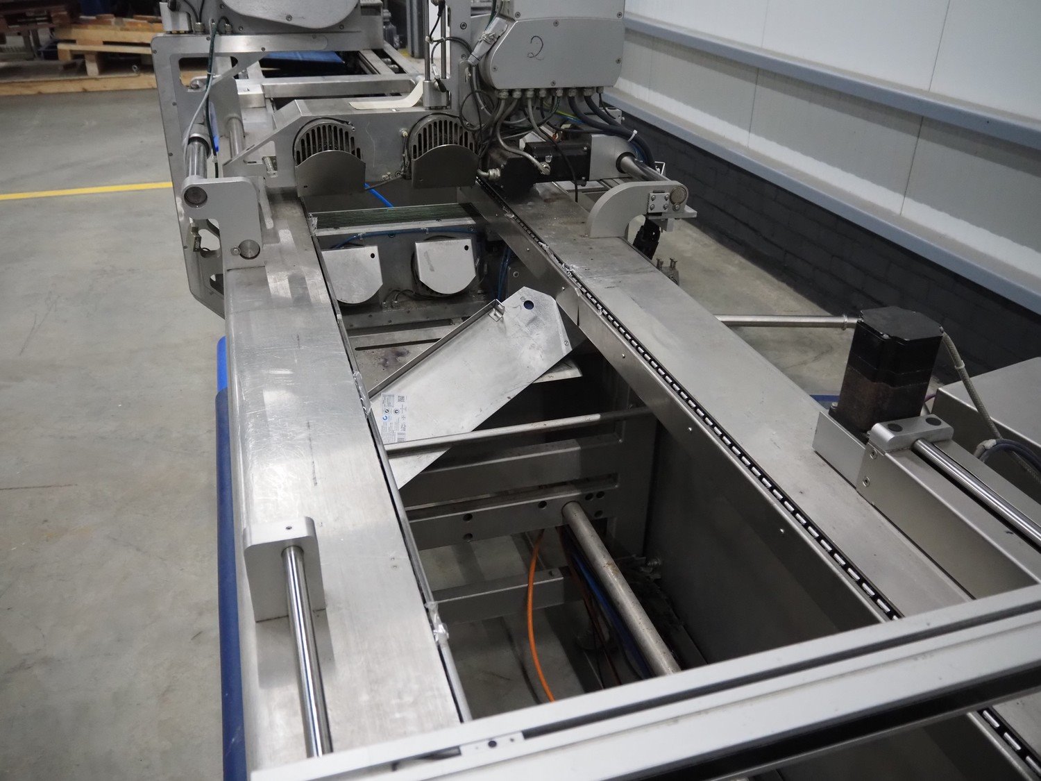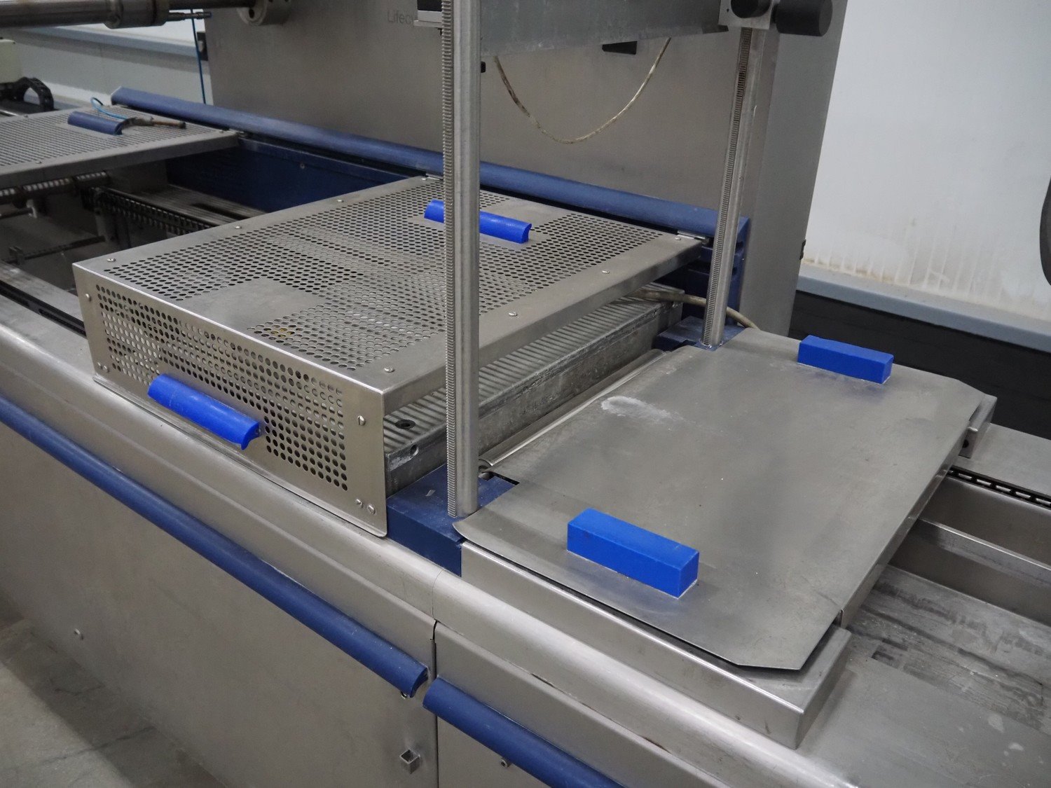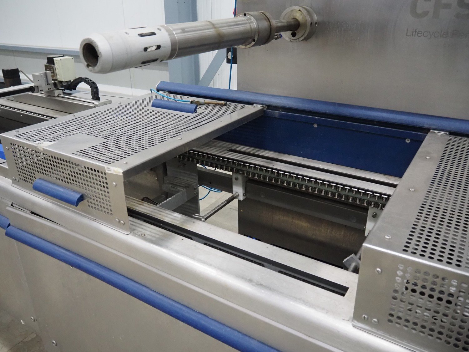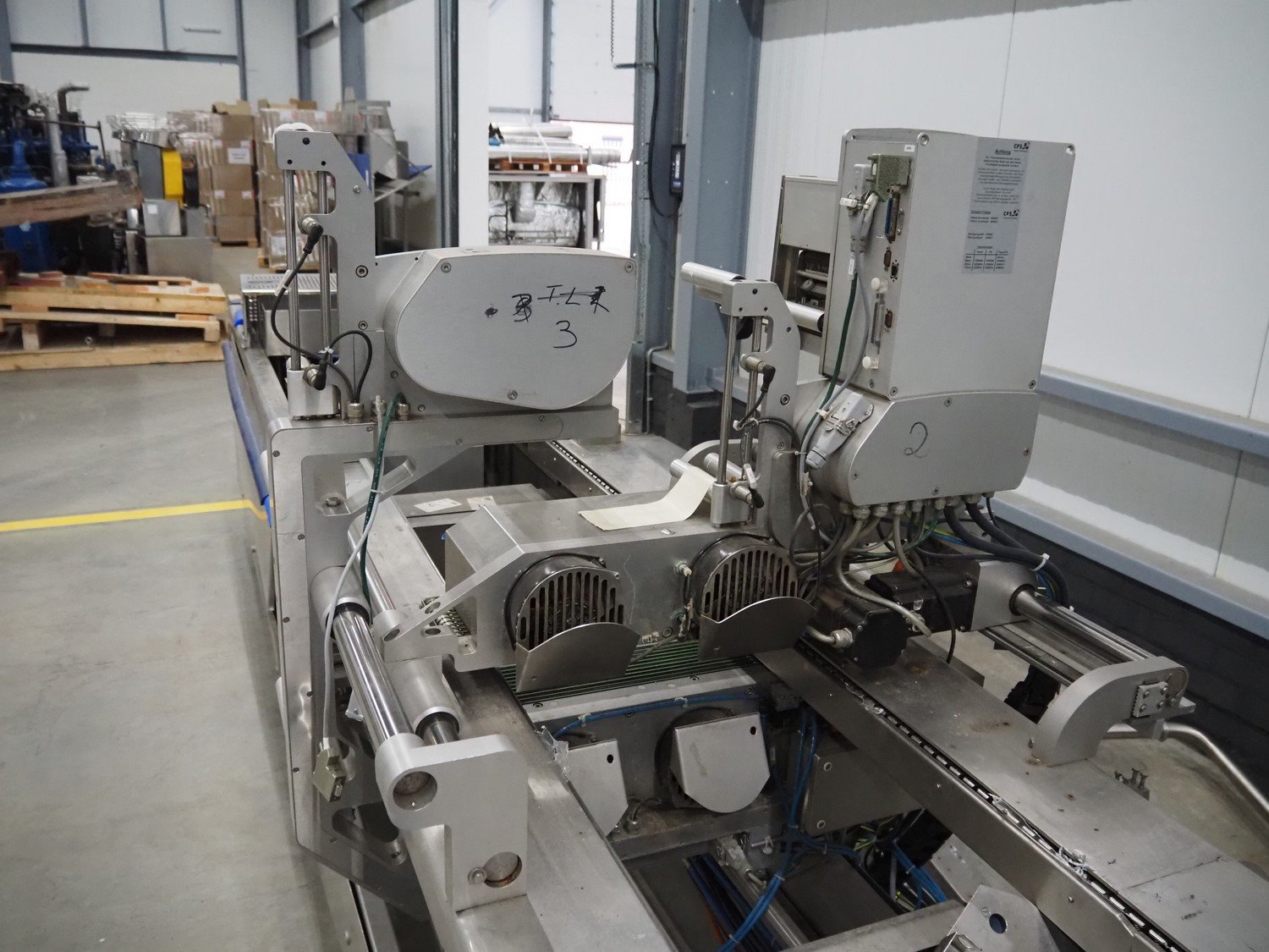 CFS thermoformer, type: EVOLUTION, serial number: 4046100391, year of construction: 2008, 400 V, 3 Ph, 50 Hz, 20 A, 10 kW, film width: 350 mm, dyes: (4x) 300 mm x 90 mm, index: 470 mm, belt width: 430 mm, label width: 85 mm, plastic belt, belt width: 420 mm, total dimensions: 13400 mm x 1300 mm x 2160 mm. Including 5 pallets with machine parts, among others: dyes: (8x) 200 mm x 65 mm, (3x) 255 mm x 130 mm. Transport rollies not included. Kavel locatie: Schouwrooij 29, 5281 RE Boxtel, Nederland