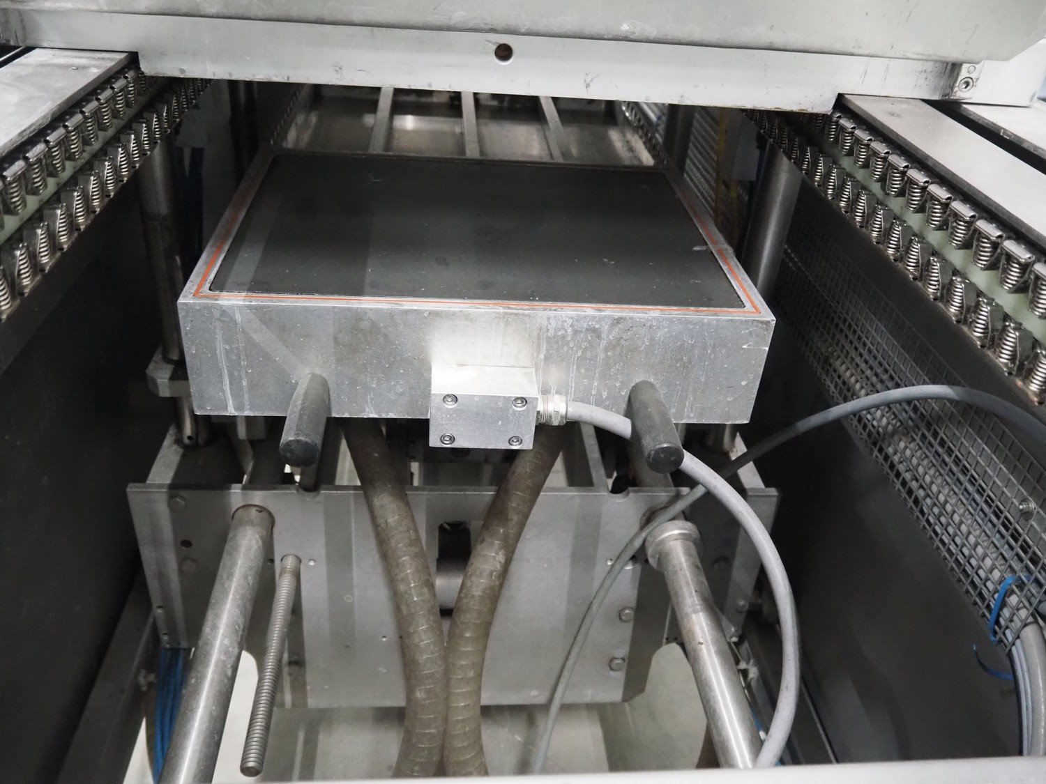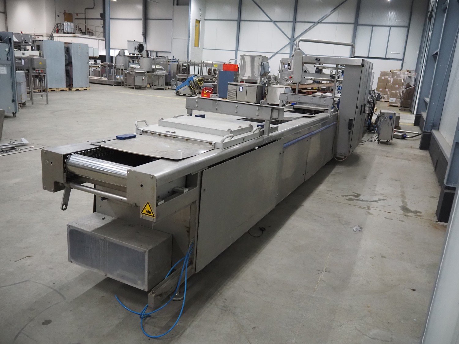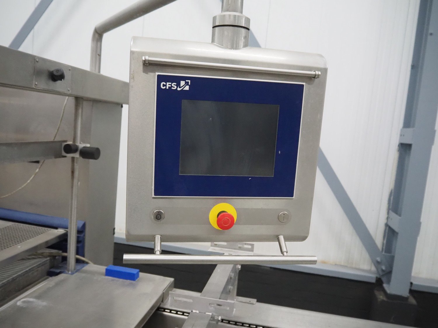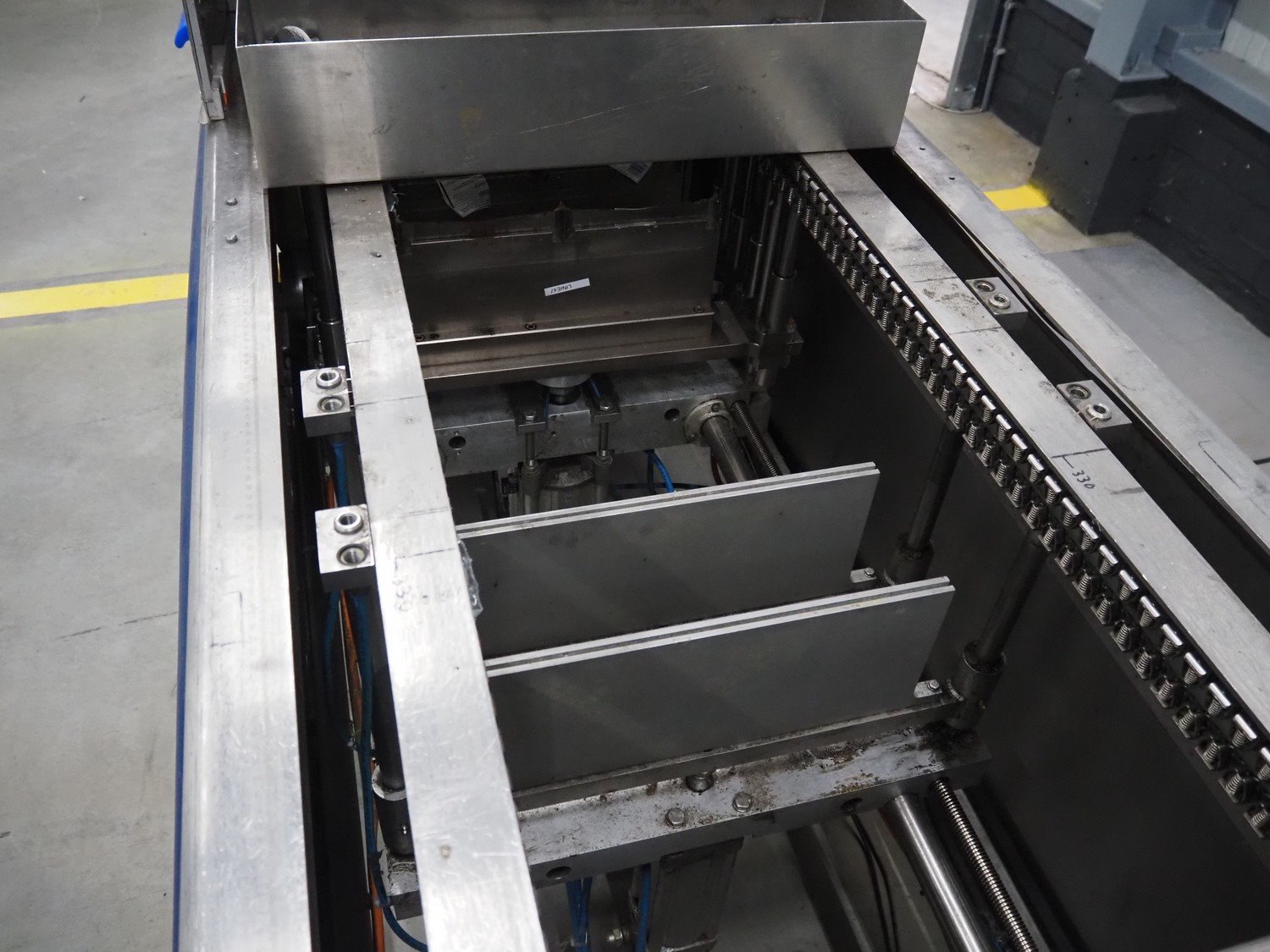 CFS thermoformer, type: EVOLUTION, serial number: 4046100391, year of construction: 2008, 400 V, 3 Ph, 50 Hz, 20 A, 10 kW, film width: 350 mm, dyes: (4x) 300 mm x 90 mm, index: 470 mm, belt width: 430 mm, label width: 85 mm, plastic belt, belt width: 420 mm, total dimensions: 13400 mm x 1300 mm x 2160 mm. Including 5 pallets with machine parts, among others: dyes: (8x) 200 mm x 65 mm, (3x) 255 mm x 130 mm. Transport rollies not included. Kavel locatie: Schouwrooij 29, 5281 RE Boxtel, Nederland