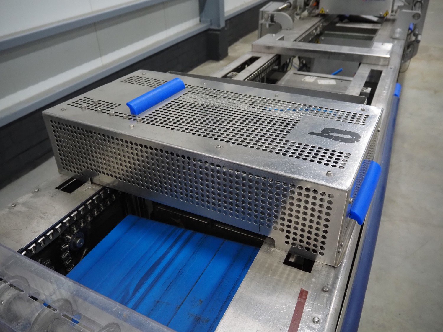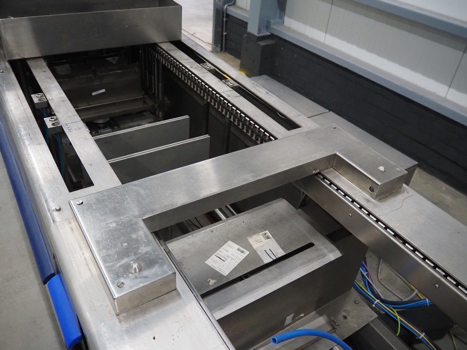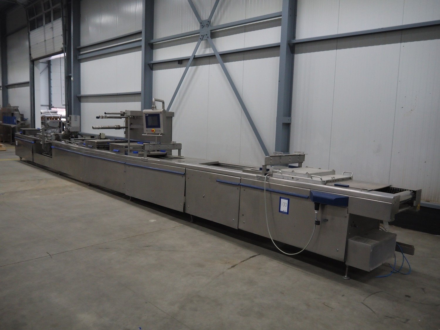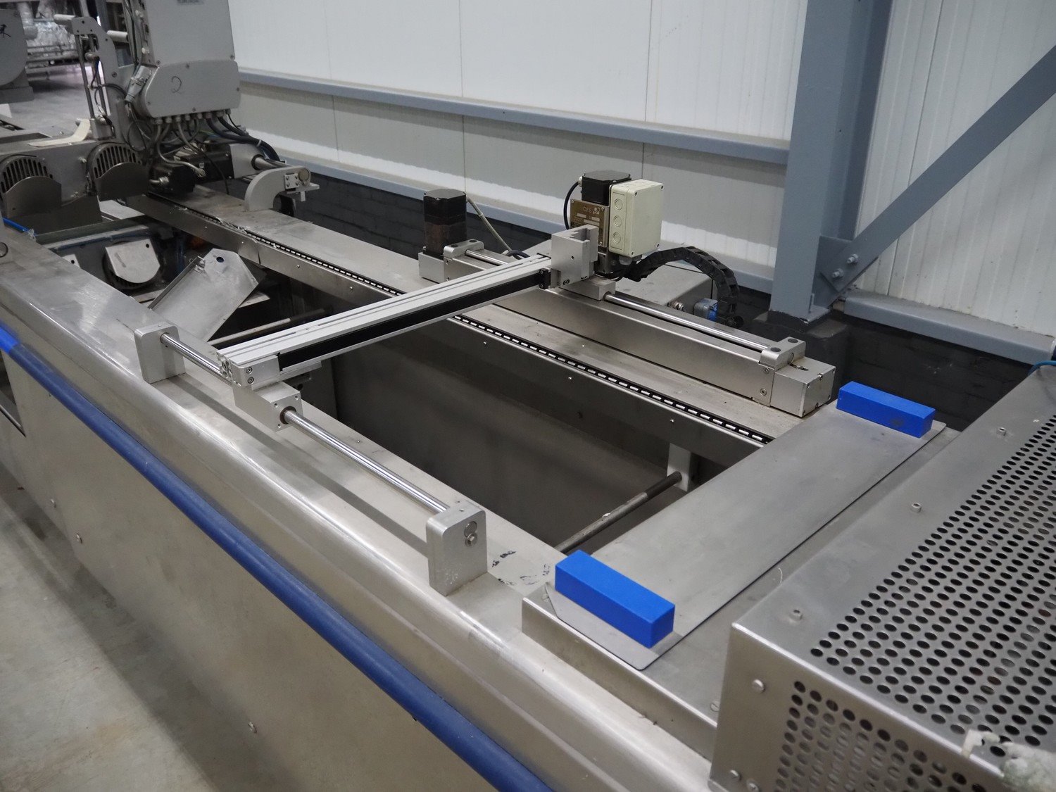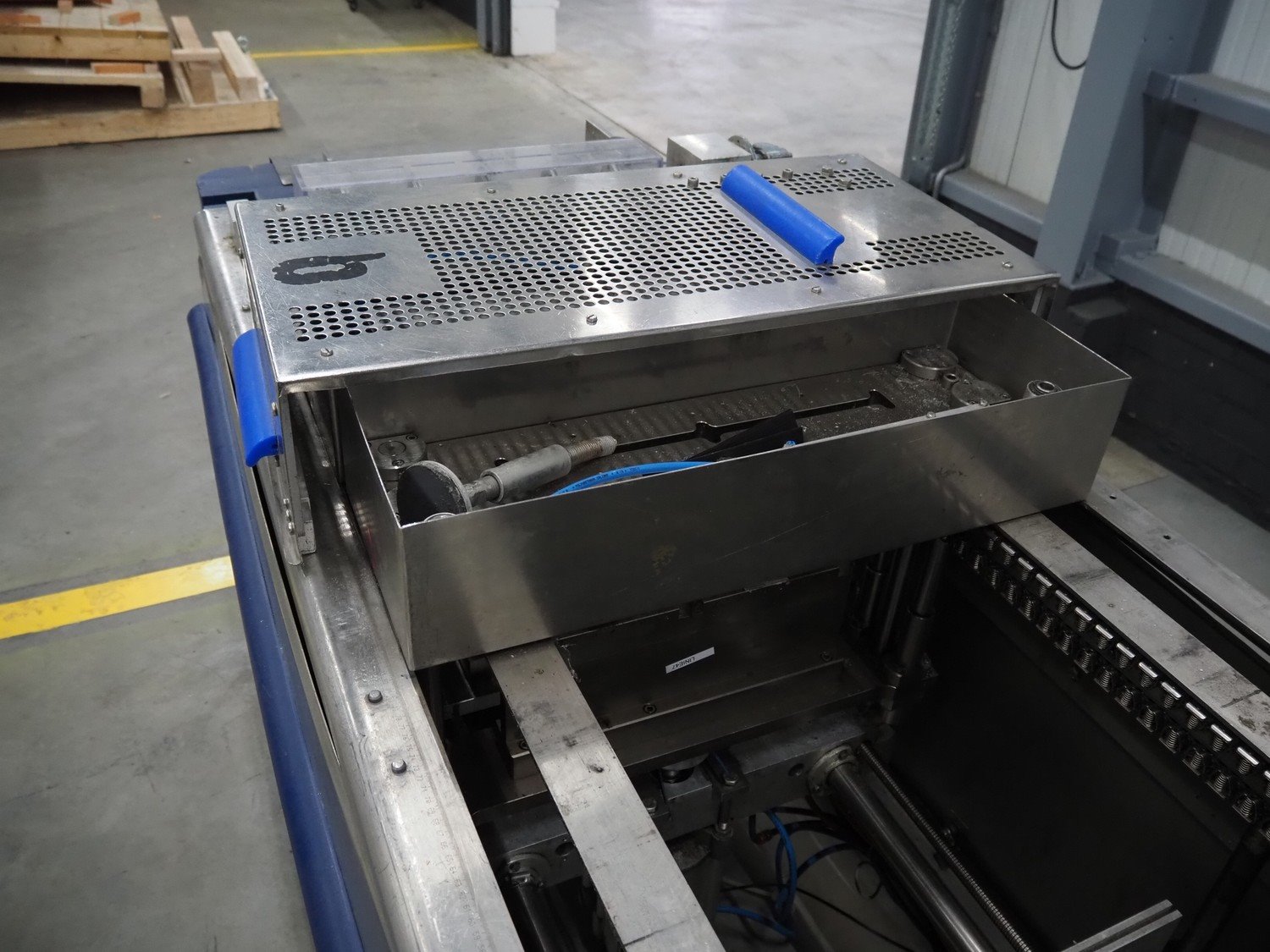 CFS thermoformer, type: EVOLUTION, serial number: 4046100391, year of construction: 2008, 400 V, 3 Ph, 50 Hz, 20 A, 10 kW, film width: 350 mm, dyes: (4x) 300 mm x 90 mm, index: 470 mm, belt width: 430 mm, label width: 85 mm, plastic belt, belt width: 420 mm, total dimensions: 13400 mm x 1300 mm x 2160 mm. Including 5 pallets with machine parts, among others: dyes: (8x) 200 mm x 65 mm, (3x) 255 mm x 130 mm. Transport rollies not included. Kavel locatie: Schouwrooij 29, 5281 RE Boxtel, Nederland