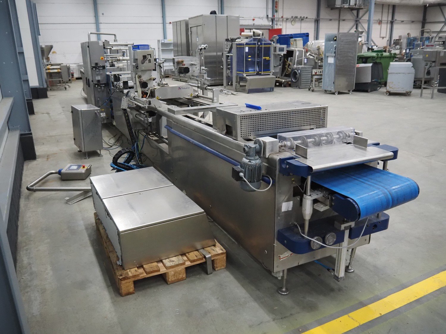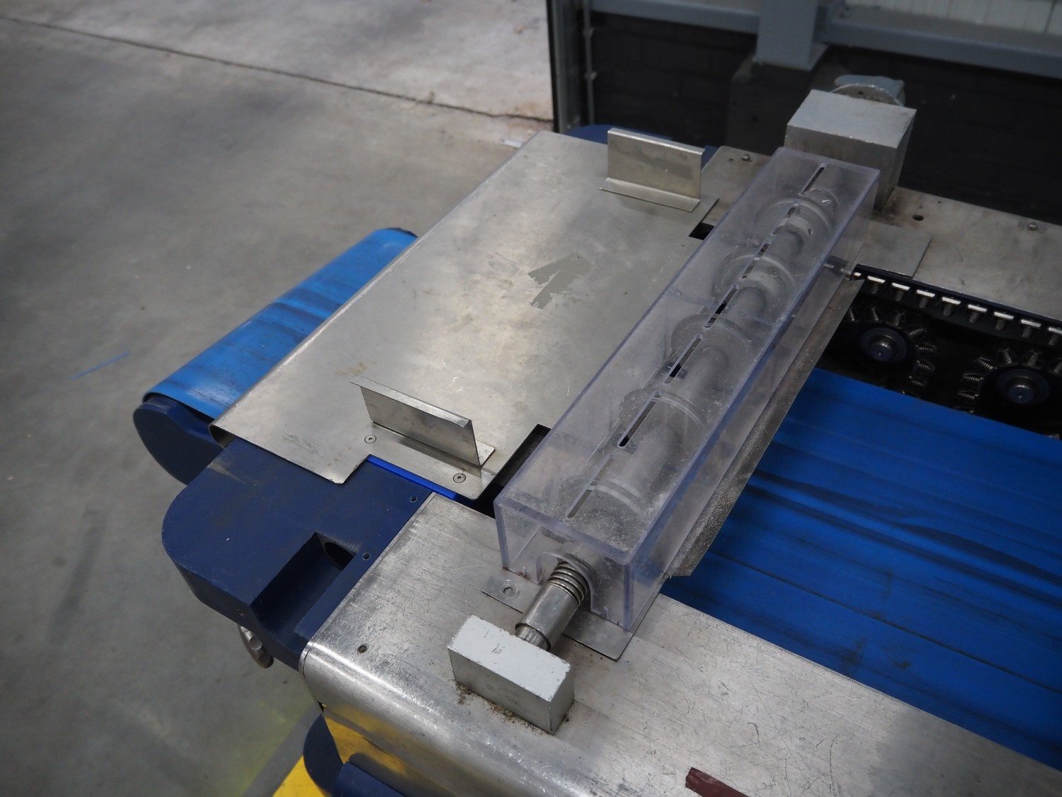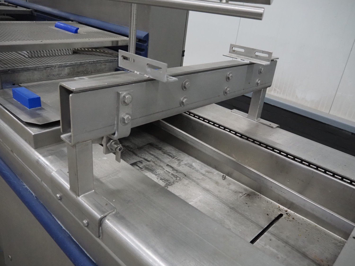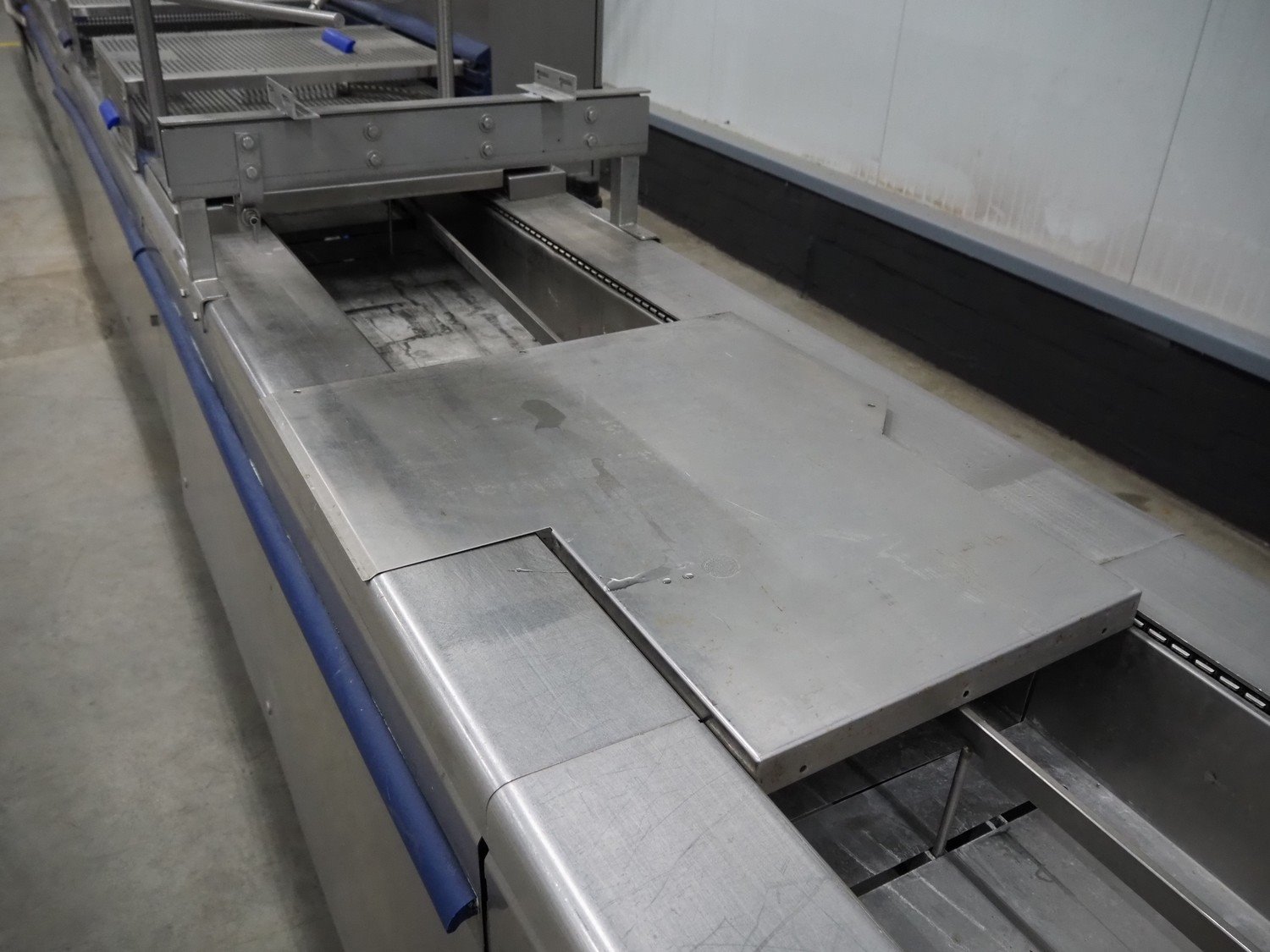 CFS thermoformer, type: EVOLUTION, serial number: 4046100391, year of construction: 2008, 400 V, 3 Ph, 50 Hz, 20 A, 10 kW, film width: 350 mm, dyes: (4x) 300 mm x 90 mm, index: 470 mm, belt width: 430 mm, label width: 85 mm, plastic belt, belt width: 420 mm, total dimensions: 13400 mm x 1300 mm x 2160 mm. Including 5 pallets with machine parts, among others: dyes: (8x) 200 mm x 65 mm, (3x) 255 mm x 130 mm. Transport rollies not included. Kavel locatie: Schouwrooij 29, 5281 RE Boxtel, Nederland