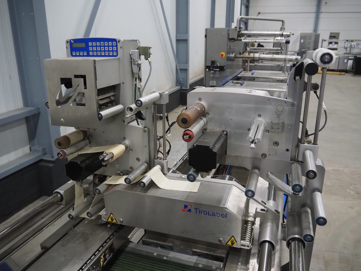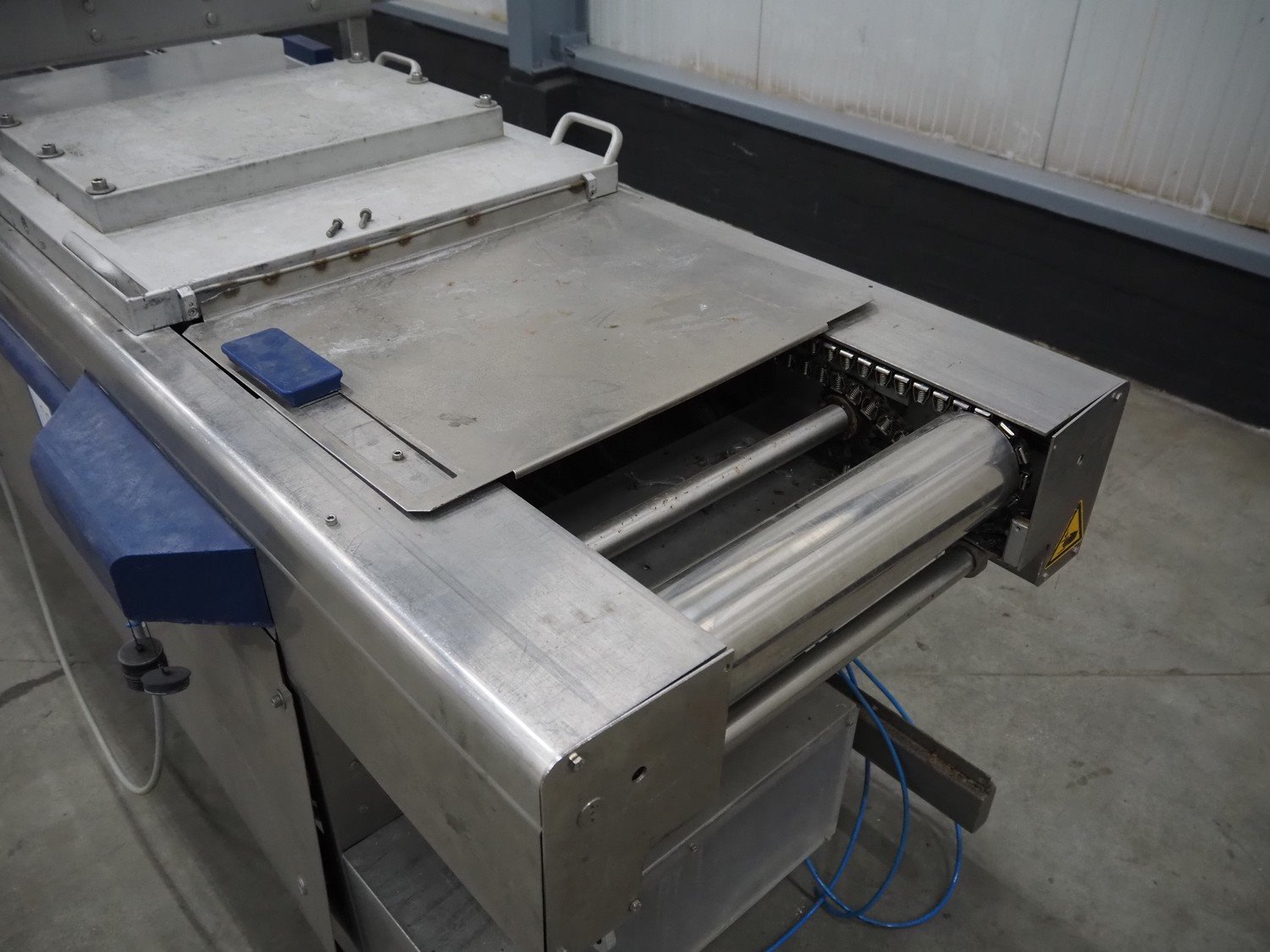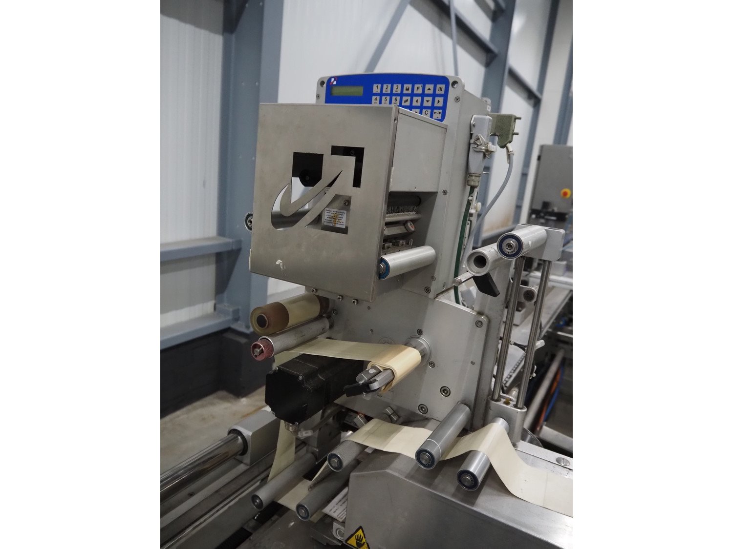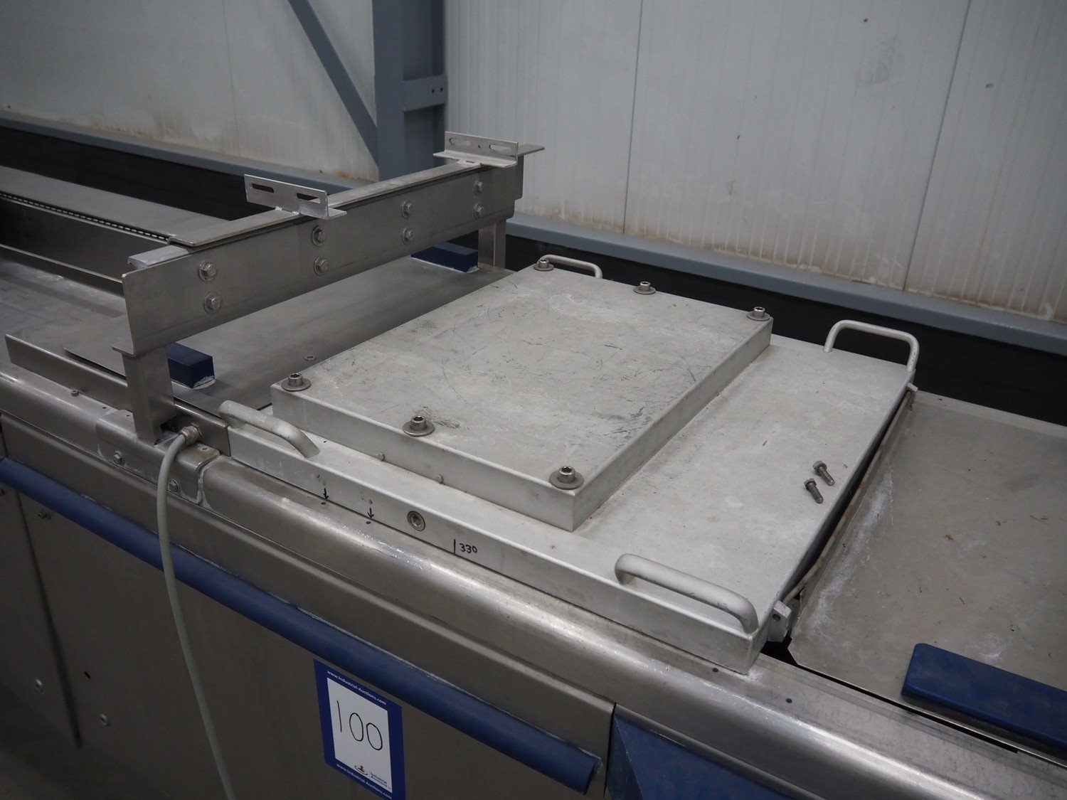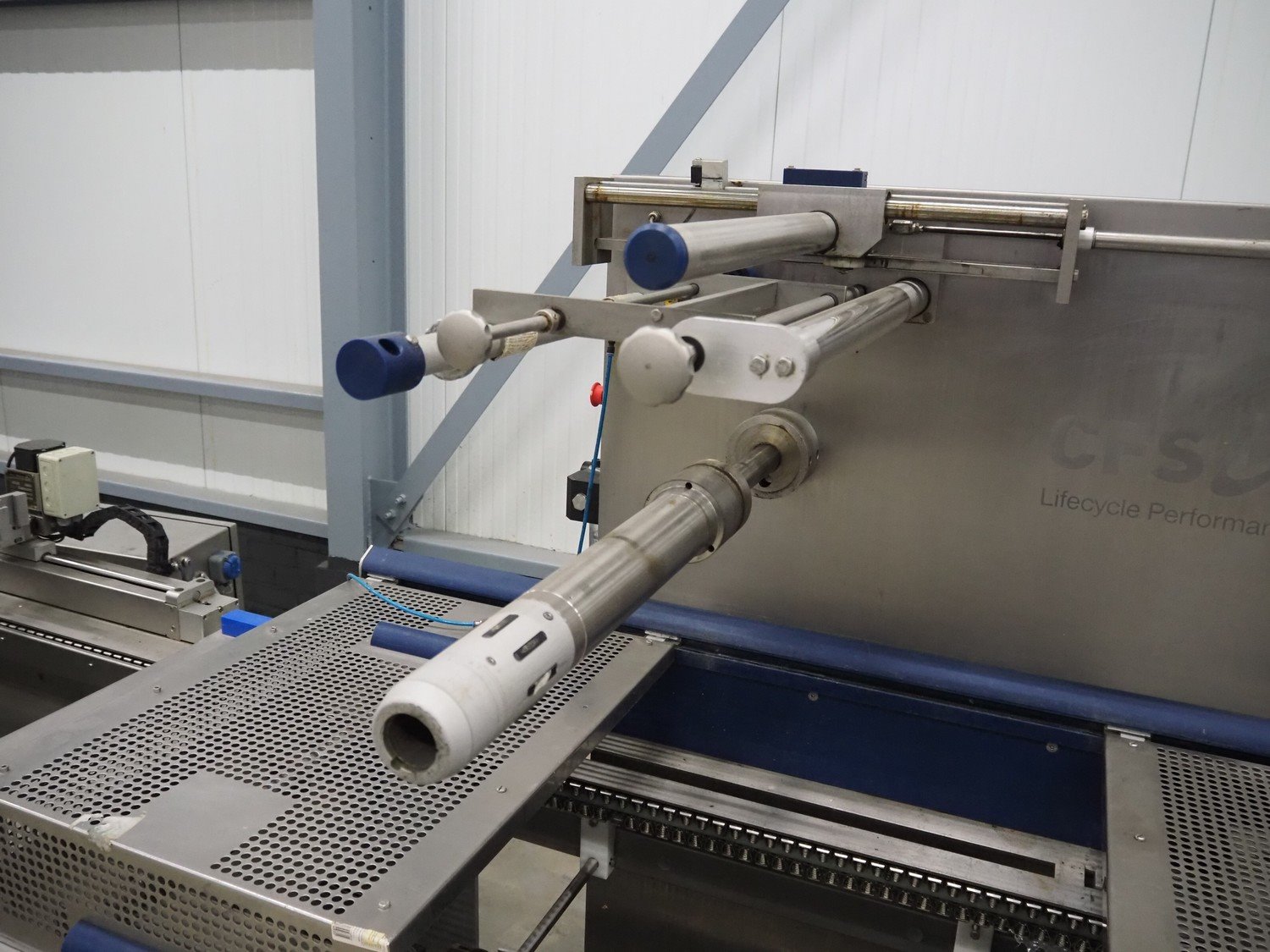 CFS thermoformer, type: EVOLUTION, serial number: 4046100391, year of construction: 2008, 400 V, 3 Ph, 50 Hz, 20 A, 10 kW, film width: 350 mm, dyes: (4x) 300 mm x 90 mm, index: 470 mm, belt width: 430 mm, label width: 85 mm, plastic belt, belt width: 420 mm, total dimensions: 13400 mm x 1300 mm x 2160 mm. Including 5 pallets with machine parts, among others: dyes: (8x) 200 mm x 65 mm, (3x) 255 mm x 130 mm. Transport rollies not included. Kavel locatie: Schouwrooij 29, 5281 RE Boxtel, Nederland