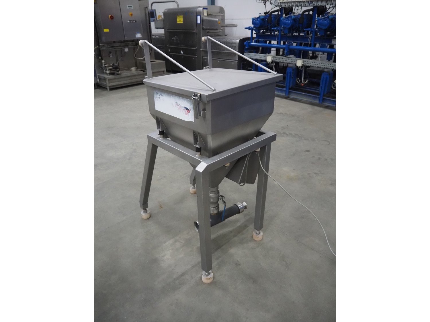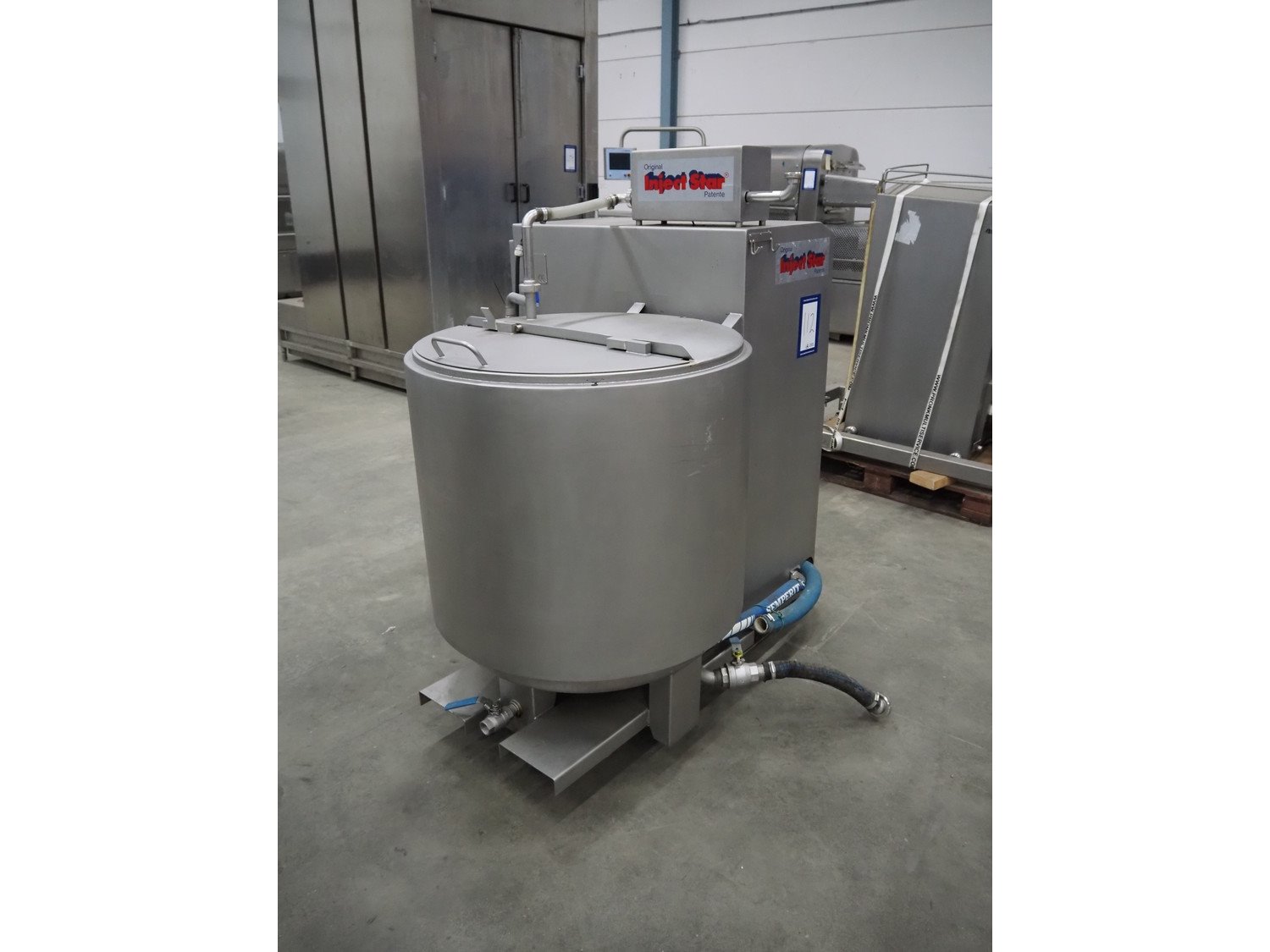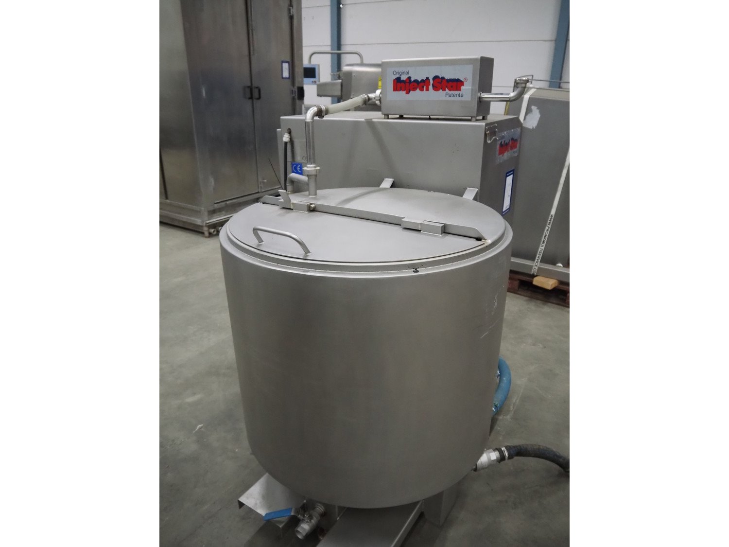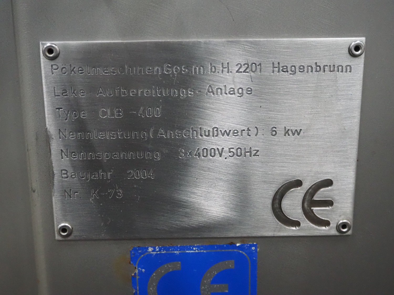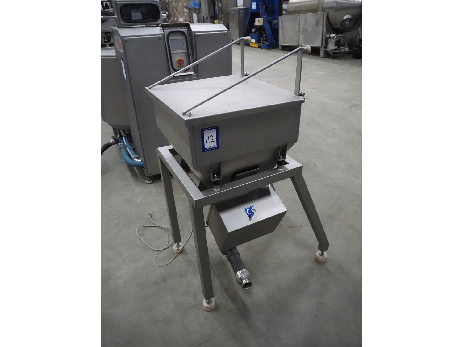 Pökelmaschinen Ges.m.b.H. brine mixer, type: CLB-400, number: K-73, year of construction: 2004, 400 V, 3 Ph, 50 Hz, 6 kW, volume: 400 liter, total dimensions: 1550 mm x 1250 mm x 1600 mm, including Pökelmaschinen Ges.m.b.H s/s infeed bunker for brine mixer, inside dimensions: 530 mm x 490 mm x 200 mm, total dimensions: 900 mm x 730 mm x 1420 mm. Kavel locatie: Schouwrooij 29, 5281 RE Boxtel, Nederland