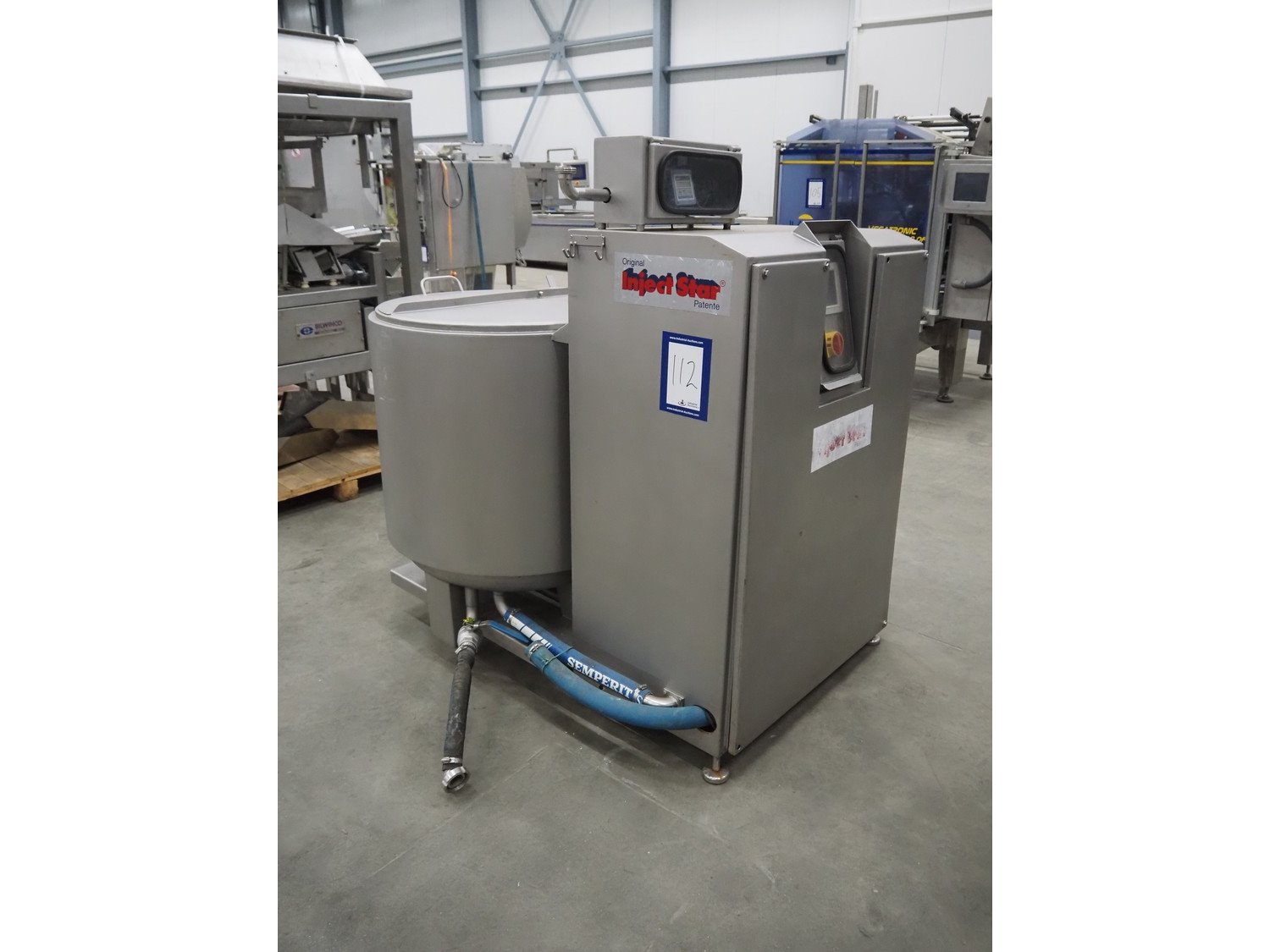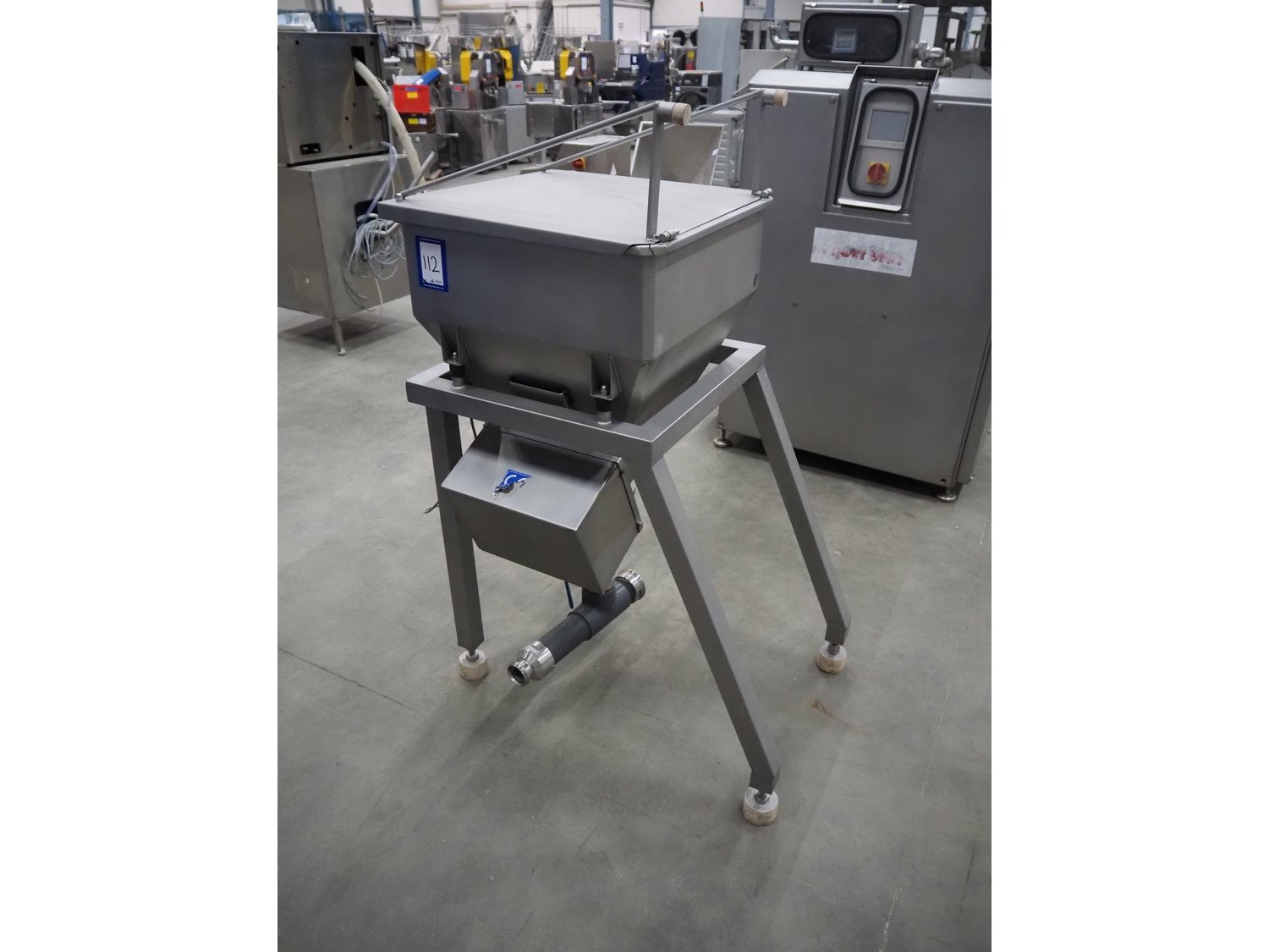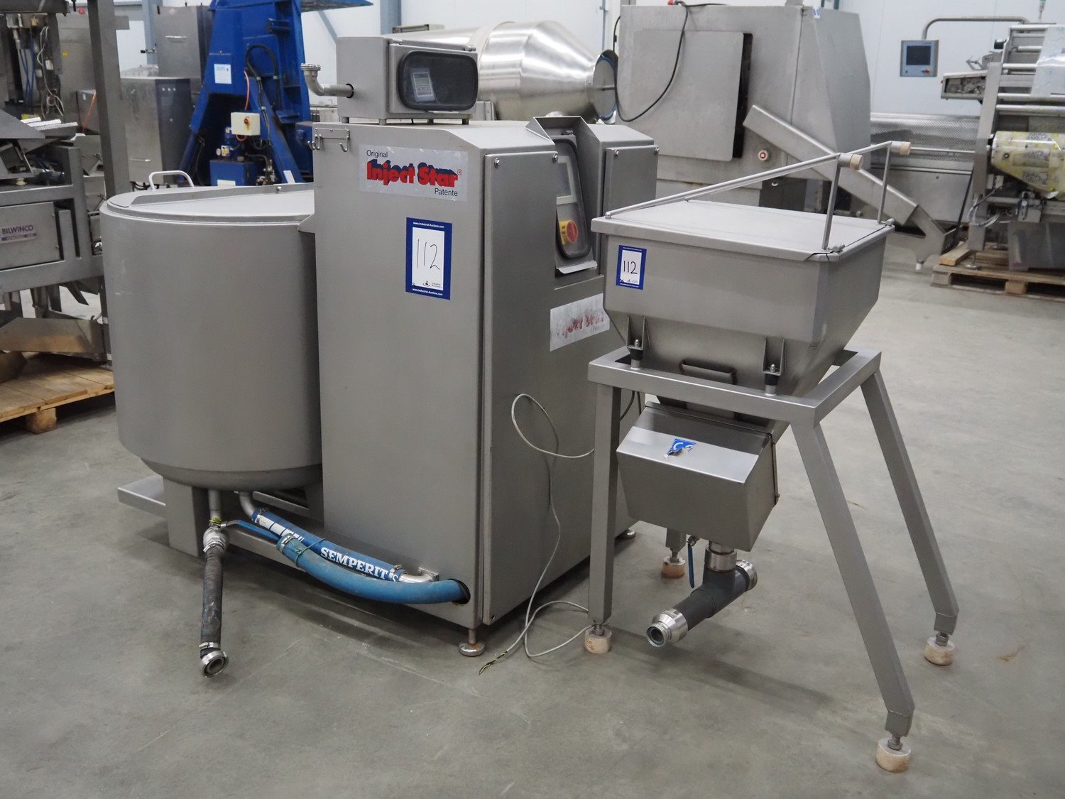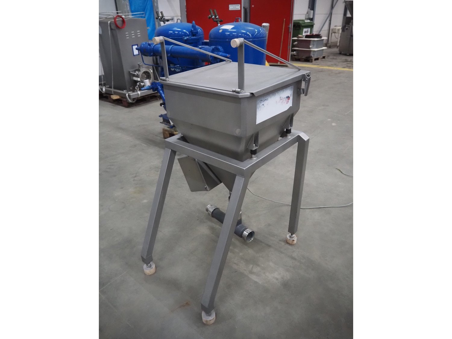 Pökelmaschinen Ges.m.b.H. brine mixer, type: CLB-400, number: K-73, year of construction: 2004, 400 V, 3 Ph, 50 Hz, 6 kW, volume: 400 liter, total dimensions: 1550 mm x 1250 mm x 1600 mm, including Pökelmaschinen Ges.m.b.H s/s infeed bunker for brine mixer, inside dimensions: 530 mm x 490 mm x 200 mm, total dimensions: 900 mm x 730 mm x 1420 mm. Kavel locatie: Schouwrooij 29, 5281 RE Boxtel, Nederland