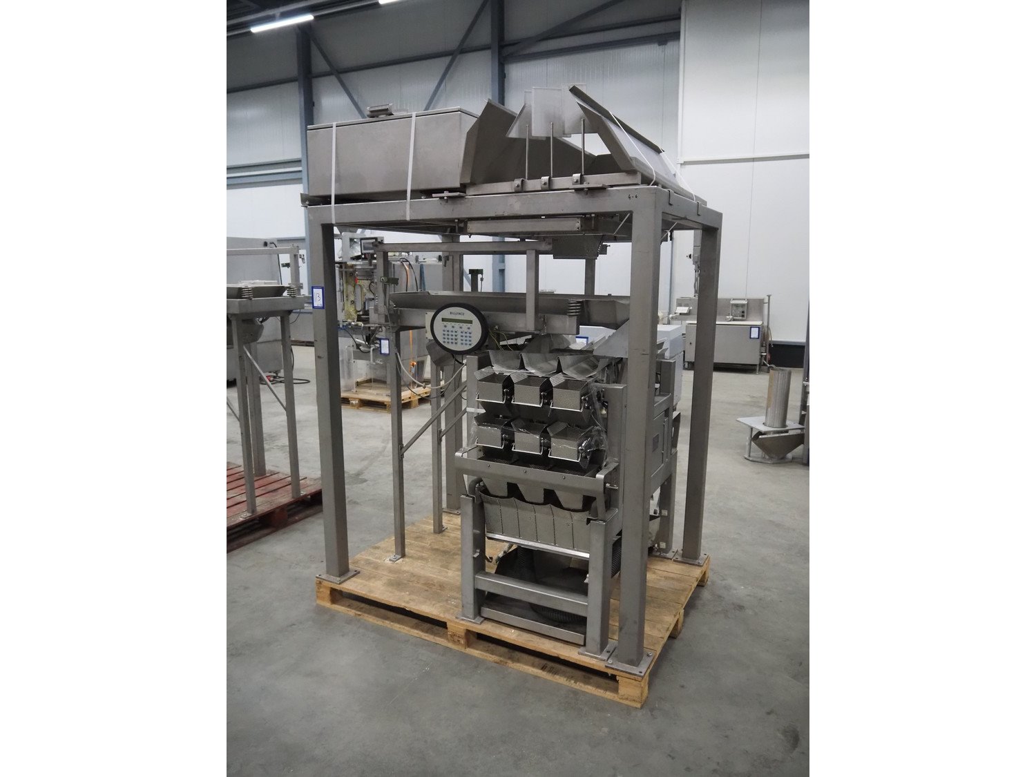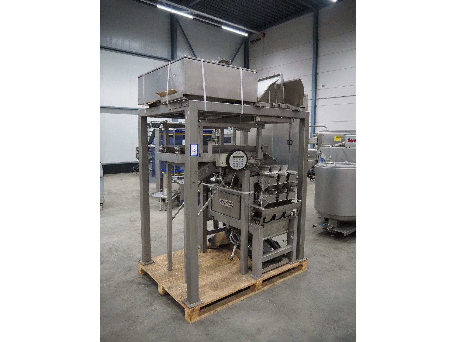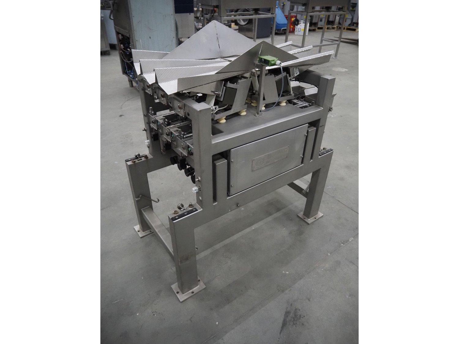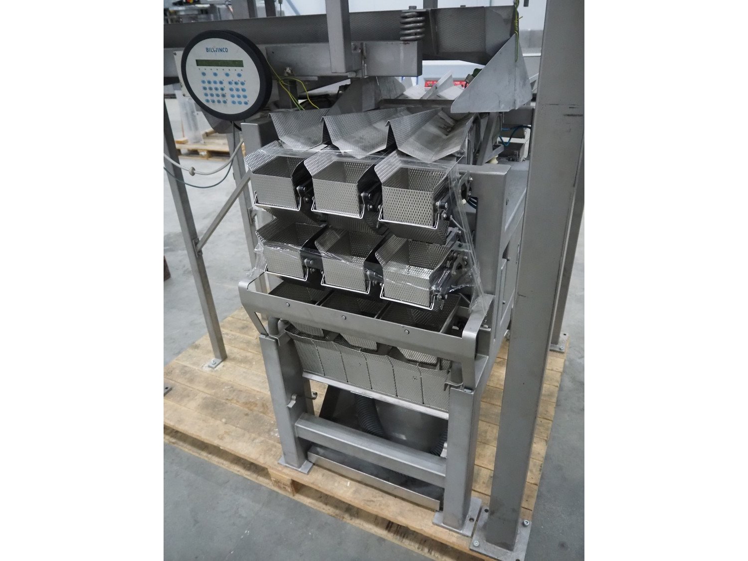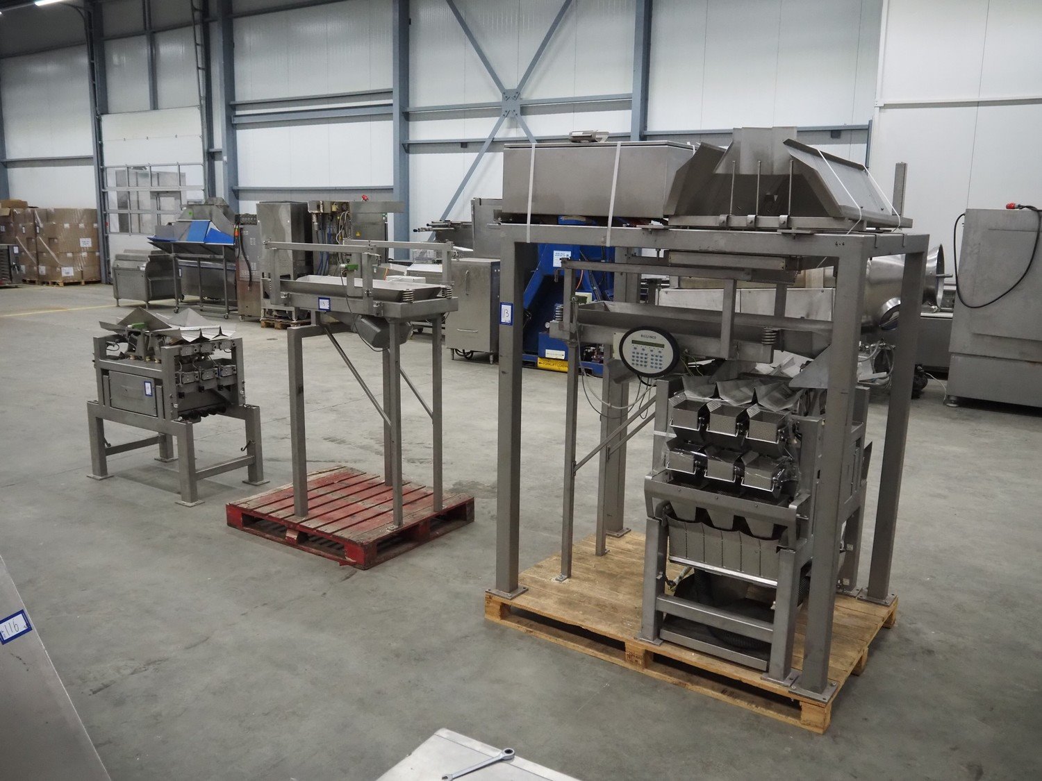 Bilwinco linear weigher consisting of: 2 6-lanes linear weighers, lane width: 120 mm, total dimensions: (2x) 1200 mm x 700 mm x 1300 mm, 2 vibrating gutters, gutter width: 350 mm, total dimensions: (2x) 1300 mm x 700 mm x 1600 mm, s/s frame with infeed hopper and switch cabinet, dimensions: 1600 mm x 1100 mm x 1750 mm. 1 weigher is incomplete. Kavel locatie: Schouwrooij 29, 5281 RE Boxtel, Nederland