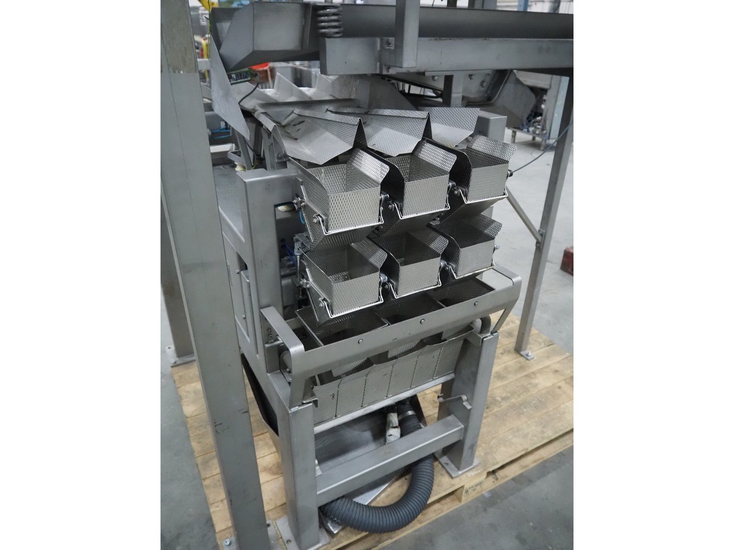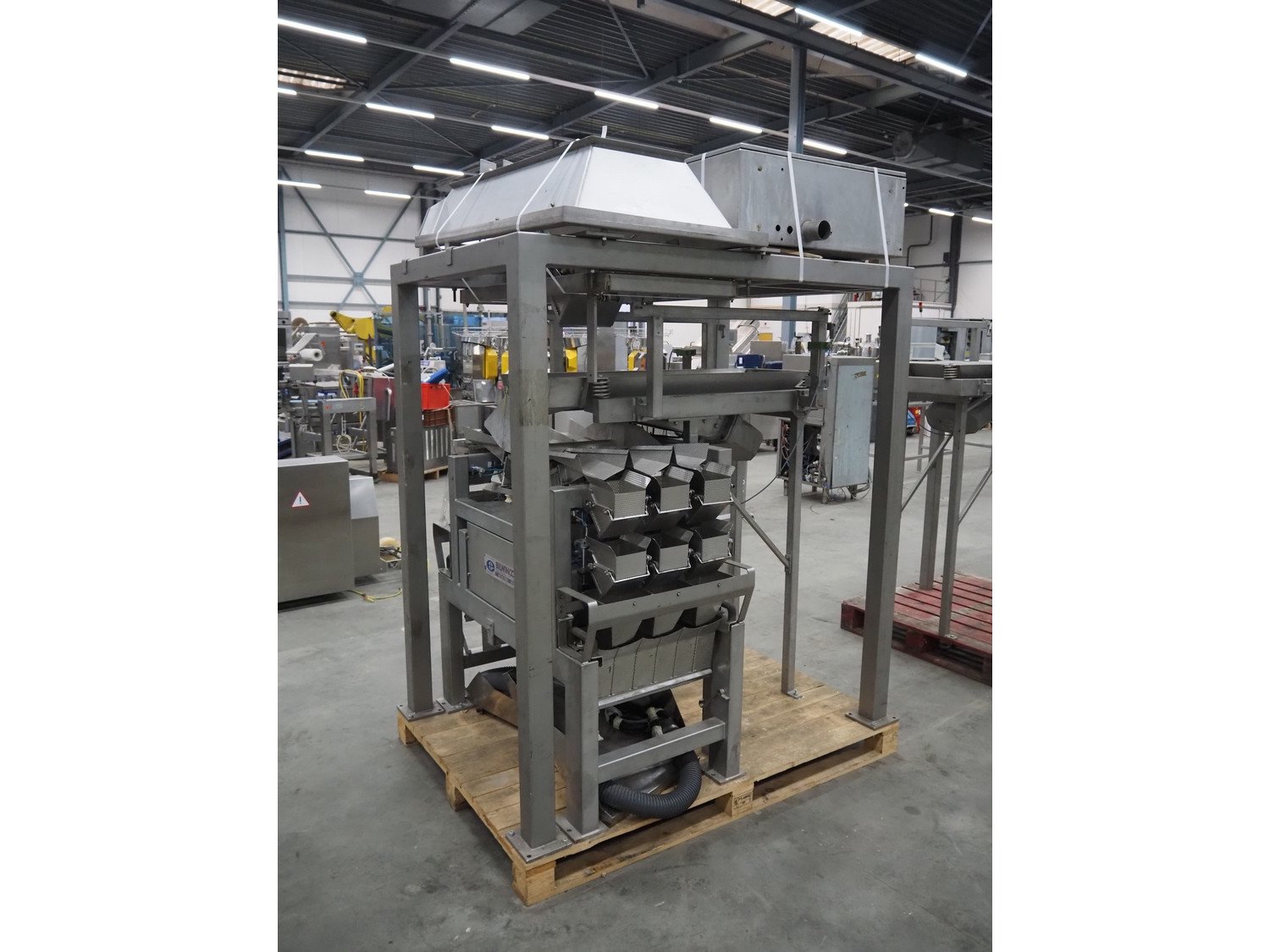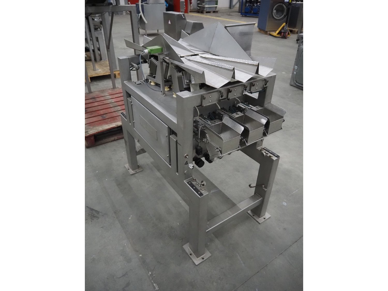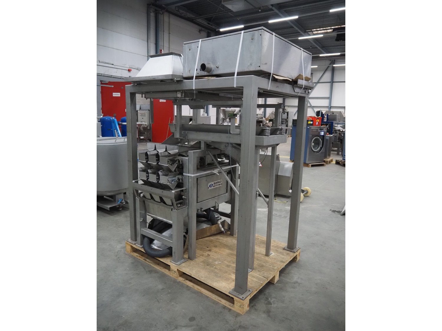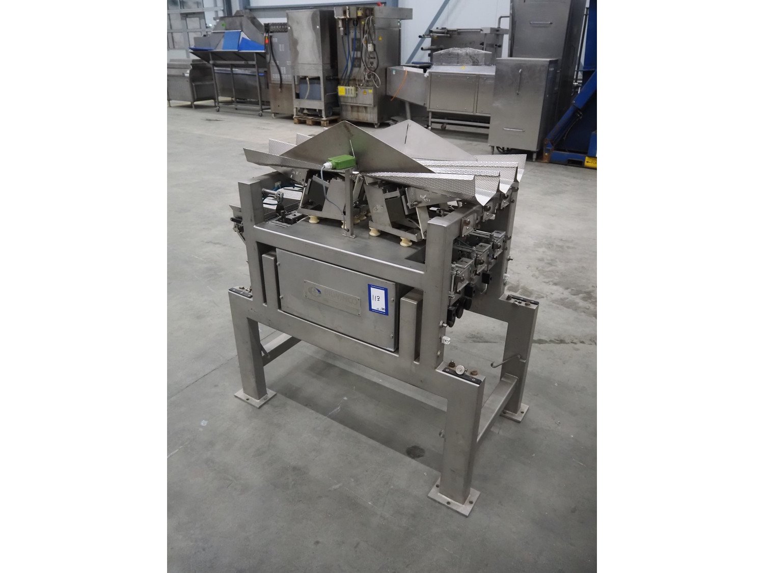 Bilwinco linear weigher consisting of: 2 6-lanes linear weighers, lane width: 120 mm, total dimensions: (2x) 1200 mm x 700 mm x 1300 mm, 2 vibrating gutters, gutter width: 350 mm, total dimensions: (2x) 1300 mm x 700 mm x 1600 mm, s/s frame with infeed hopper and switch cabinet, dimensions: 1600 mm x 1100 mm x 1750 mm. 1 weigher is incomplete. Kavel locatie: Schouwrooij 29, 5281 RE Boxtel, Nederland