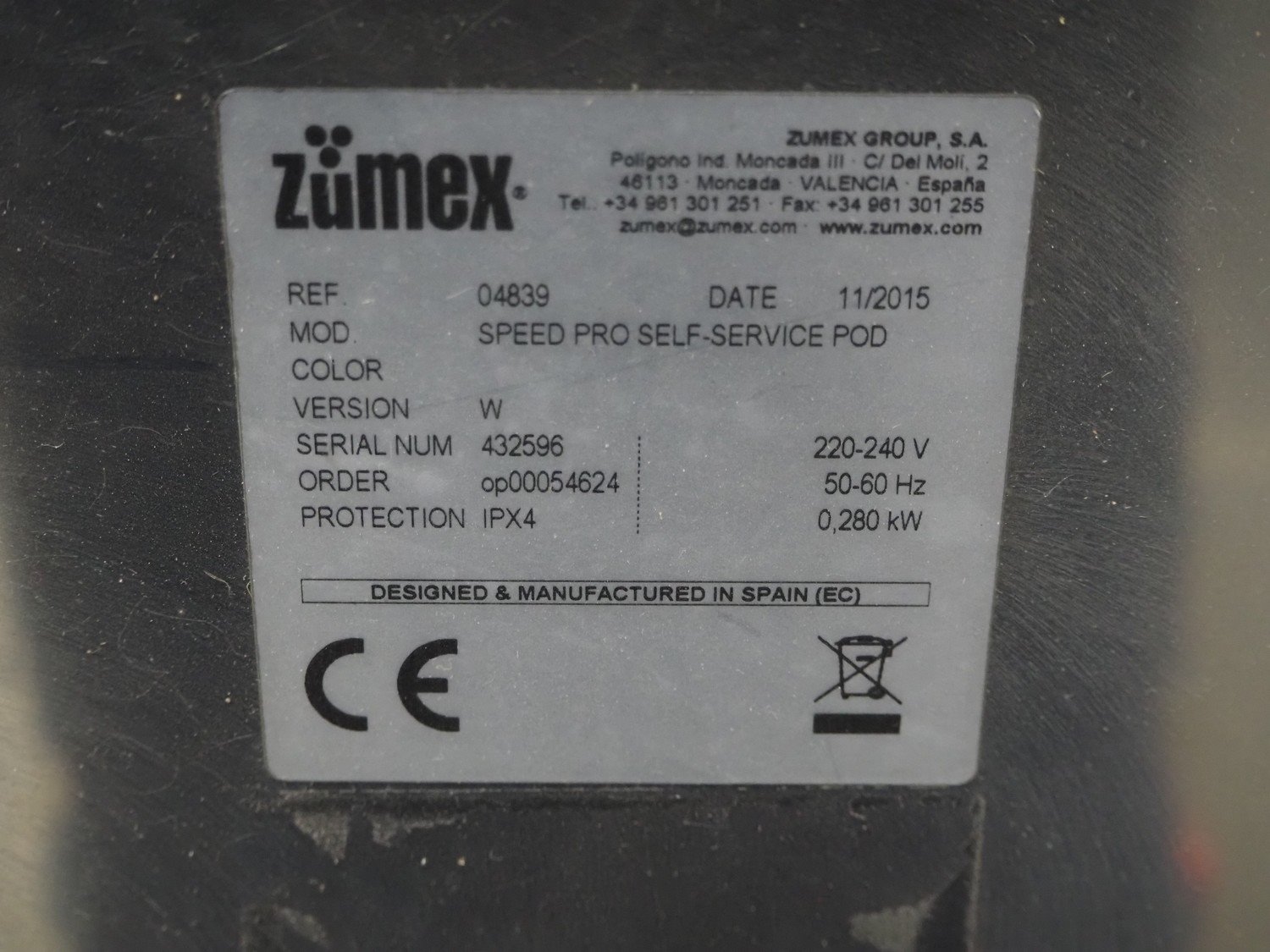 Zumex mobile juicer, model: SPEED PRO SELF-SERVICE, serial number: 432596, year of construction: 11-2015, 220/240 V, 50/60 Hz, 0.280 kW, dimensions: 700 mm x 680 mm x 1750 mm. Kavel locatie: Schouwrooij 29, 5281 RE Boxtel, Nederland